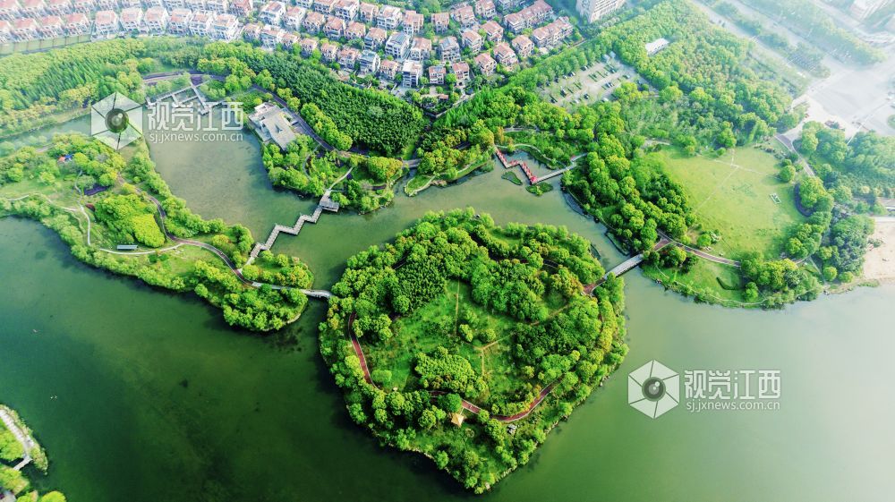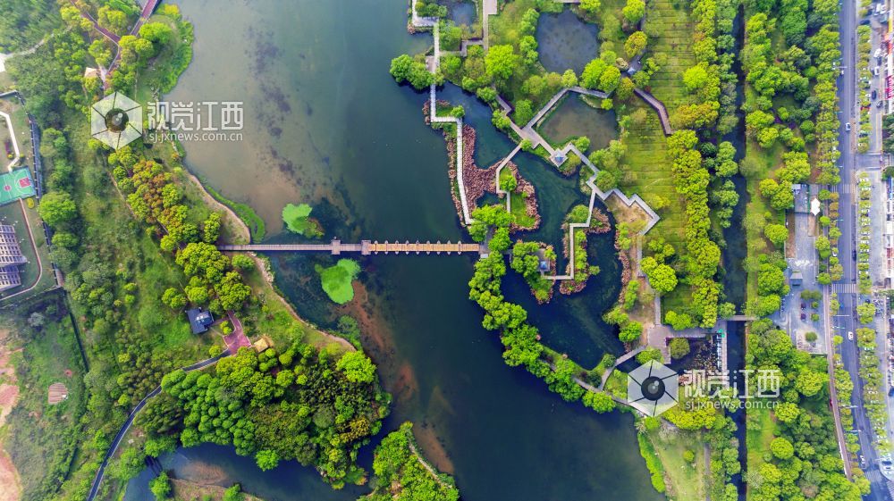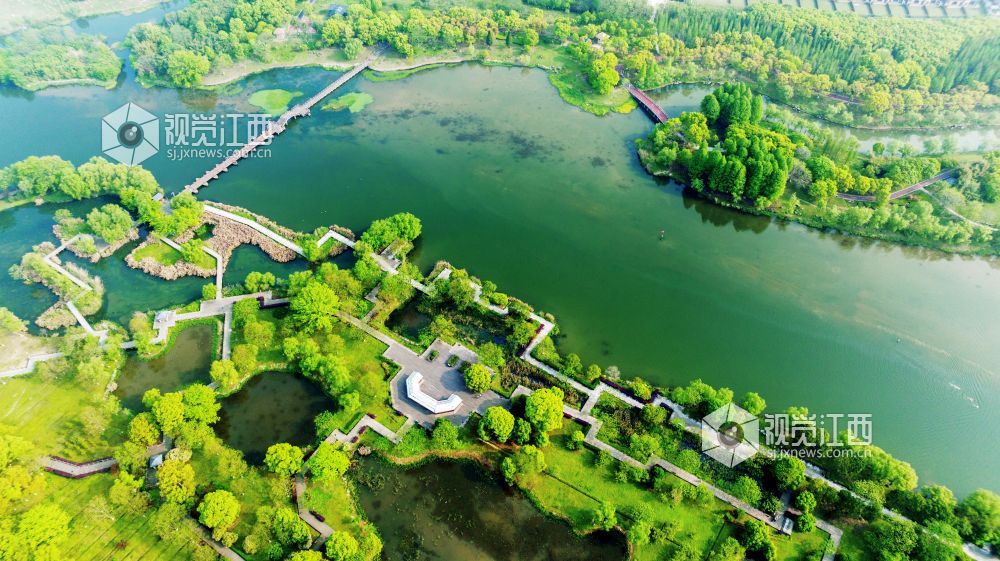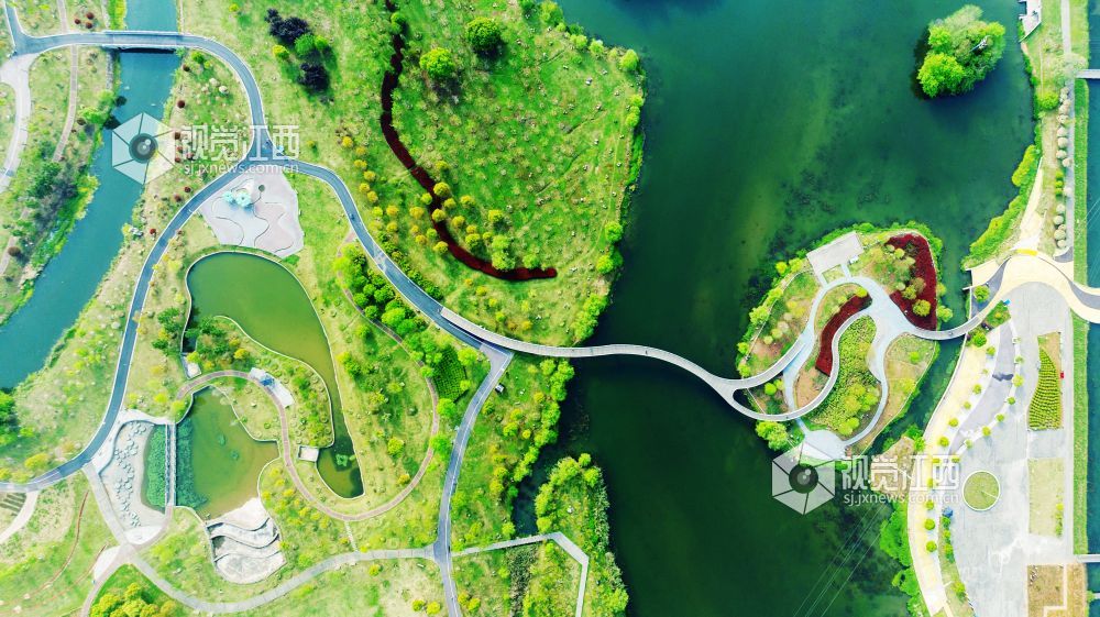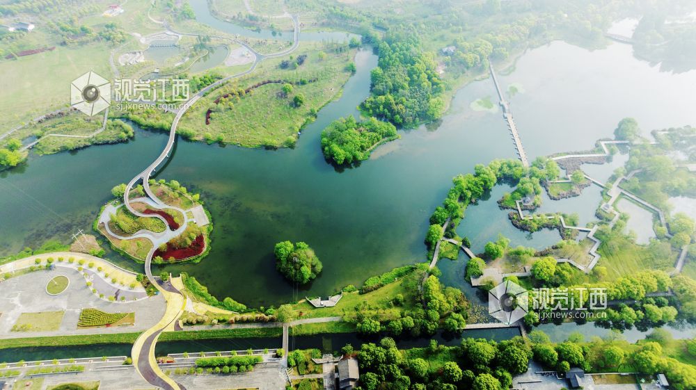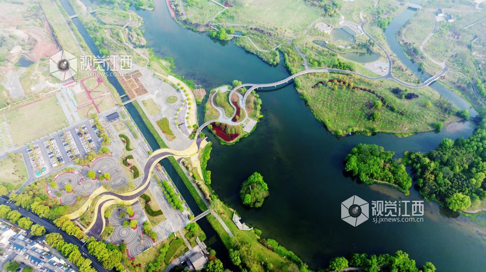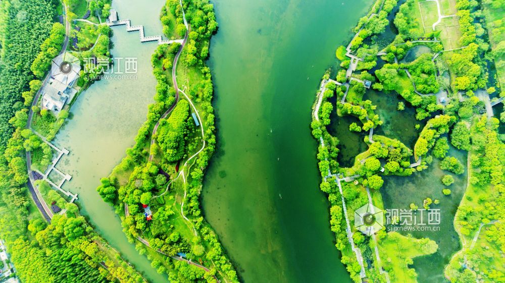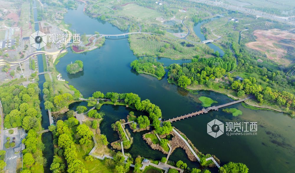4月11日,俯瞰江西省新余市孔目江国家湿地公园,只见一道道风景连着栈道,一条条栈道连着栈桥,一座座栈桥、浮桥连着岛屿,呈现出别样的线条之美,市民在水清、河畅、岸绿、景美的湿地公园乐享春日时光。