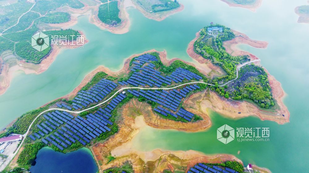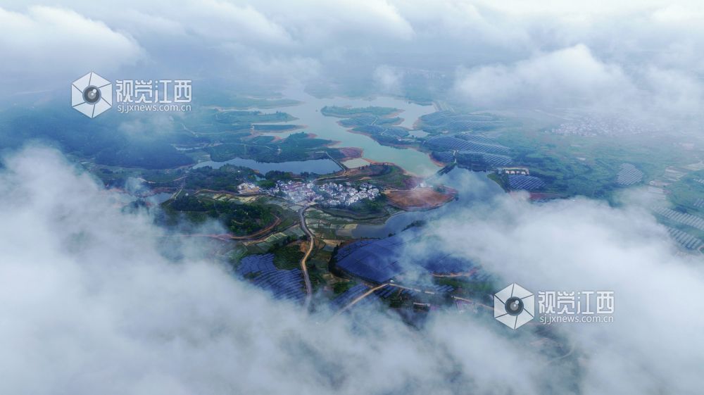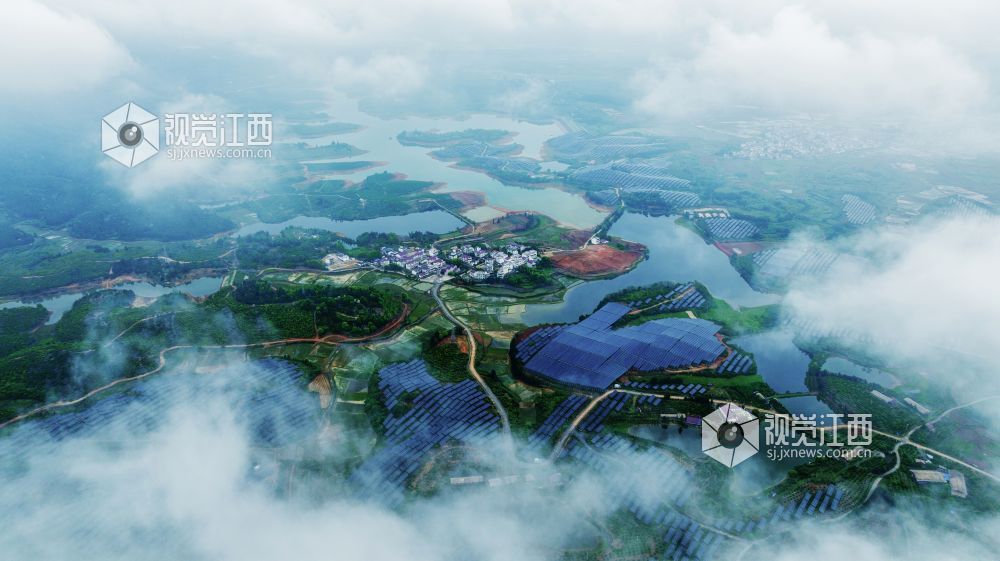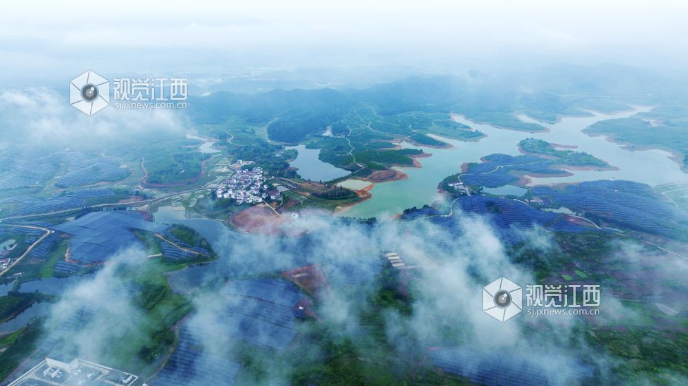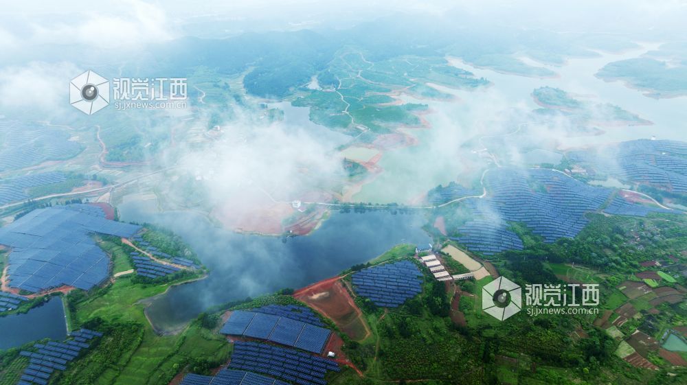 4月20日,俯瞰位于江西省新余市高新区马洪办事处的竹元光伏发电基地,天空云雾缭绕,蓝色的光伏发电板、碧绿的湖水、连绵起伏的山峦、错落有致的村庄、纵横交错的乡间小道在云雾中勿隐勿现,构成了一幅美丽的乡村生态画卷。