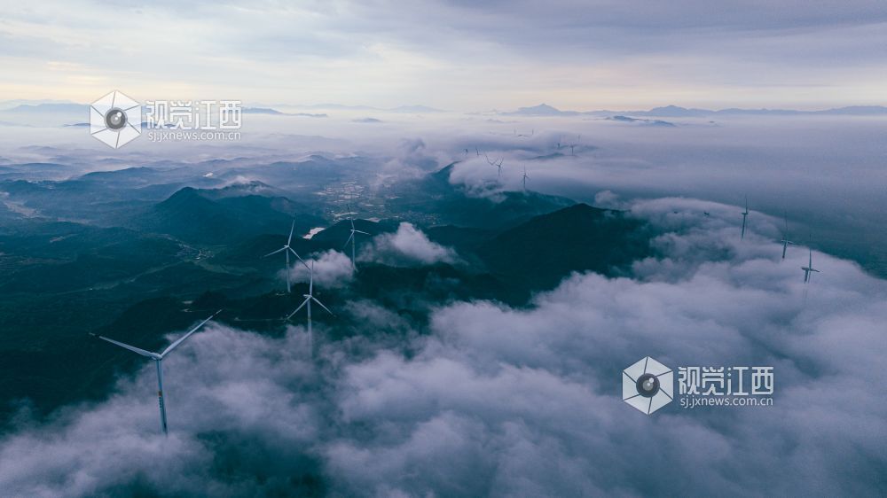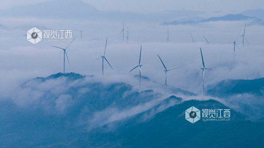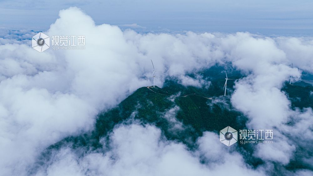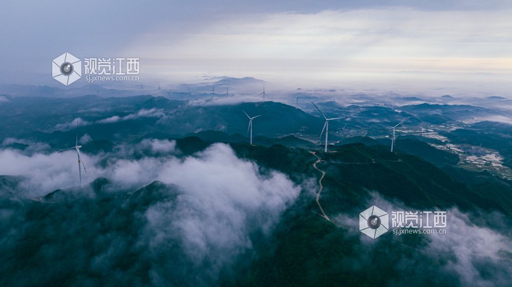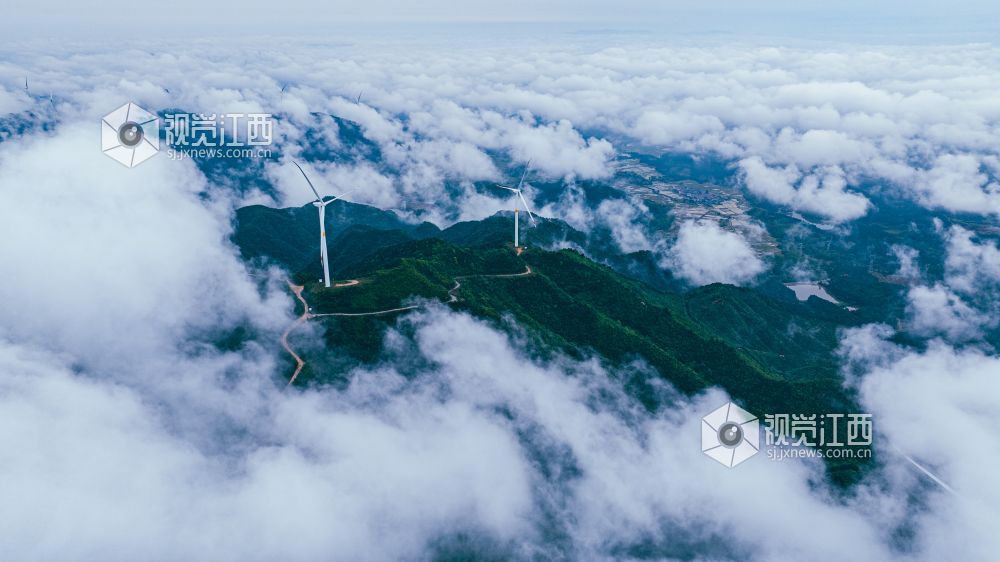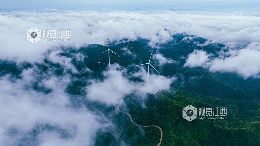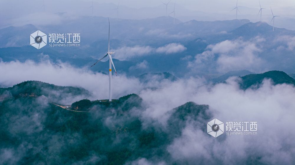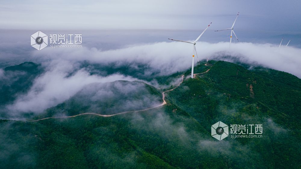 4月20日,江西省吉安市峡江县罗田风电场的壮丽景色映入眼帘。山峰上,高大的风力发电机组矗立,与翻腾的云海形成一幅动人的画卷。风车转动,云海翻腾,自然与绿色发电设备的和谐共存,展现了生态与经济效益的完美结合。