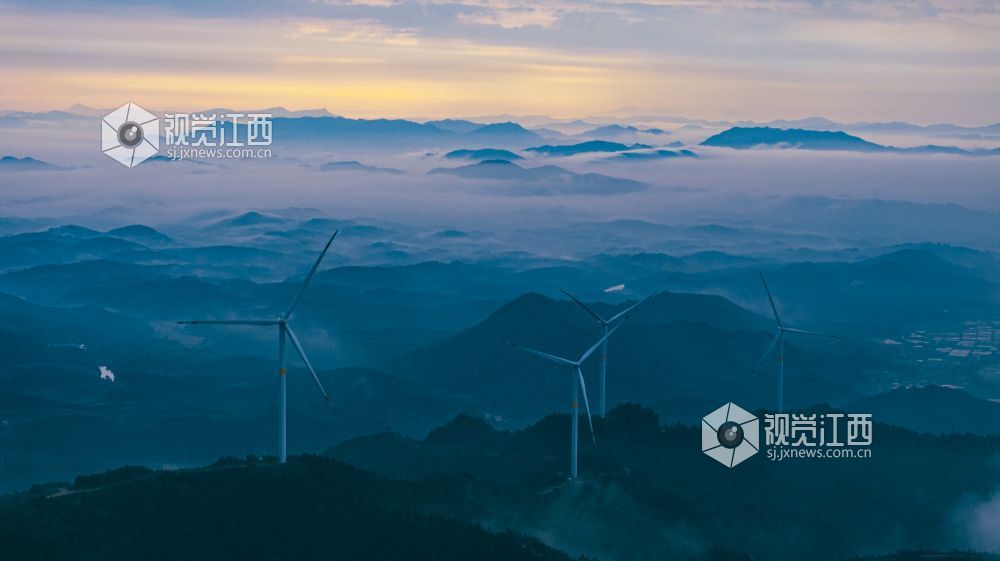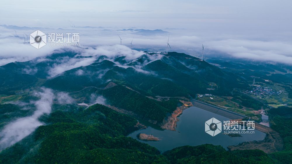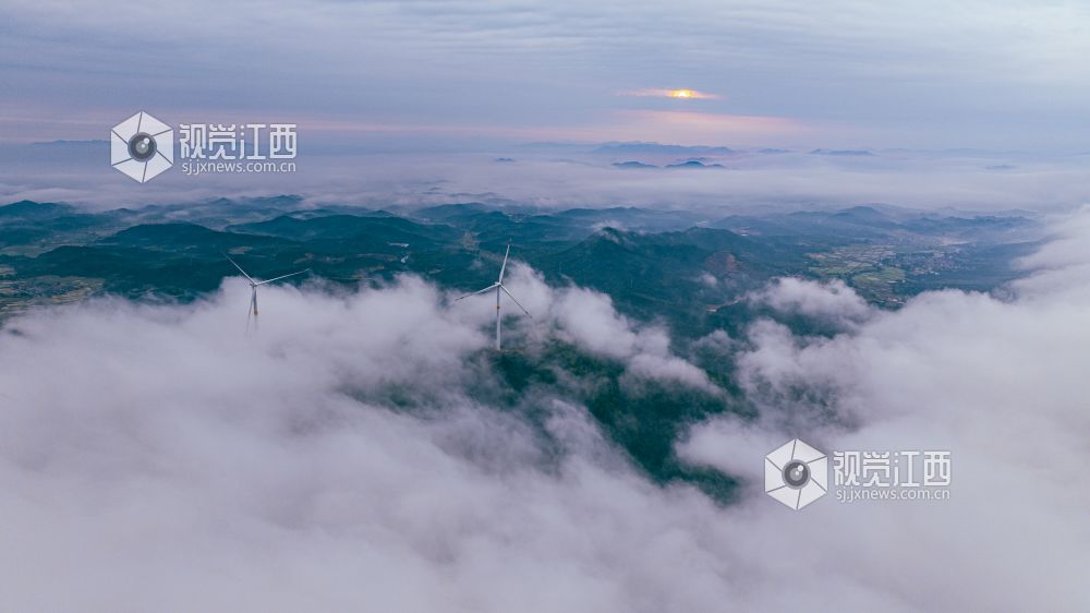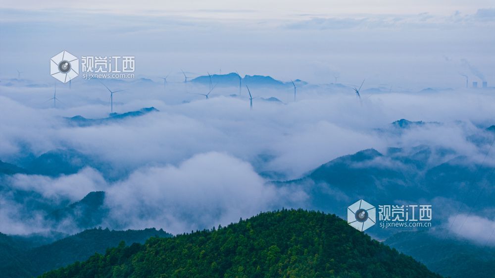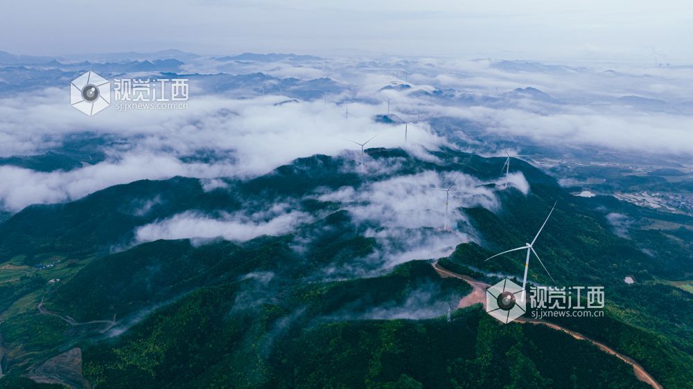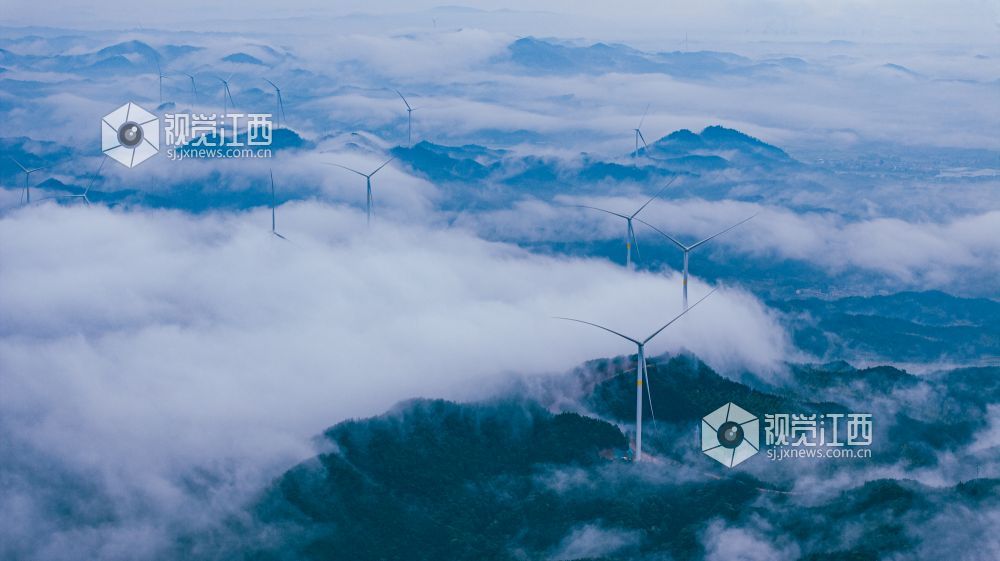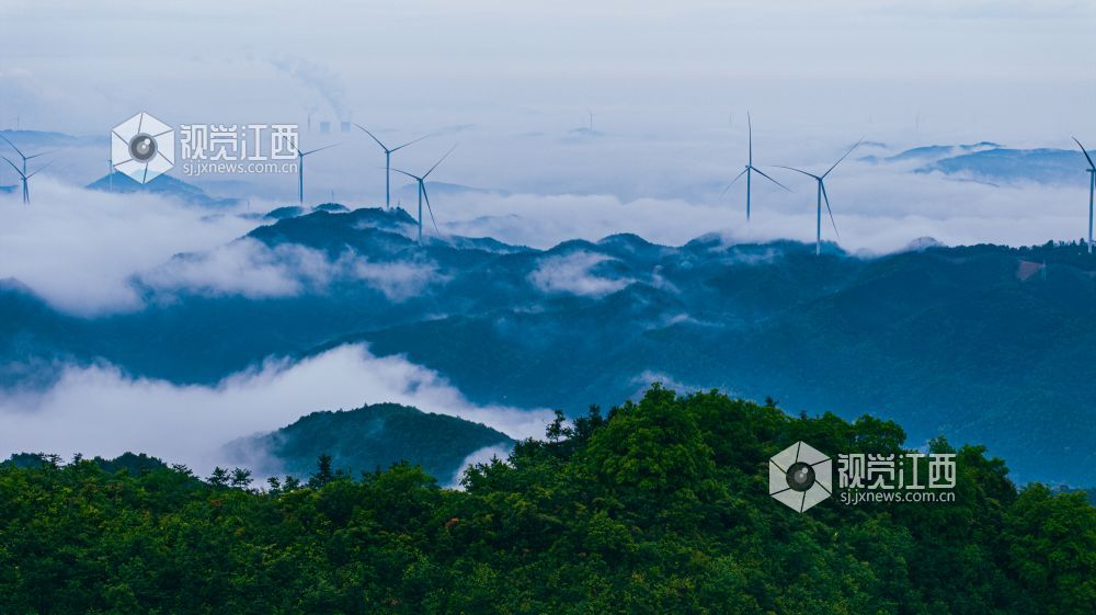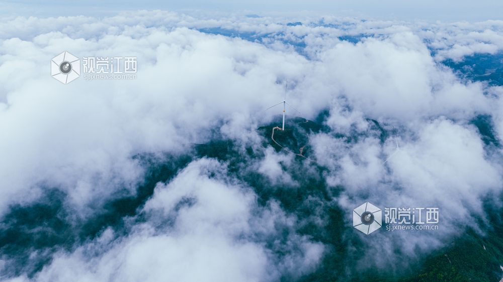 4月20日,江西省吉安市峡江县罗田风电场的壮丽景色映入眼帘。山峰上,高大的风力发电机组矗立,与翻腾的云海形成一幅动人的画卷。风车转动,云海翻腾,自然与绿色发电设备的和谐共存,展现了生态与经济效益的完美结合。