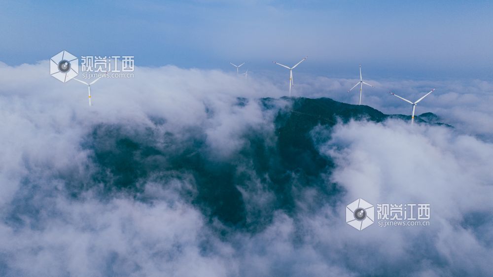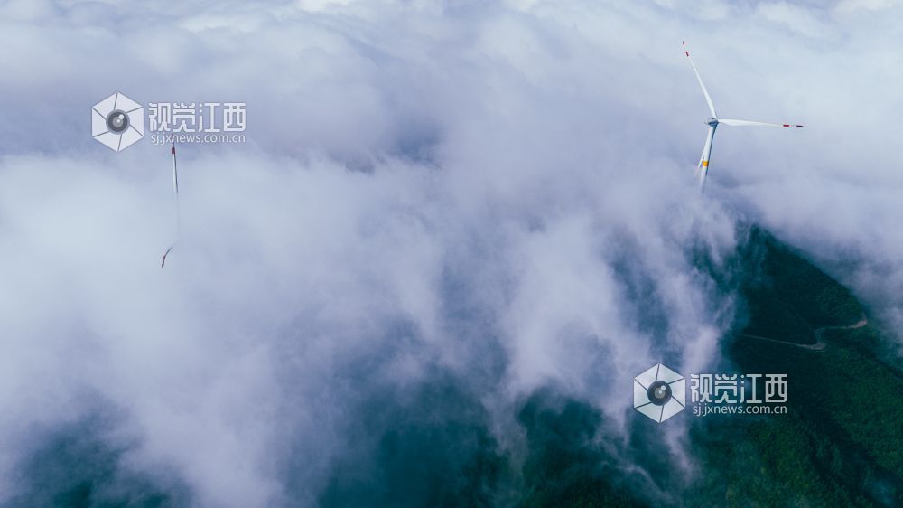 近日,在江西省吉安市峡江县罗田镇岱峏风电场,一台台高大的风力发电机组耸立在高山之上,云海翻腾、风车转动,自然风光与绿色发电设备构成一幅人间仙境的画卷,美不胜收。海拔700余米站在山顶放眼眺望秋风拂面群峰起伏云海缥缈。高大的风车与似水流云相遇长长的三叶扇翼随风旋转若隐若现蔚为壮观。恬静自在的白色风车如伫立于连绵山脉的守护者,涌动的云海青翠的山岭转动的白色风机构成一道靓丽的风景线。