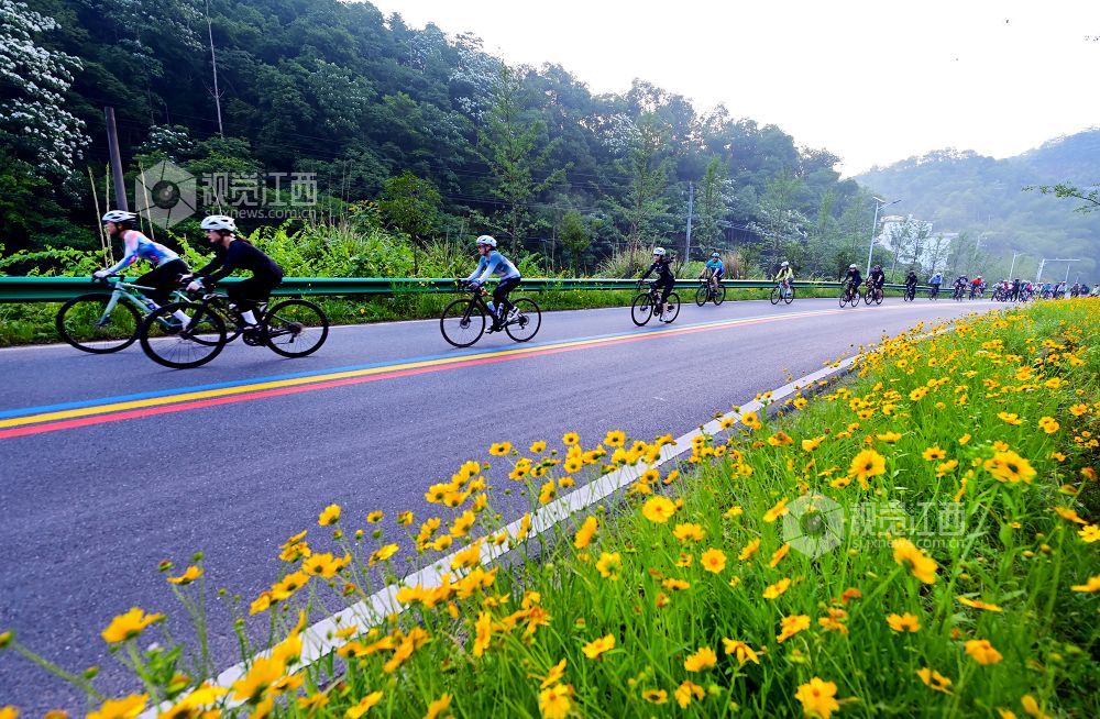 2025年5月14日,在江西省宜春市万载县白良镇范塘村境内,骑行爱好者在风景优美的乡村道路上骑行,欣赏夏日美景。