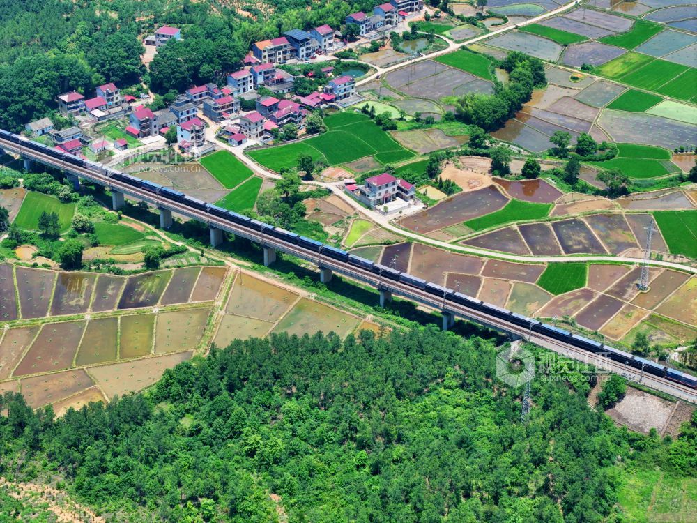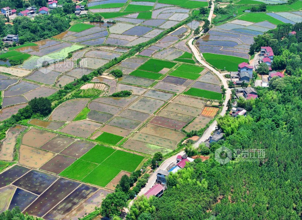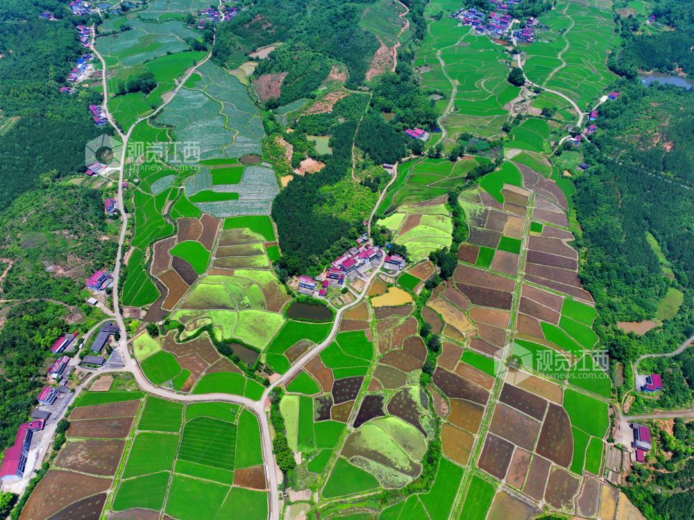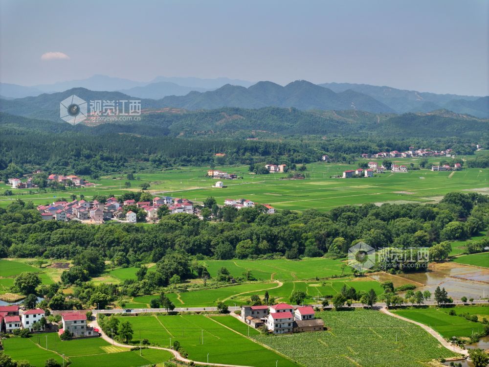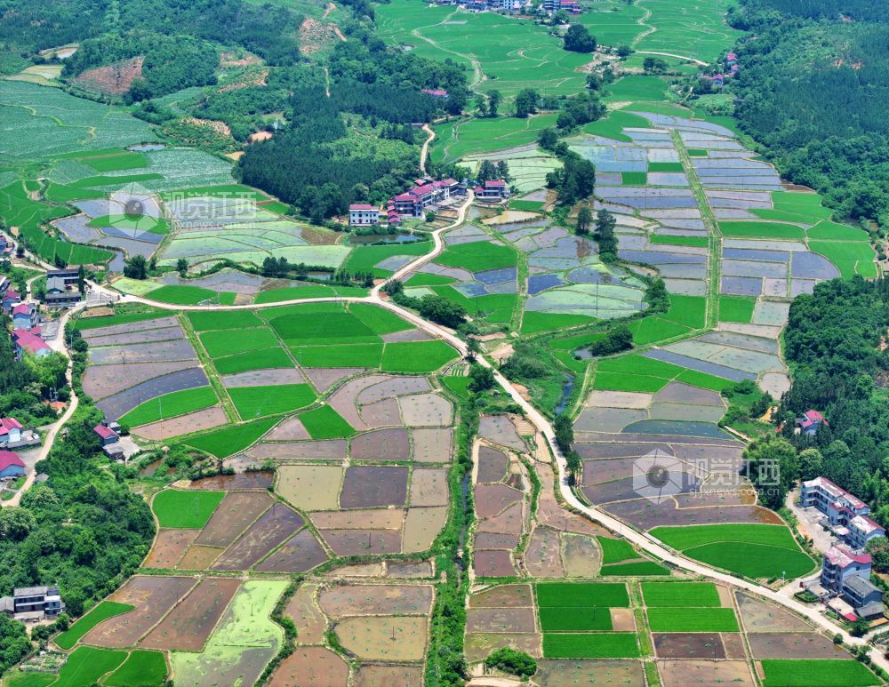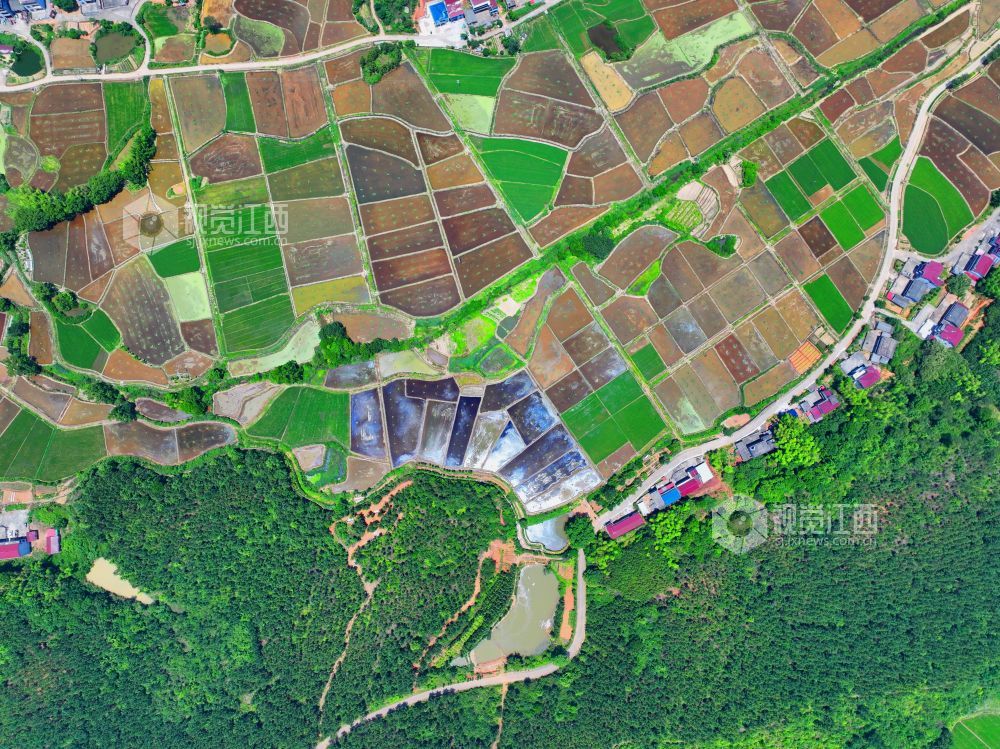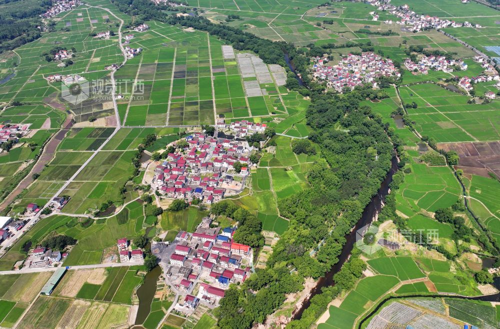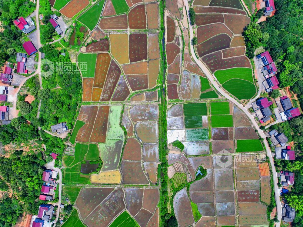 5月14日,江西省吉安市泰和县沙村镇坪洲村,农田与村道、农房相映成景,构成一幅夏日田园美丽画卷。