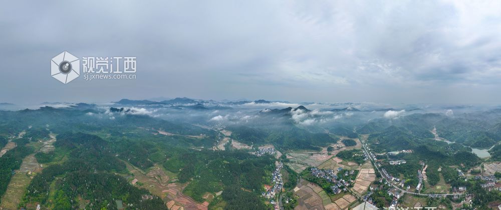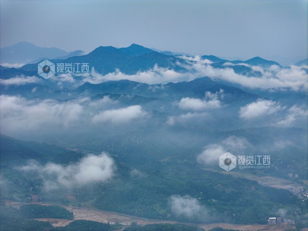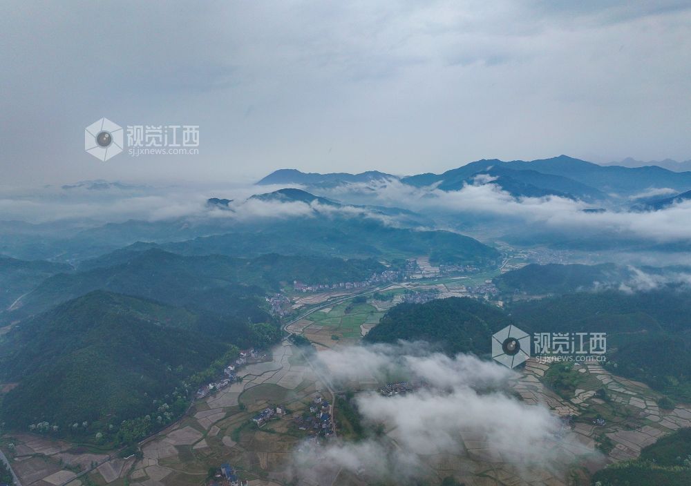 2025年5月15日,航拍江西省上饶市弋阳县漆工镇如梦如幻的云雾景观。大雨过后,弋阳县乡村现云雾缥缈,如梦如幻,与山川、民居形成一幅天然的水墨画。