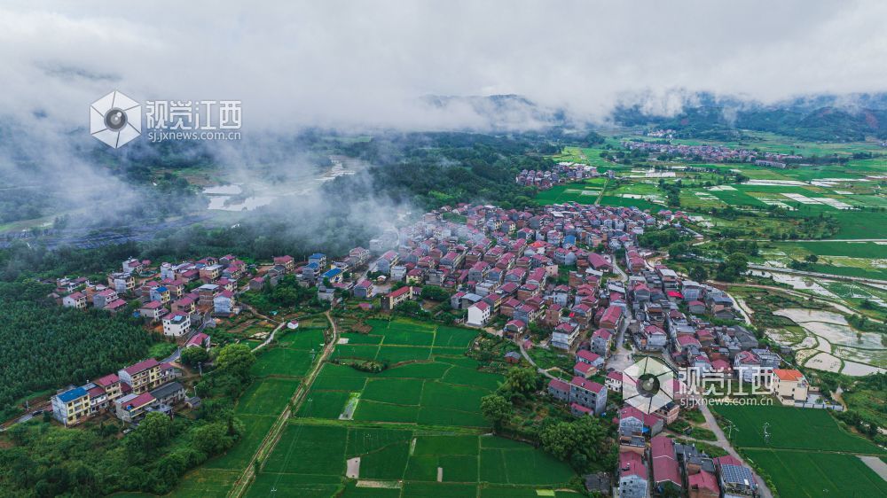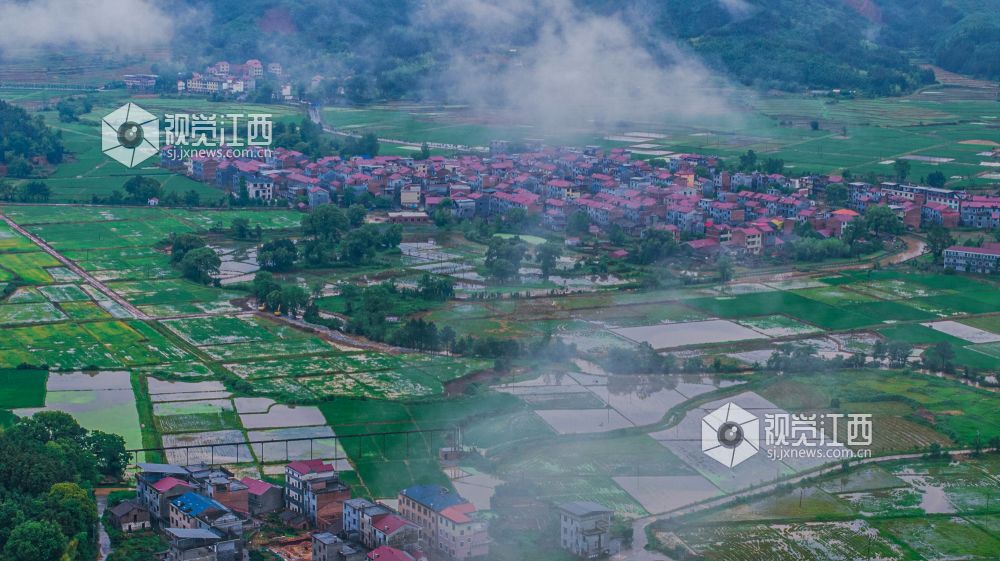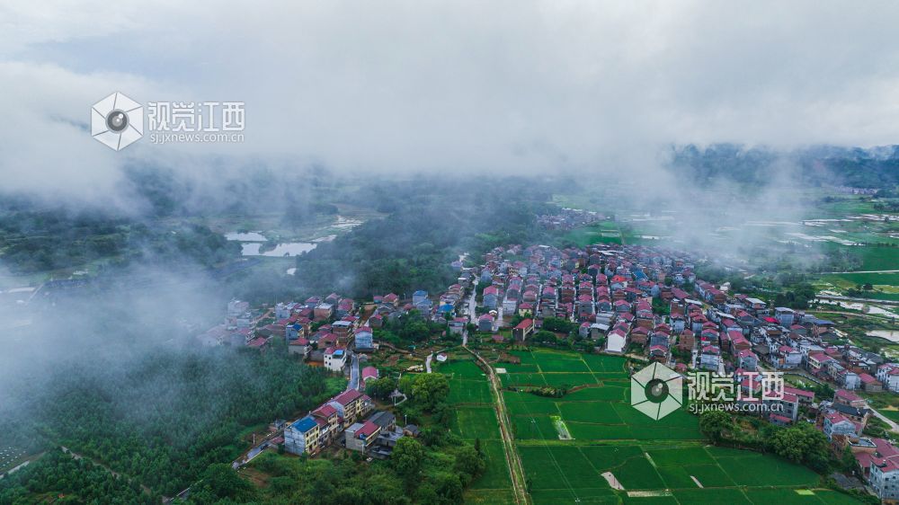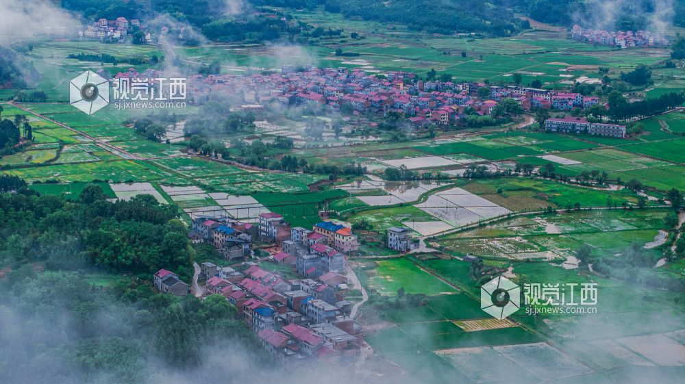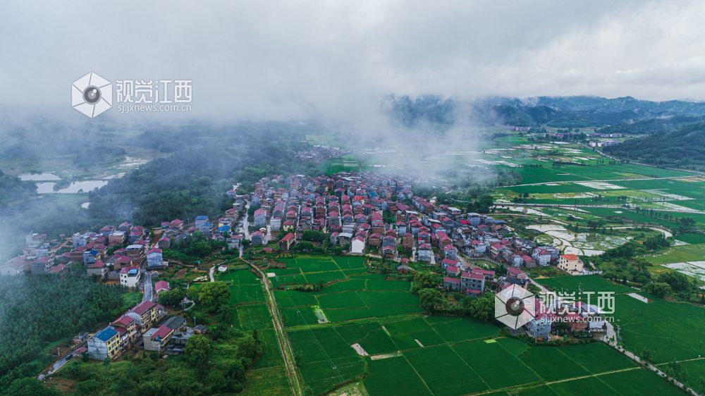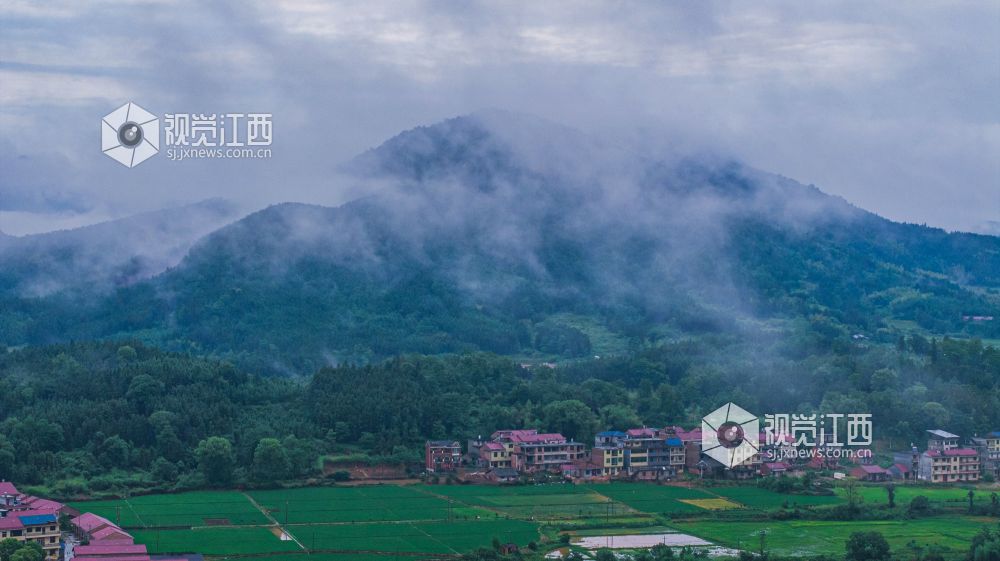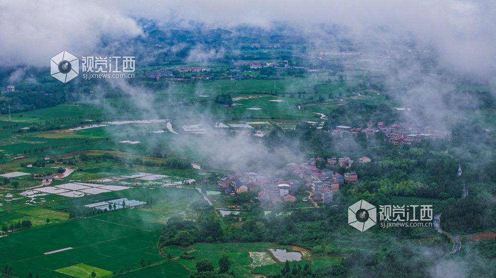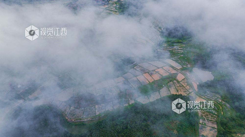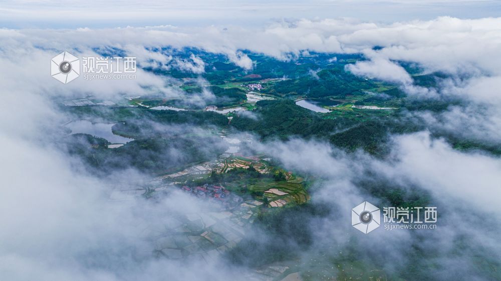 5月18日,江西省吉安市新干县麦斜镇?丘田村,一场夏雨过后,变幻的云海将村庄、梯田、山峰装扮得如梦如幻,山峦间云雾流动,蜿蜒的山间道路和层层叠叠的梯田在云雾中若隐若现,构成一幅幅美丽的乡村画卷。