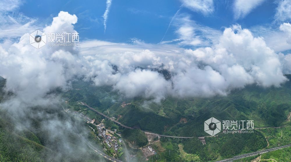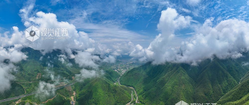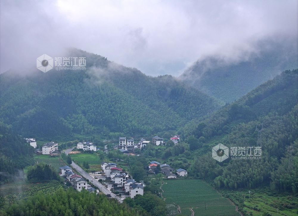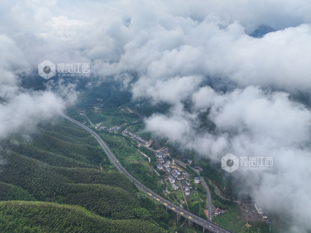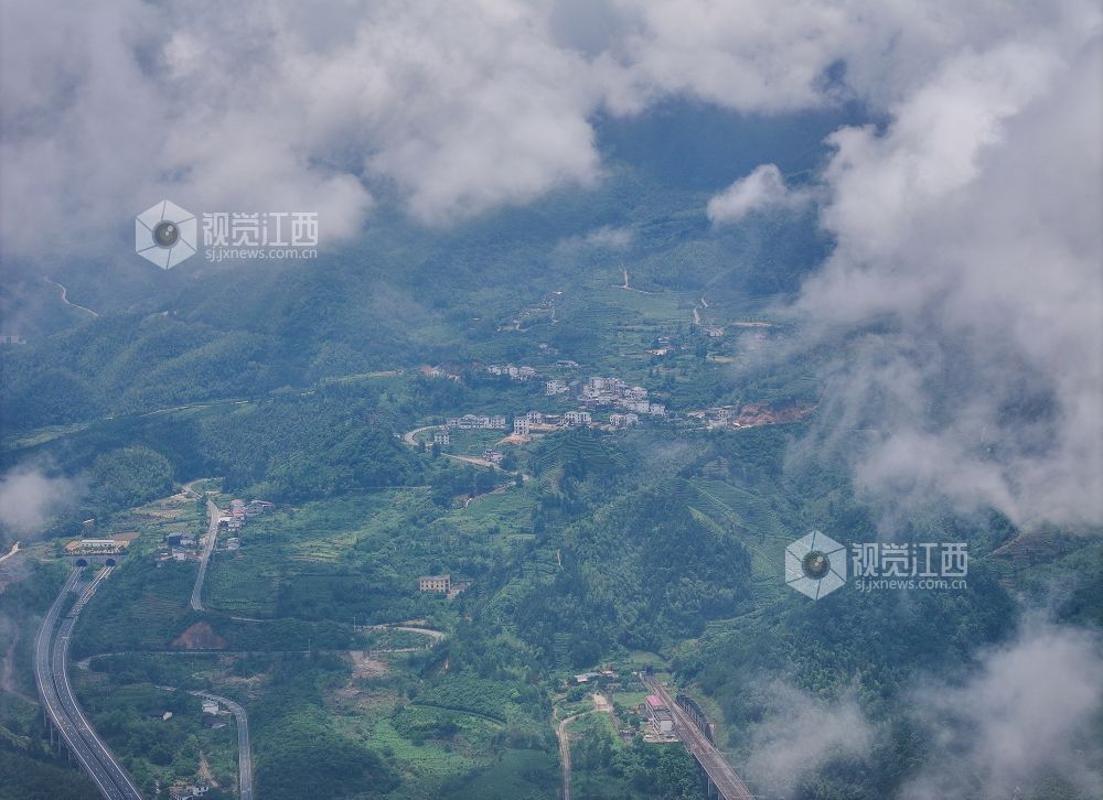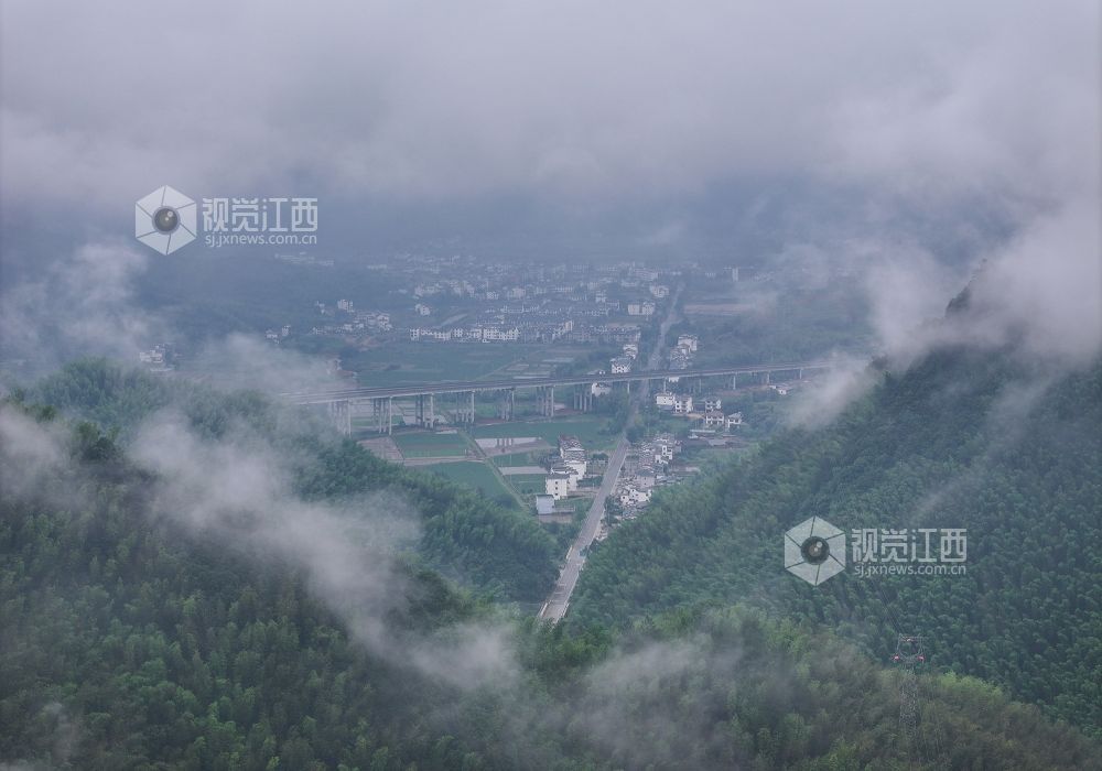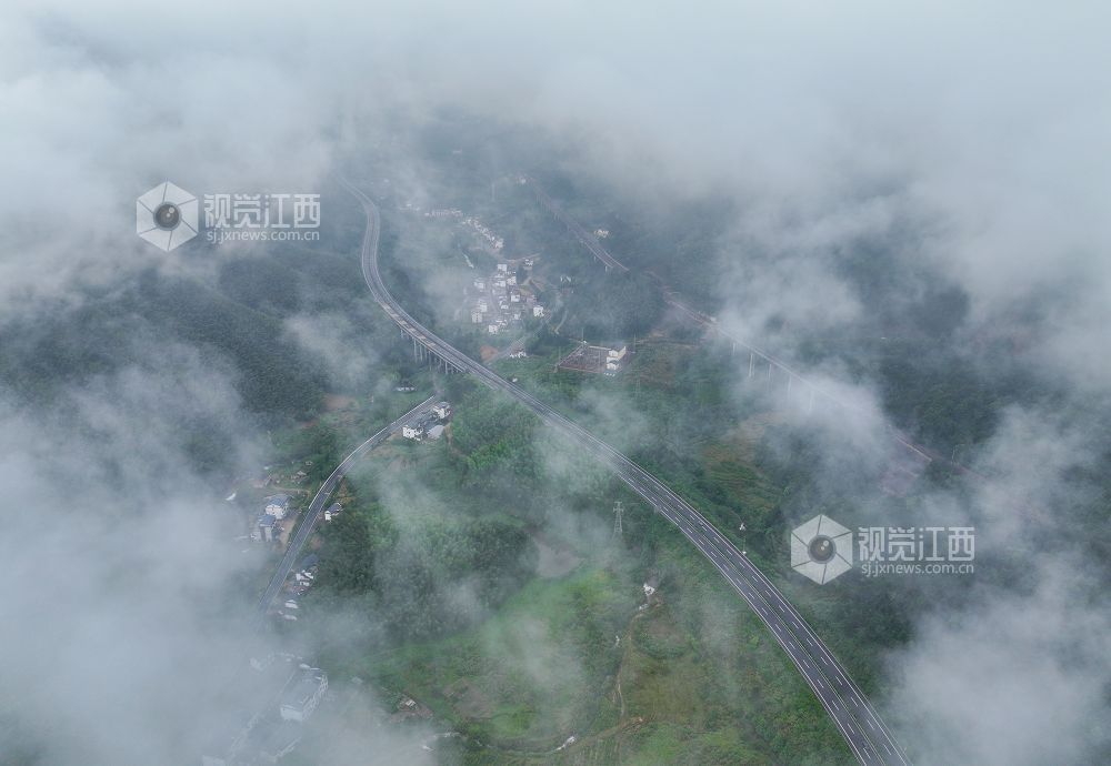 2025年5月24日,航拍武夷山国家公园江西片区铅山县武夷山镇,翠绿的青山、散落山间的民居、通达的公路与云雾交相辉映,构成一幅和谐美丽的乡村画卷。