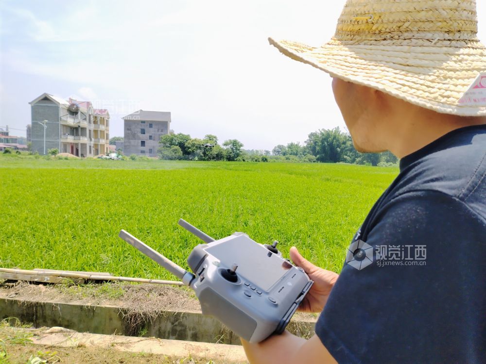 5月26日,江西省吉安市泰和县苏溪镇水口村种粮大户廖华明正在田间对早稻进行飞防作业。