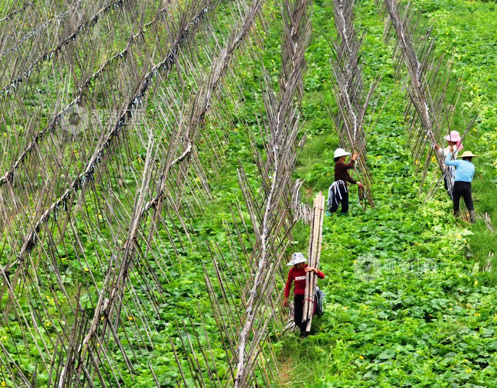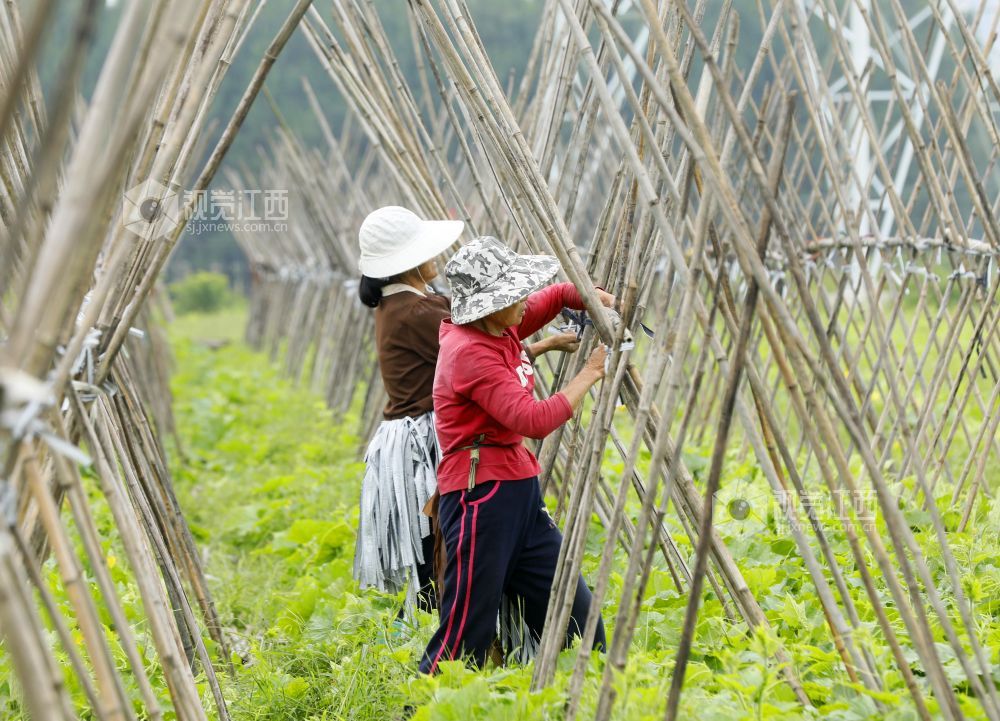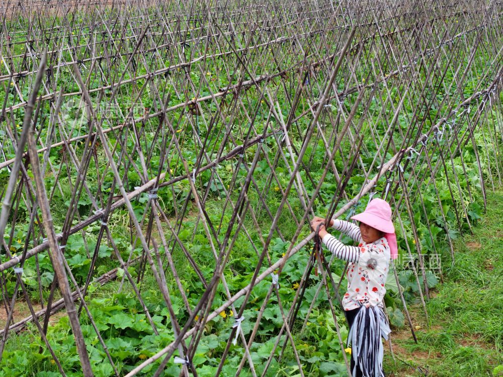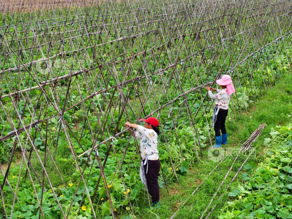 5月27日,江西省吉安市泰和县塘洲镇洲头村有机冬瓜种植基地,农民正在给冬瓜苗搭建竹架,助力攀爬生长,确保丰产丰收。江西泰和县积极开展蔬菜生产工作,引导农民进行田间管理,确保蔬菜丰产保供。