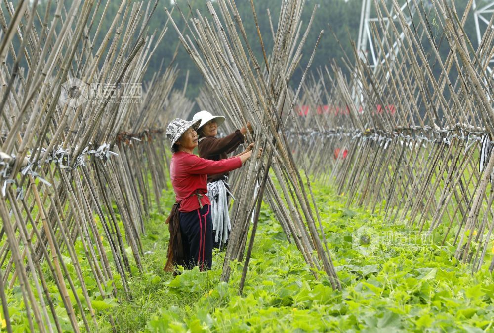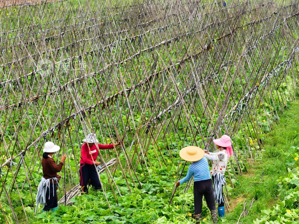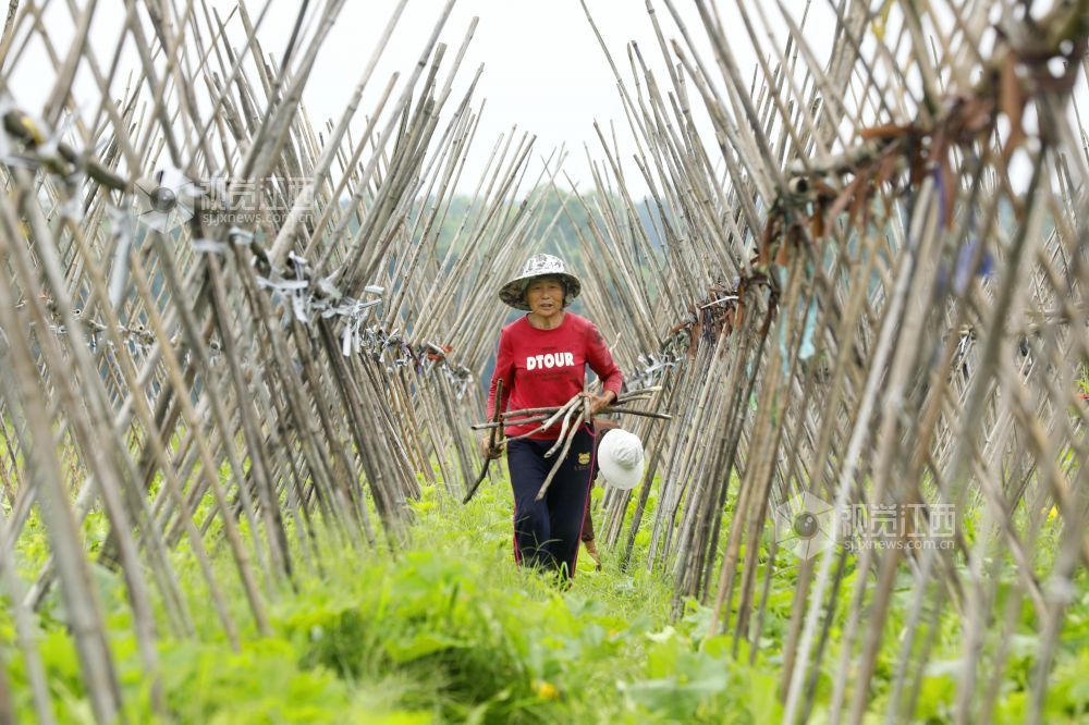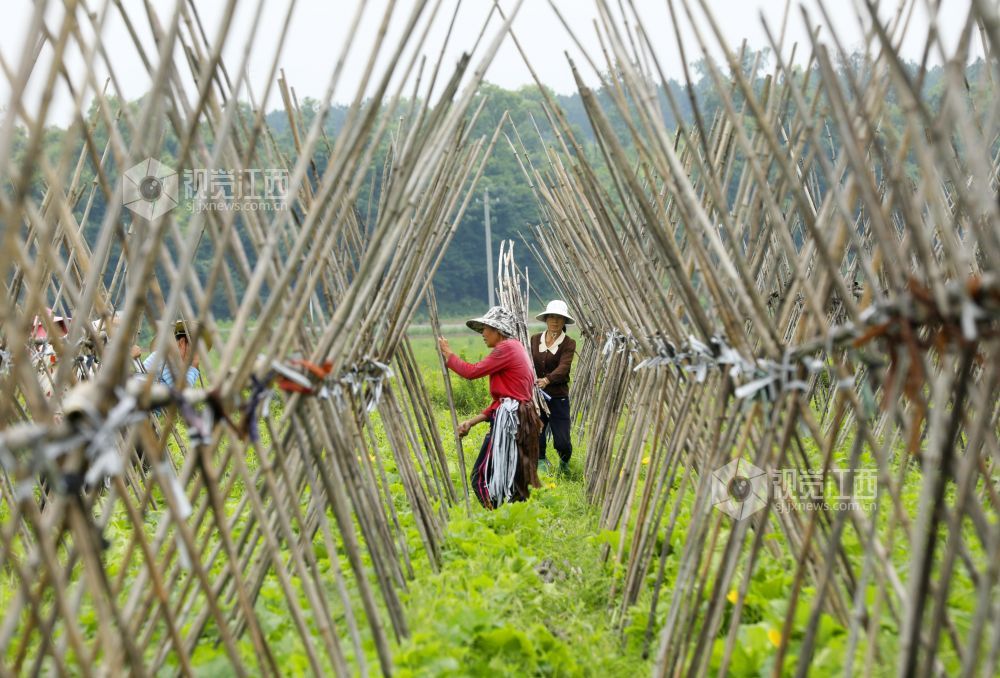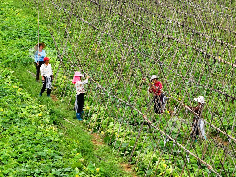 5月27日,江西省吉安市泰和县塘洲镇洲头村有机冬瓜种植基地,农民正在给冬瓜苗搭建竹架,助力攀爬生长,确保丰产丰收。江西泰和县积极开展蔬菜生产工作,引导农民进行田间管理,确保蔬菜丰产保供。