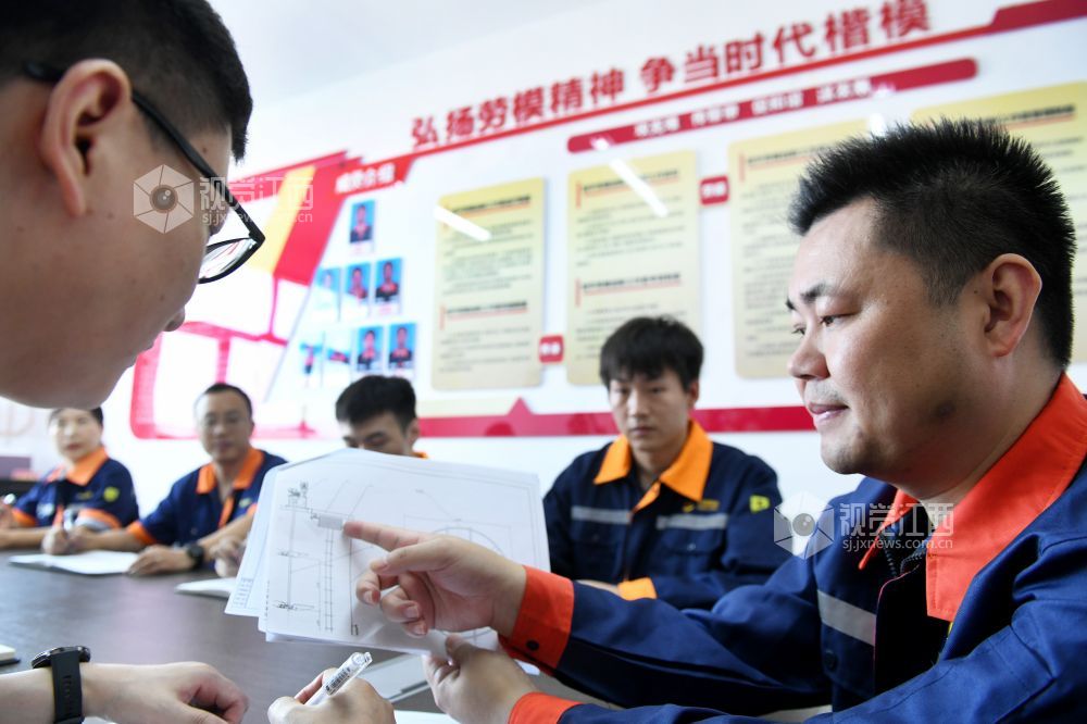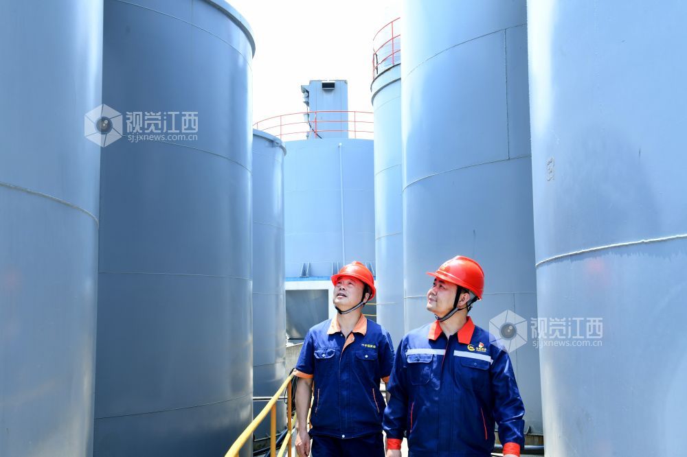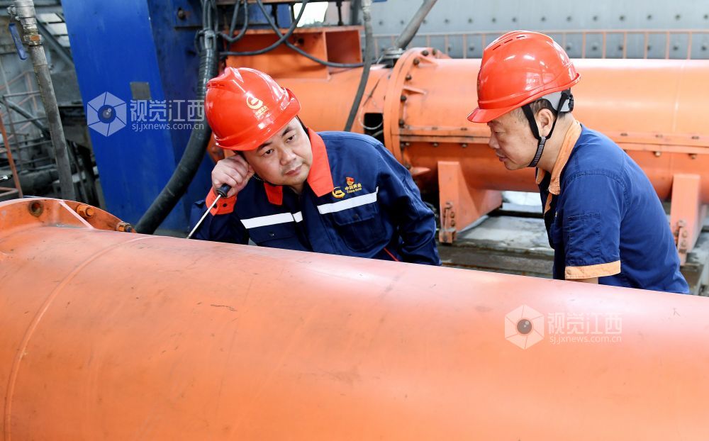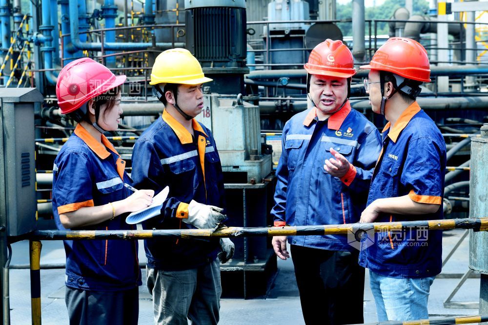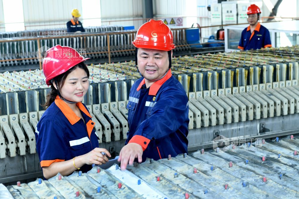 2025年5月27日,4月底从人民大会堂领奖归来全国劳模、江西省江西三和金业有限公司质检部经理倪平(前右)正在生产一线了解金矿氧化渣压滤的脱水情况。
