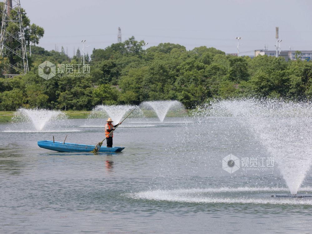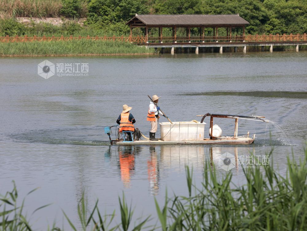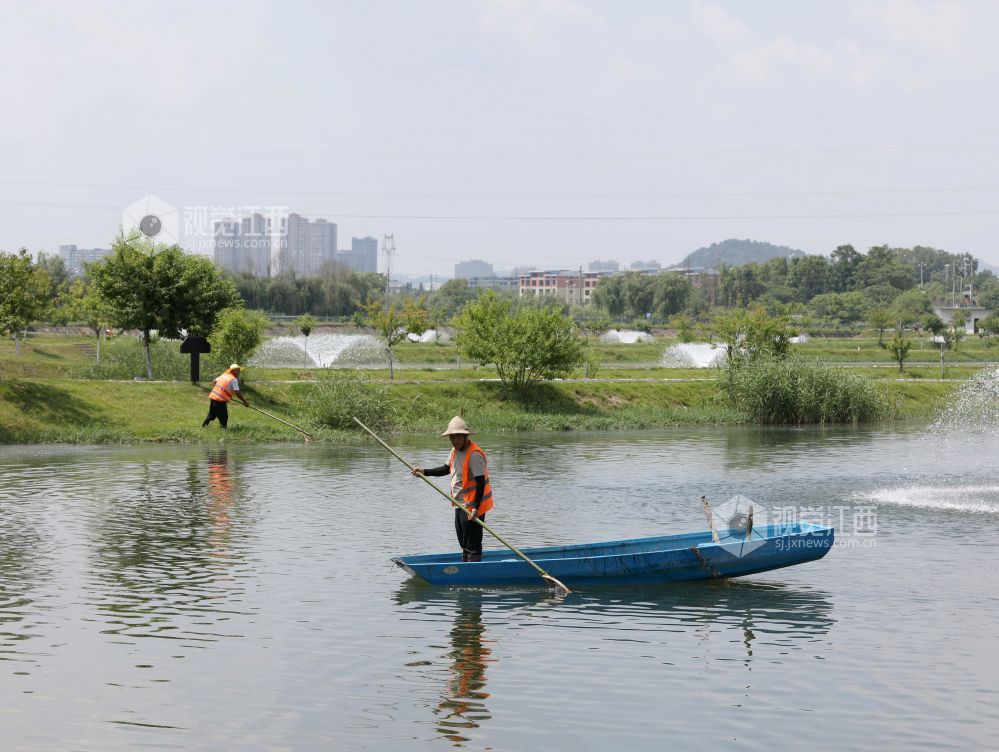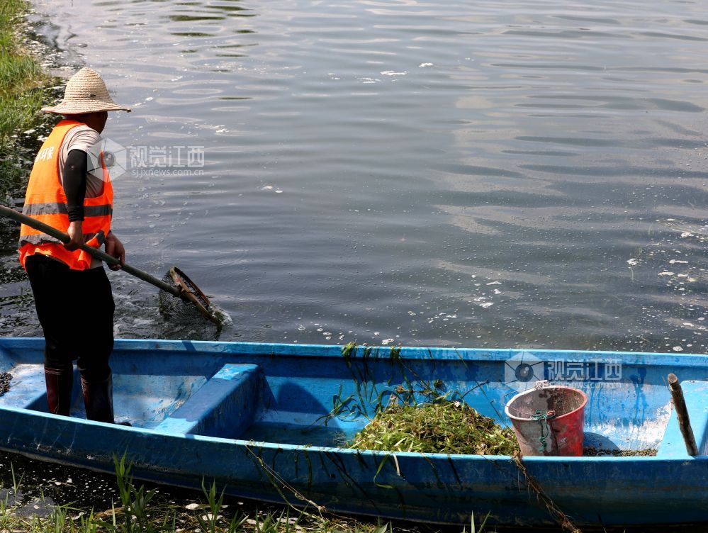 2025年6月4日,工作人员正在介溪湿地打捞水草漂浮物。在世界环境日来临之际,江西省分宜县持续践行“绿水青山就是金山银山”的理念,大力推进河湖生态文明建设,健全水域环境长效管理机制,及时对水域进行清理维护,打造水清、岸绿、景美、人和的生态画卷。