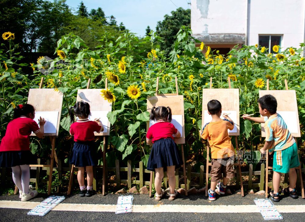 眼下,江西省分宜县洋江镇中心幼儿园种植的向日葵热烈绽放,幼儿园老师引导孩子们走出教室,走进大自然,用画笔描绘阳光明媚的夏日风景。