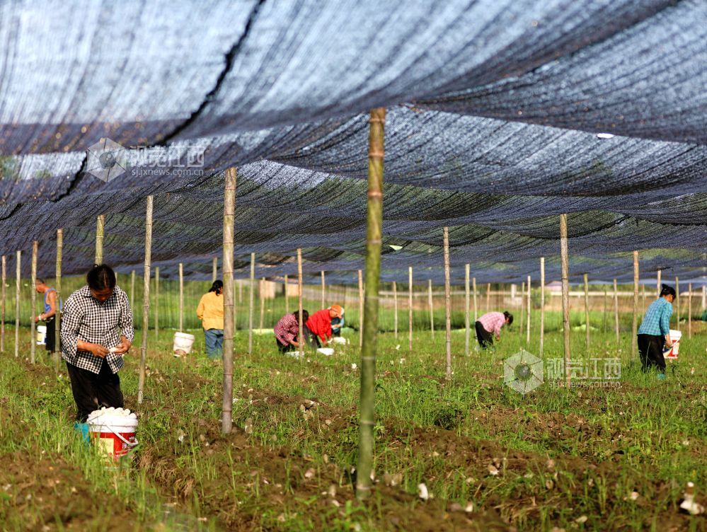 2025年6月13日,村民忙着在竹荪基地采摘、装运新鲜的竹荪。连日来,江西省分宜县操场乡赤土村种植的竹荪迎来盛产期,村民们在种植基地里来回穿梭,抢在竹荪完全开伞前进行采摘收捡。