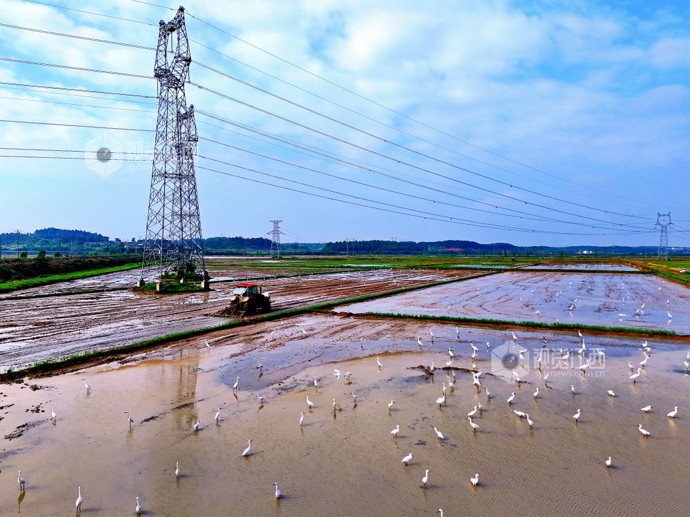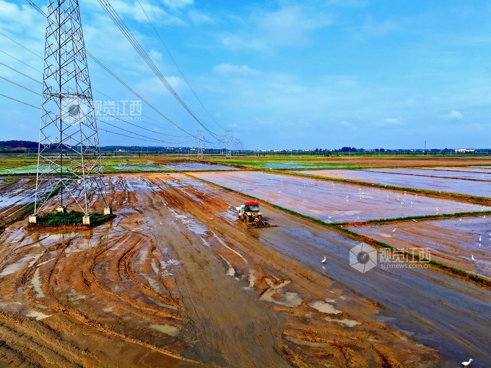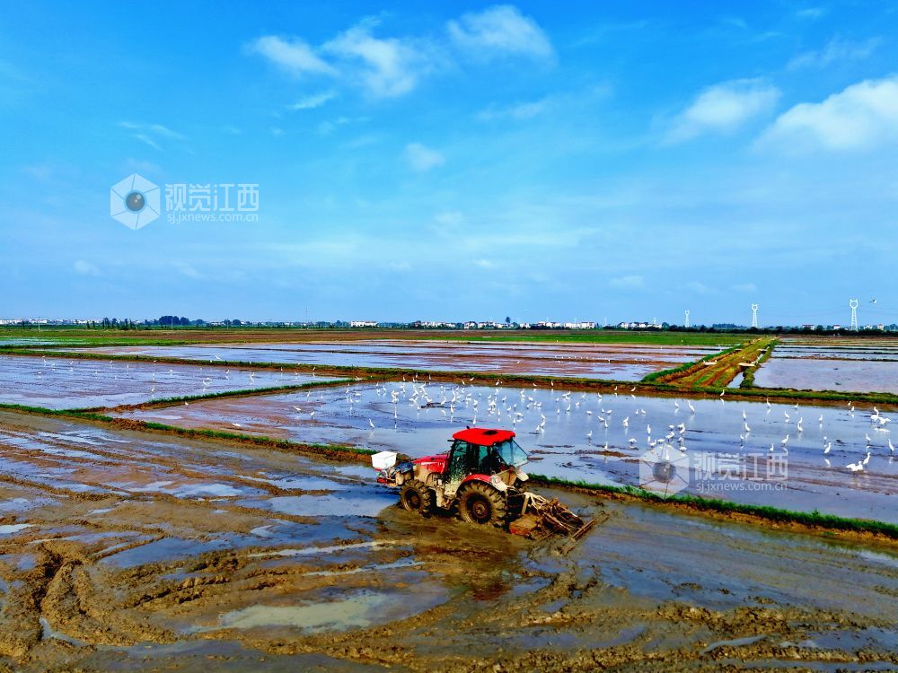 2025年6月13日,江夏分场农民驾驶农机在2400亩高标准农田里来回穿梭进行翻耕作业,而成群的白鹭在翻耕的土地上觅食、嬉戏,构成一幅美丽的生态田园画卷。