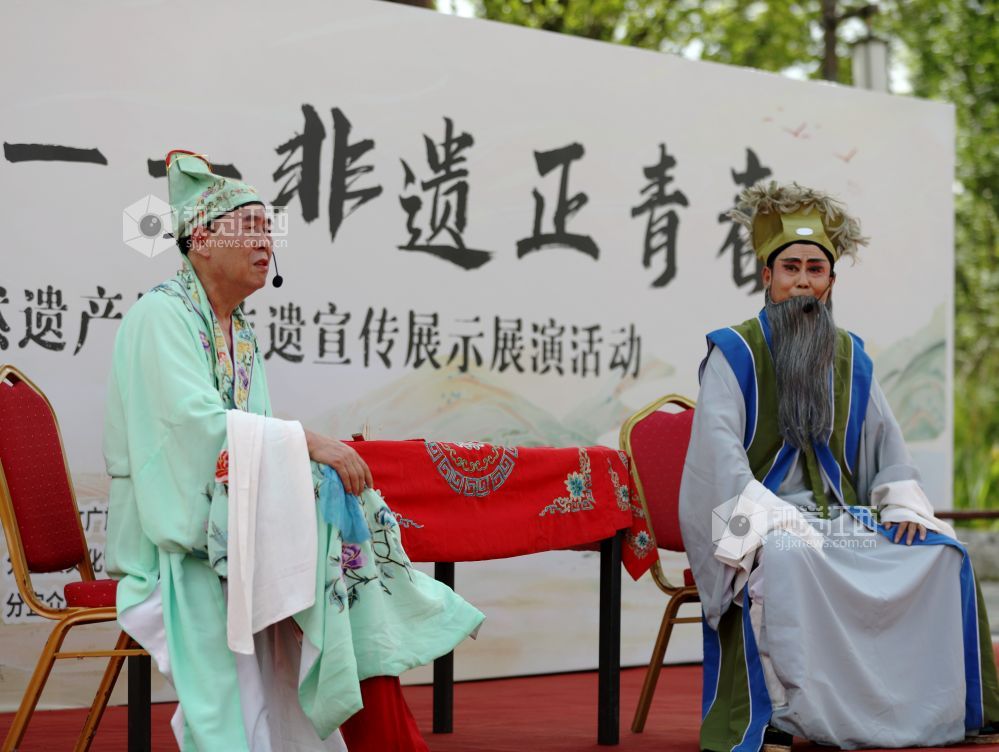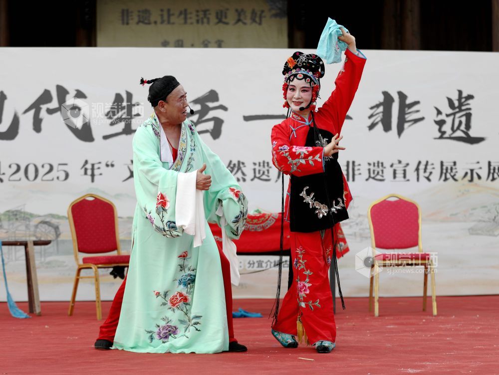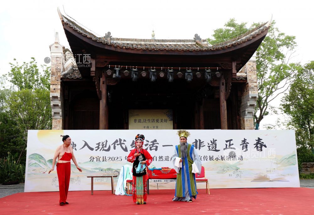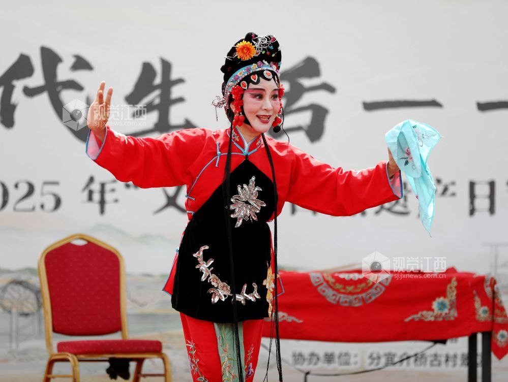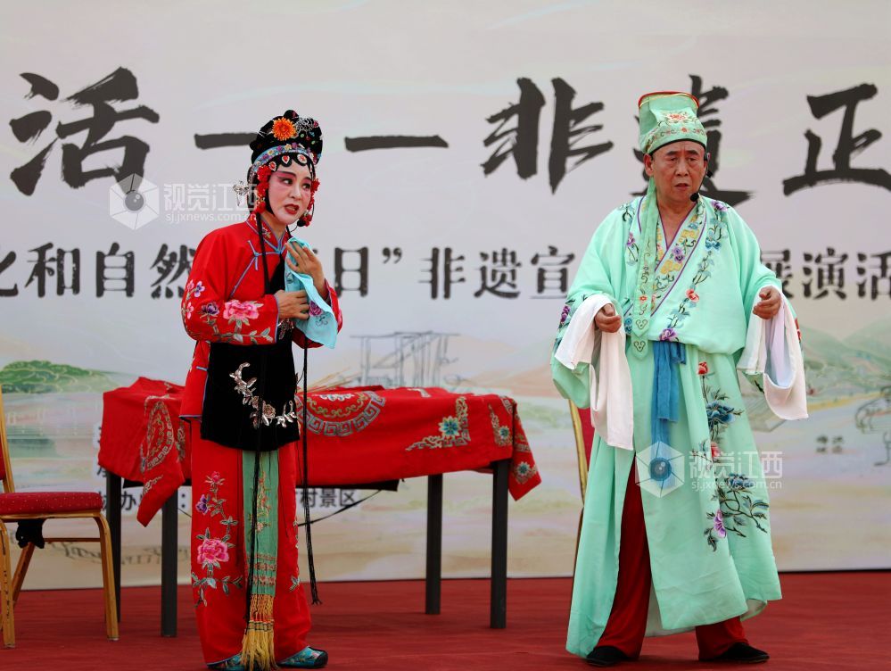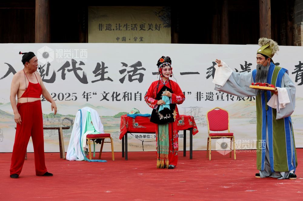 2025年6月14日,江西省分宜县草根演员在分宜镇介桥古村表演诙谐幽默的折子戏《子才打赌》。当日,是文化和自然遗产日,分宜县组织民间剧团进行折子戏专场演出,弘扬优秀传统文化,让广大群众在家门口共赏好戏,感受地方戏曲文化的魅力,丰富百姓周末假期的精神文化生活。