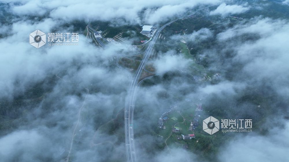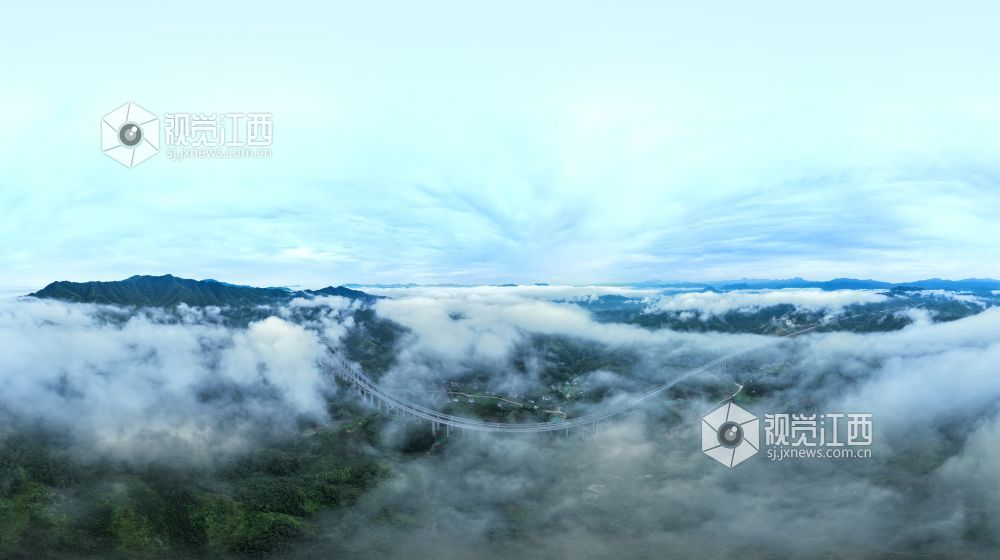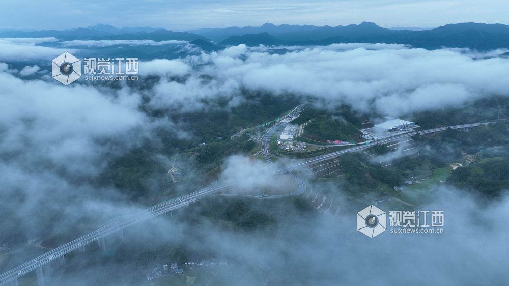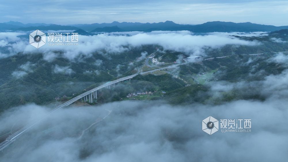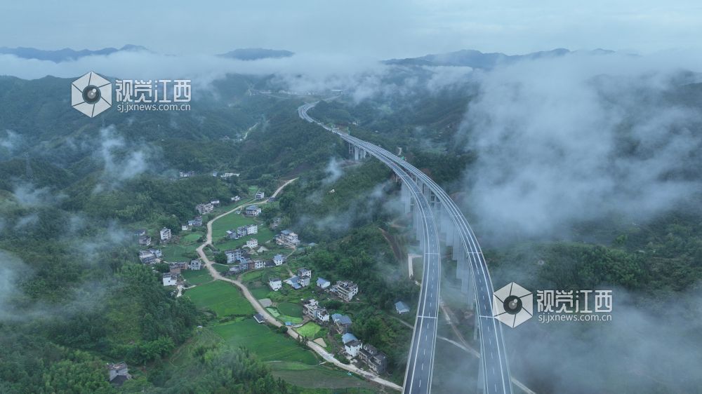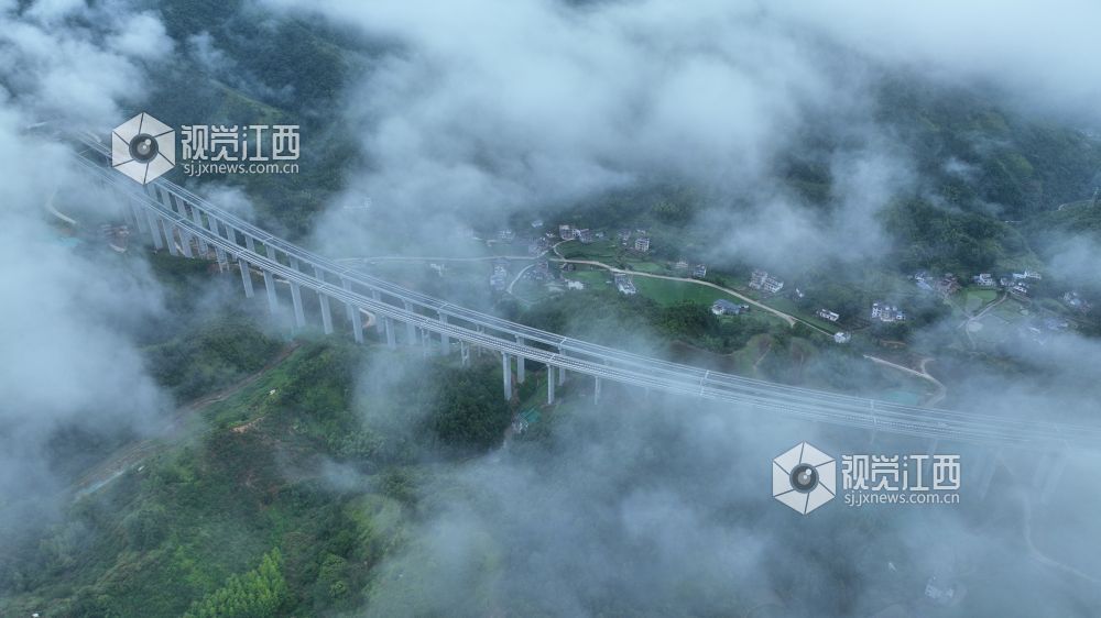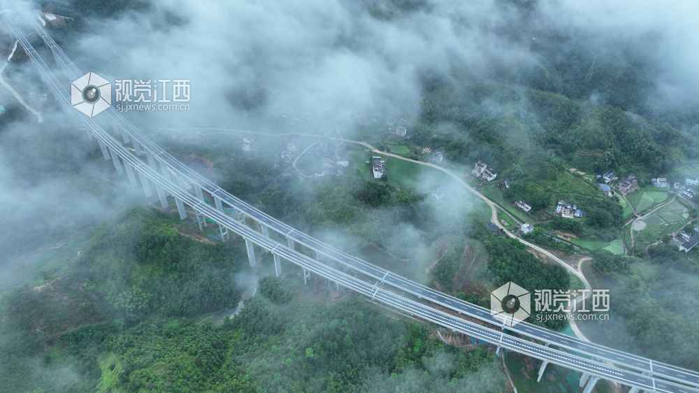 2025年6月16日,江西省重点工程遂(川)至大(余)高速,如银龙穿梭于青山云海间,桥梁飞架崇山峻岭,磅礴气势尽显。