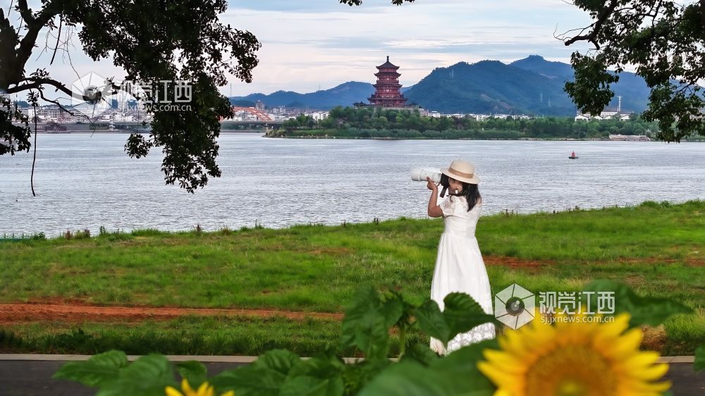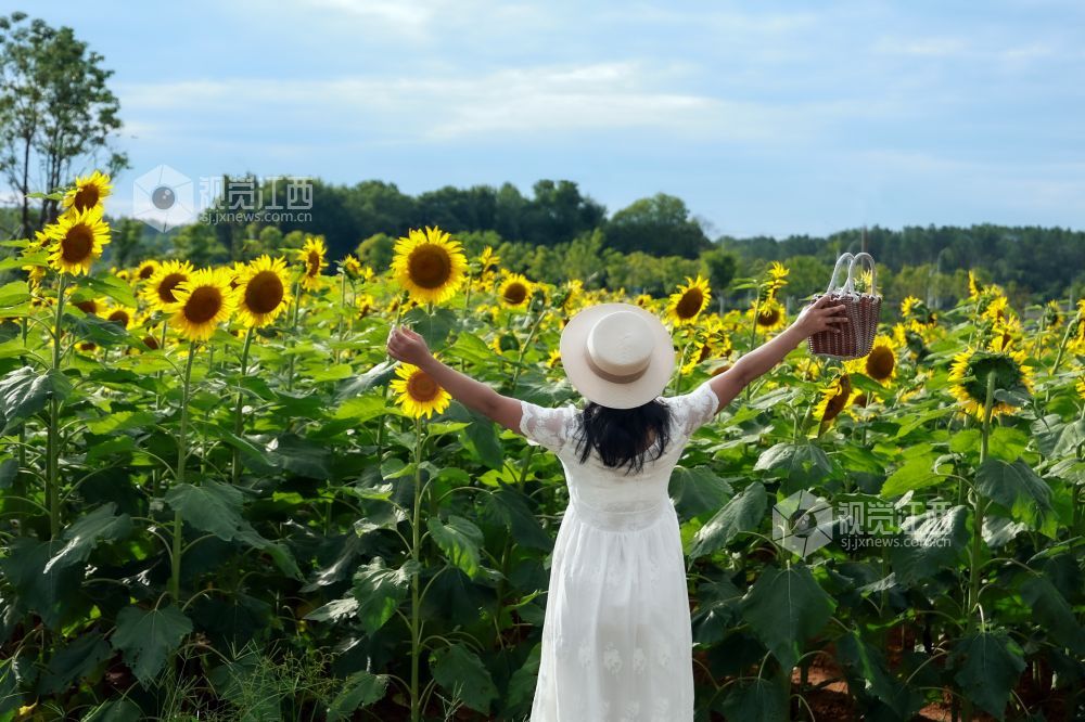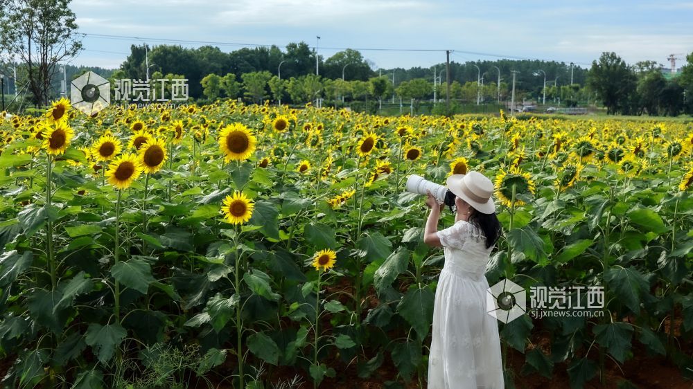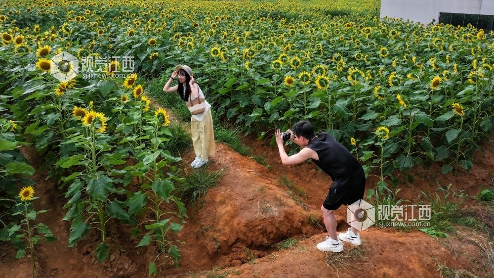 2025年6月19日,在江西省吉安市吉水县金滩镇的十里画廊,向日葵迎着夏日的骄阳肆意绽放,游客们打卡拍照,鸟儿也不时穿梭其间吸食向日葵,热闹非凡,好一幅阳光、花海、人与鸟共同绘就的美丽生态画卷。