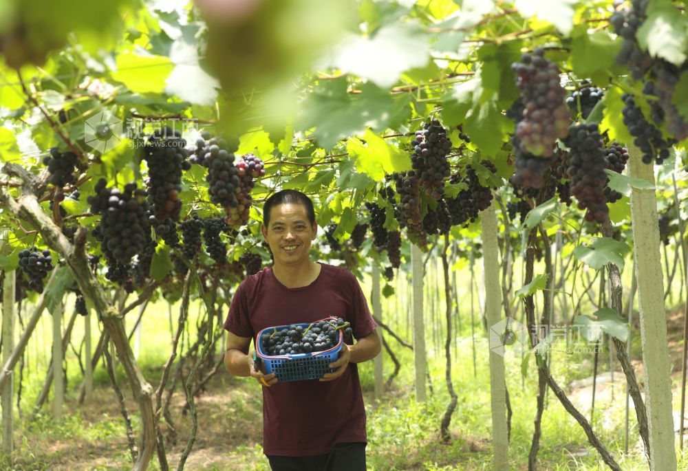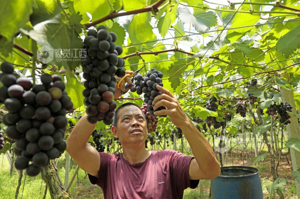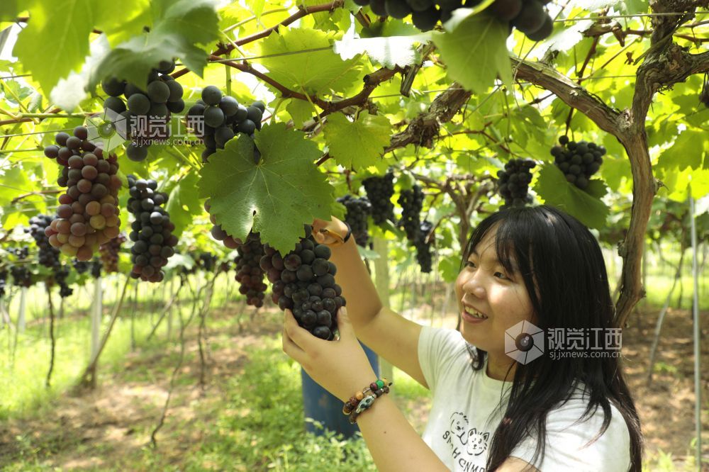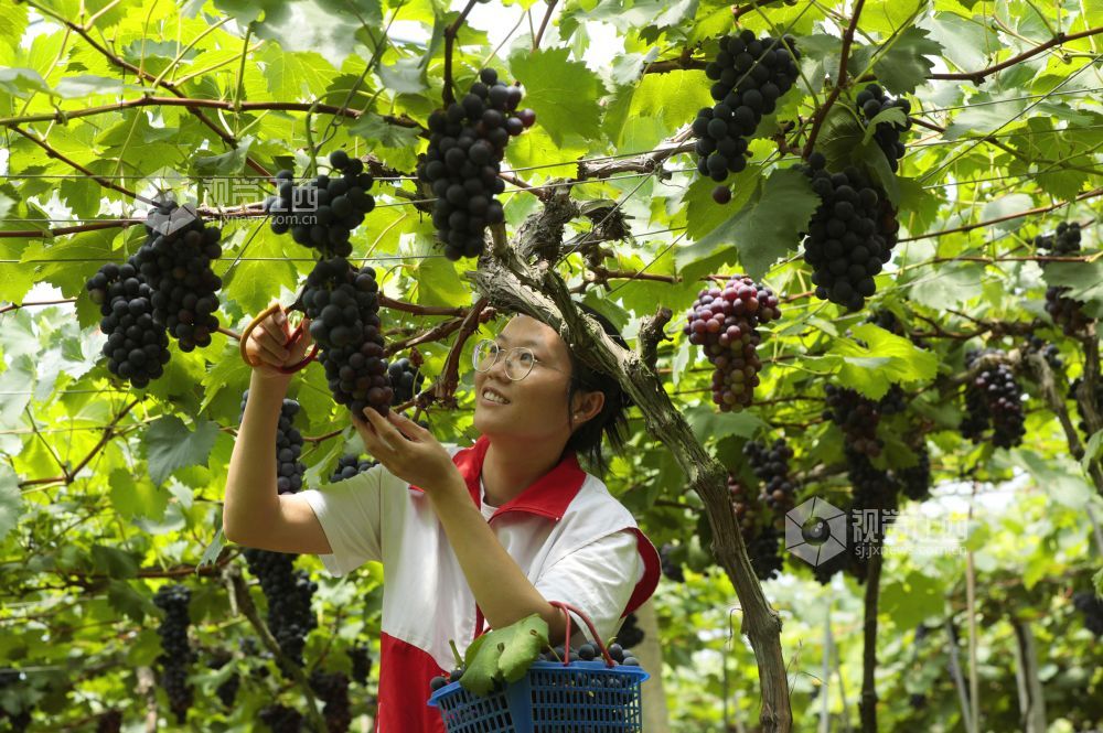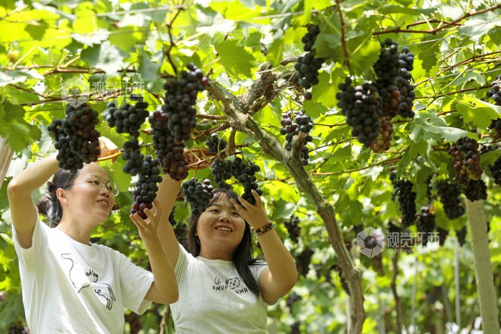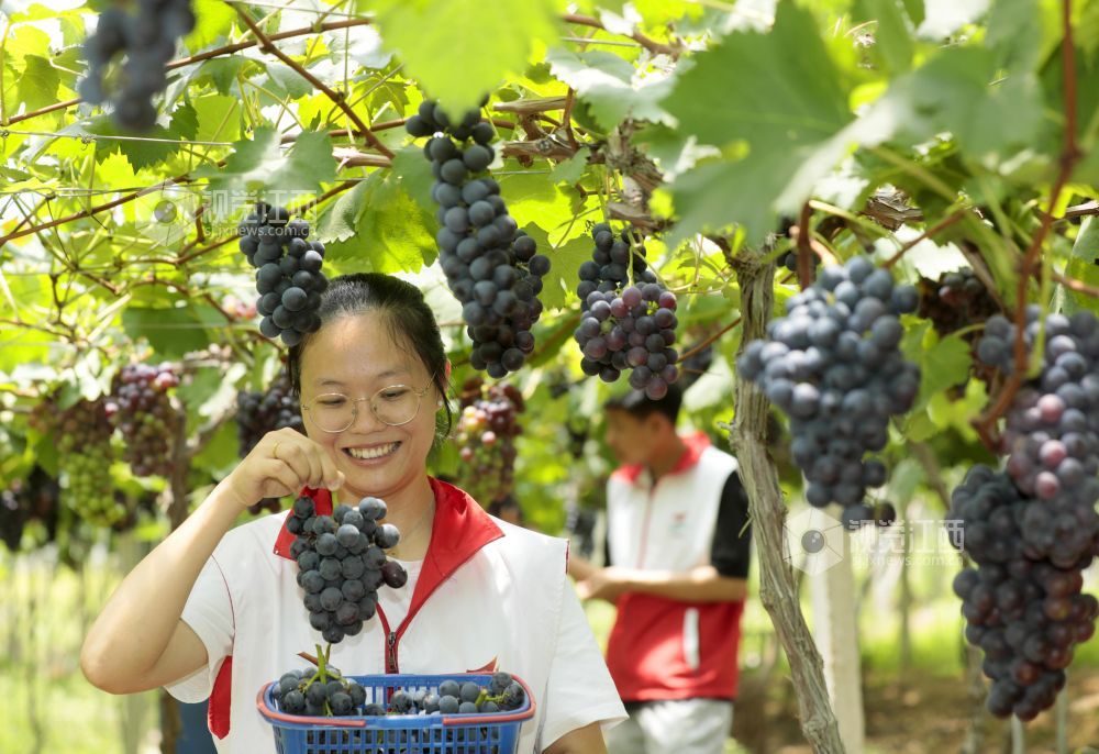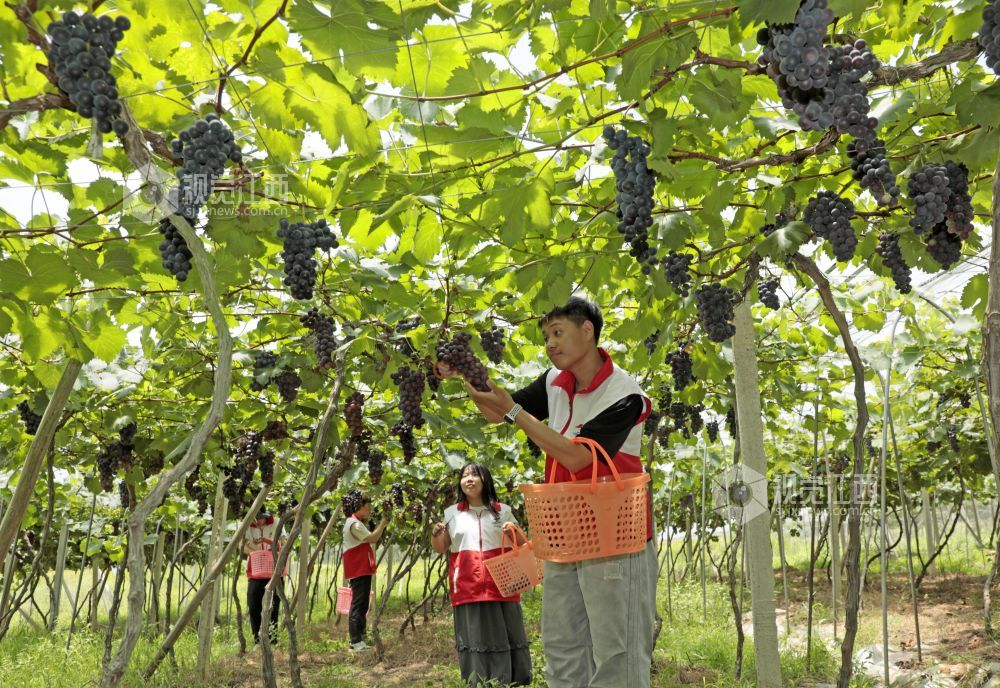 6月27日,江西省吉安市泰和县上模乡油洲村葡萄种植基地,游客正在采摘葡萄。江西泰和县上模乡油洲村积极发展生态葡萄种植产业,带动农民增收,助力乡村振兴。
