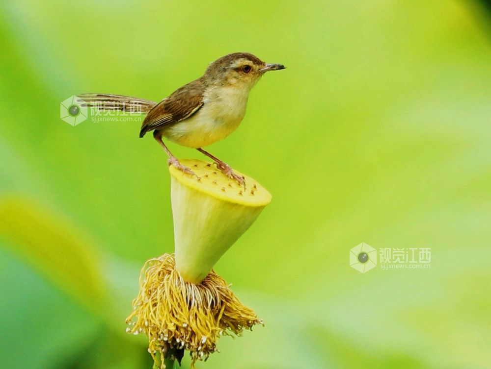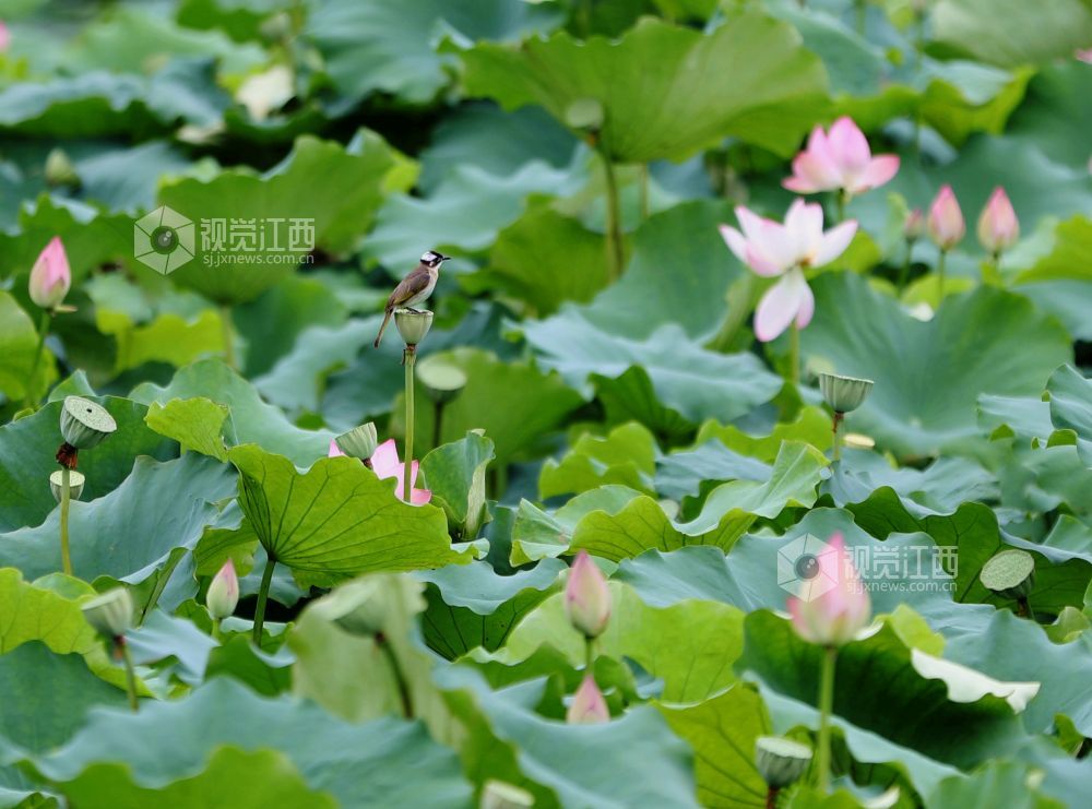 2025年6月29日,一只小鸟站在荷塘的莲蓬上停歇。盛夏时节,江西省分宜县城乡各地的荷花盛开,袅袅婷婷,暗香浮动,吸引了众多生物在荷塘栖息、觅食、繁衍。