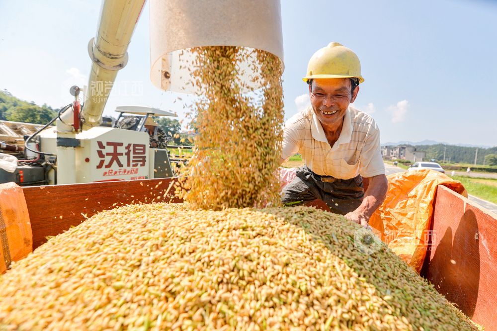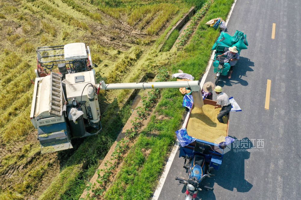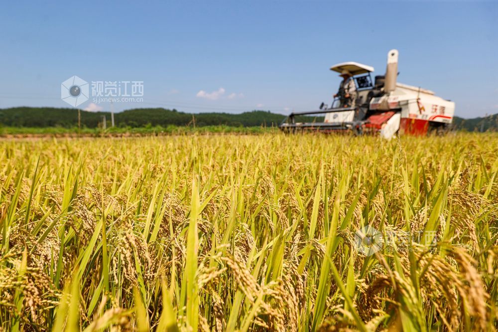 盛夏时节,江西省吉安市峡江县的早稻陆续成熟,当地农民积极抢抓晴好天气收获早稻,田间地头一派丰收景象。