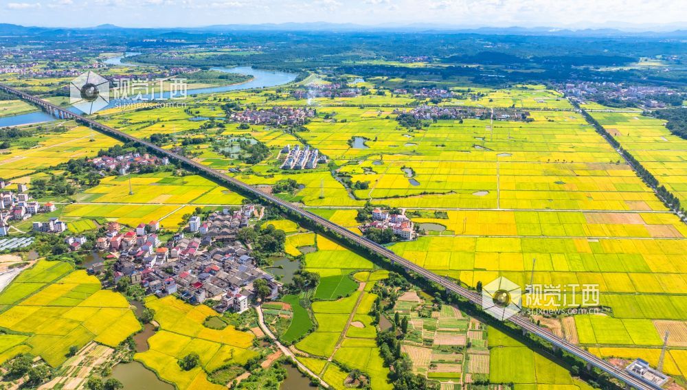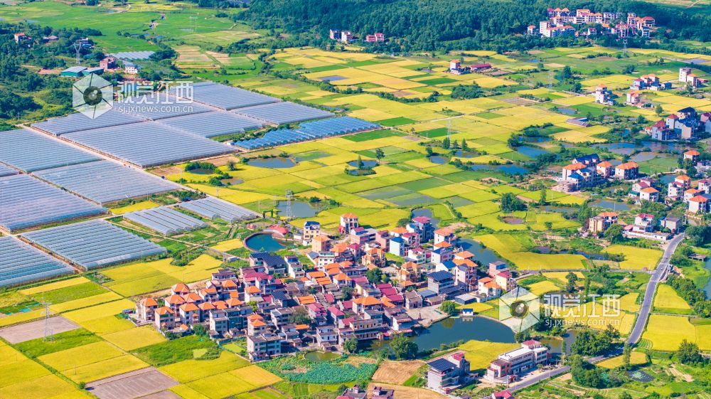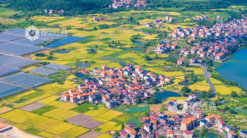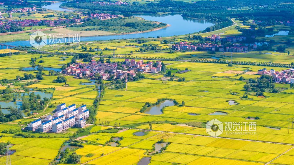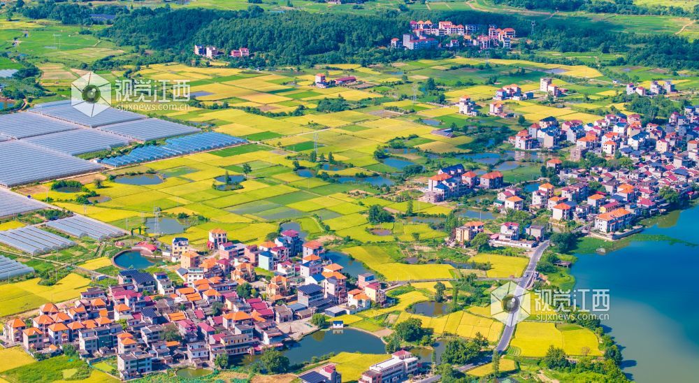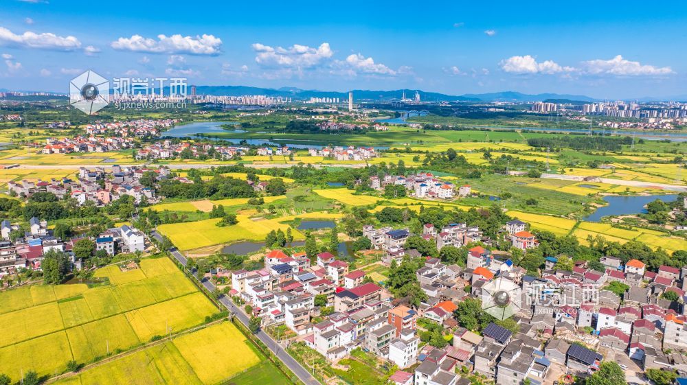 2025年7月2日,江西省吉安市吉州区曲濑镇稻谷进入收割期,金色稻田与美丽乡村构成一幅夏日丰收图景,美如画卷。