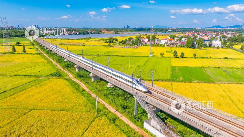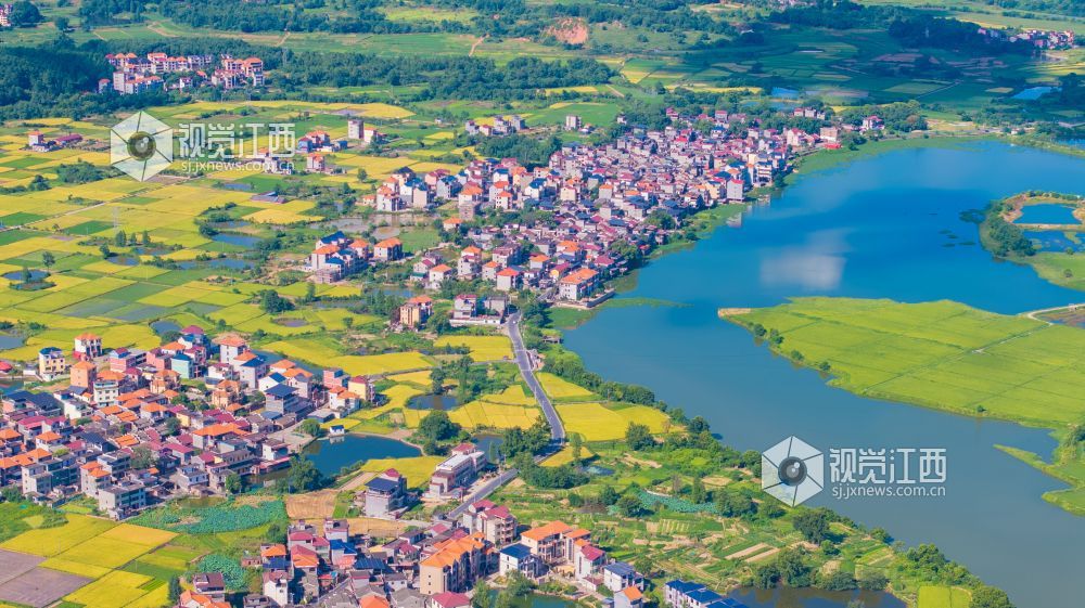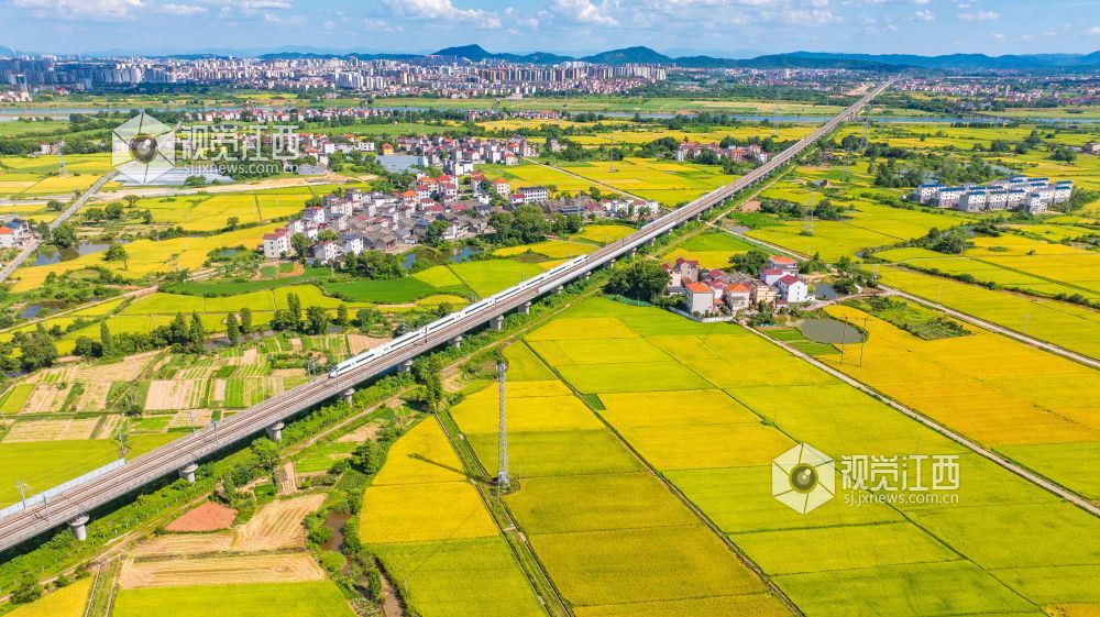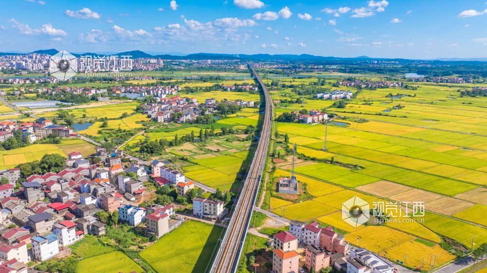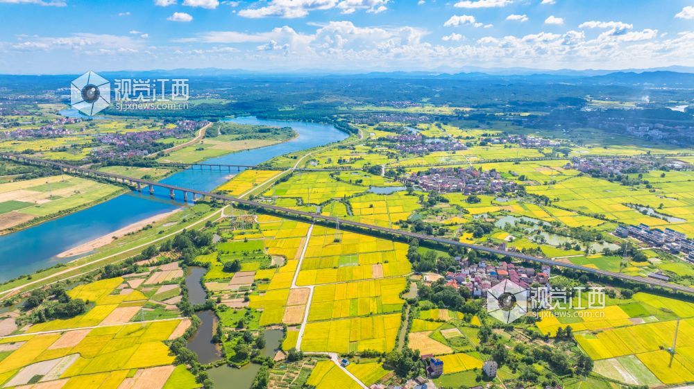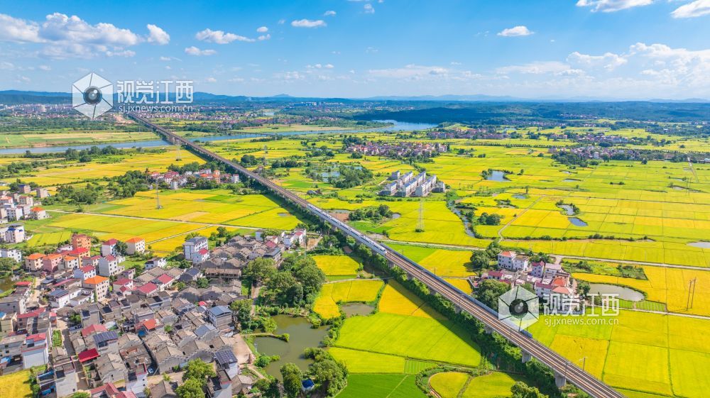 2025年7月2日,江西省吉安市吉州区曲濑镇稻谷进入收割期,金色稻田与美丽乡村构成一幅夏日丰收图景,美如画卷。
