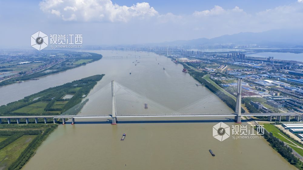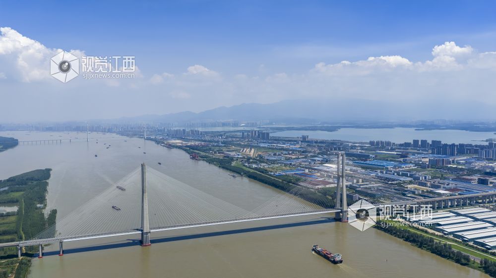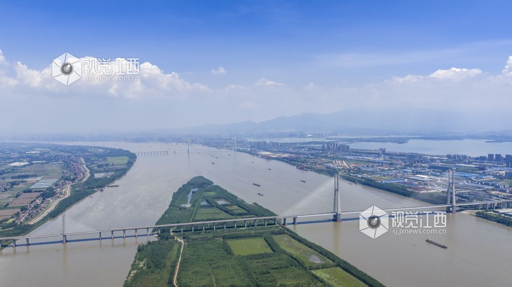 2025年7月4日,江西省九江经济技术开发区鳊鱼洲长江大桥附近江面上,各类船舶往来穿梭,有序航行。