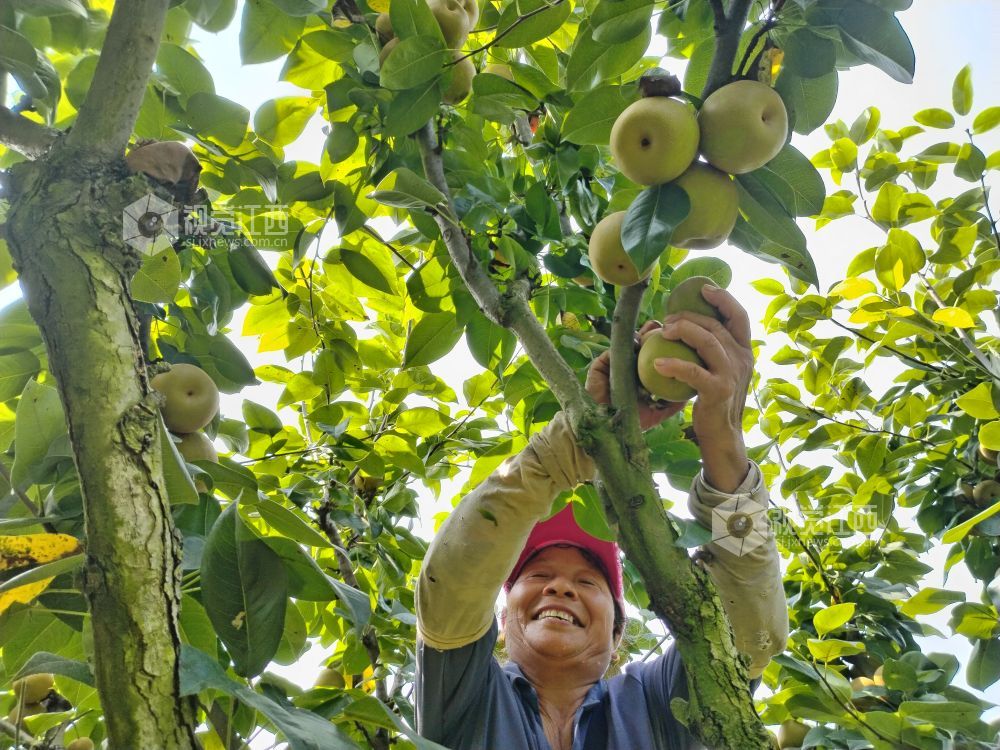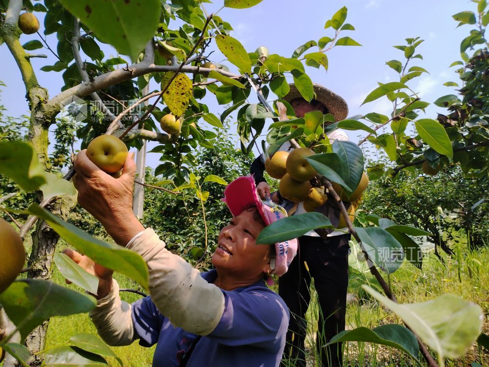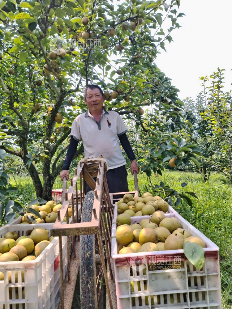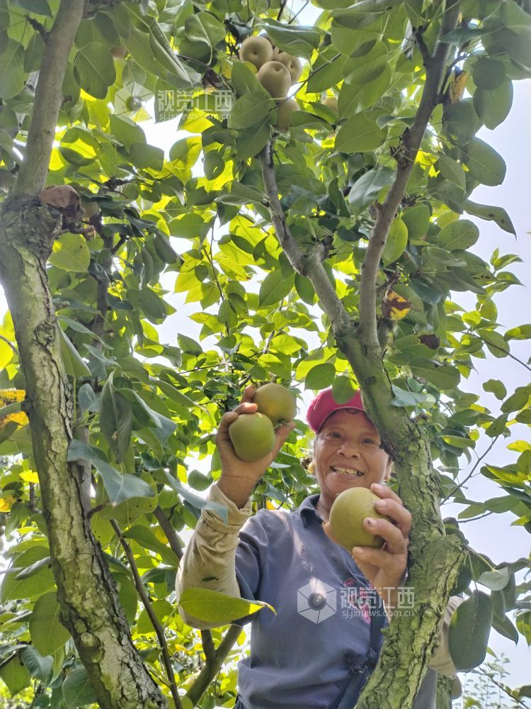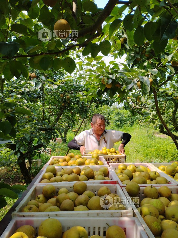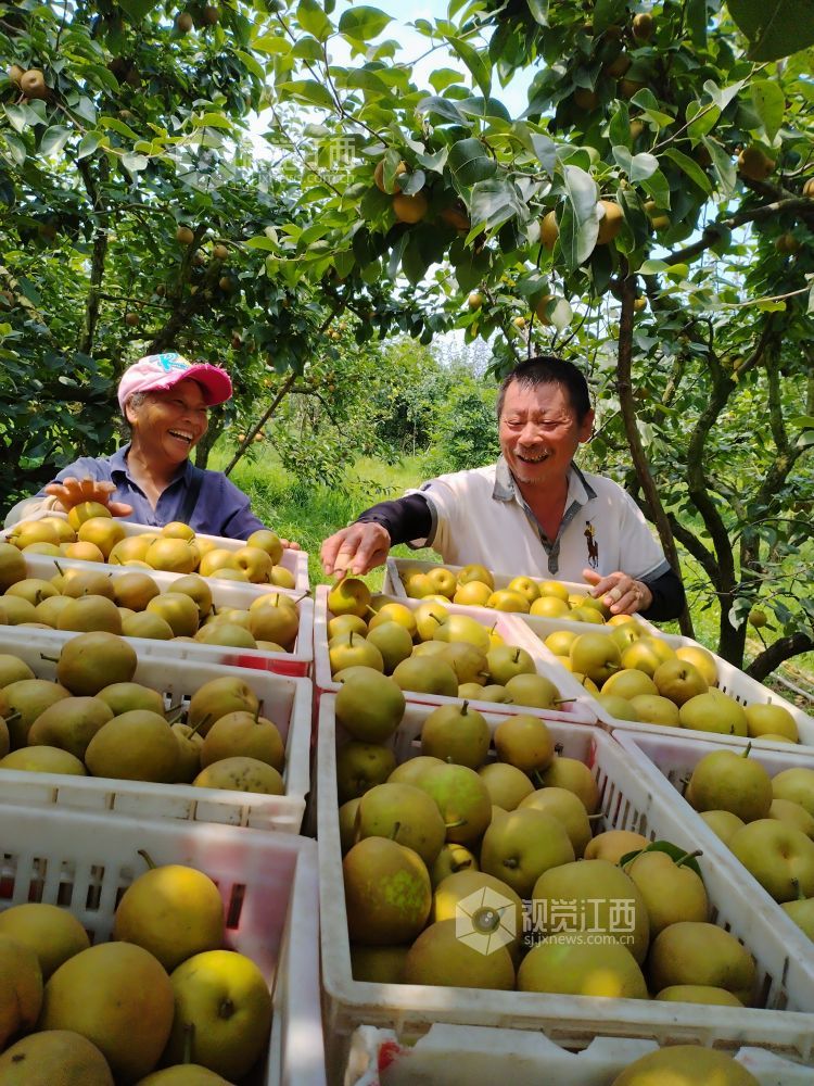 7月6日,吉安市泰和县苏溪镇上宏村翠冠梨基地,翠冠梨挂满枝头,个个圆润饱满、皮薄肉脆,散发出诱人的果香。村民正忙着采摘、搬运,呈现出一片喜人的丰收景象。