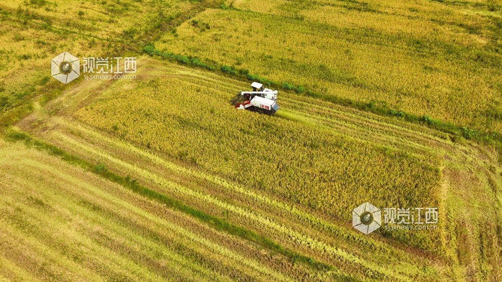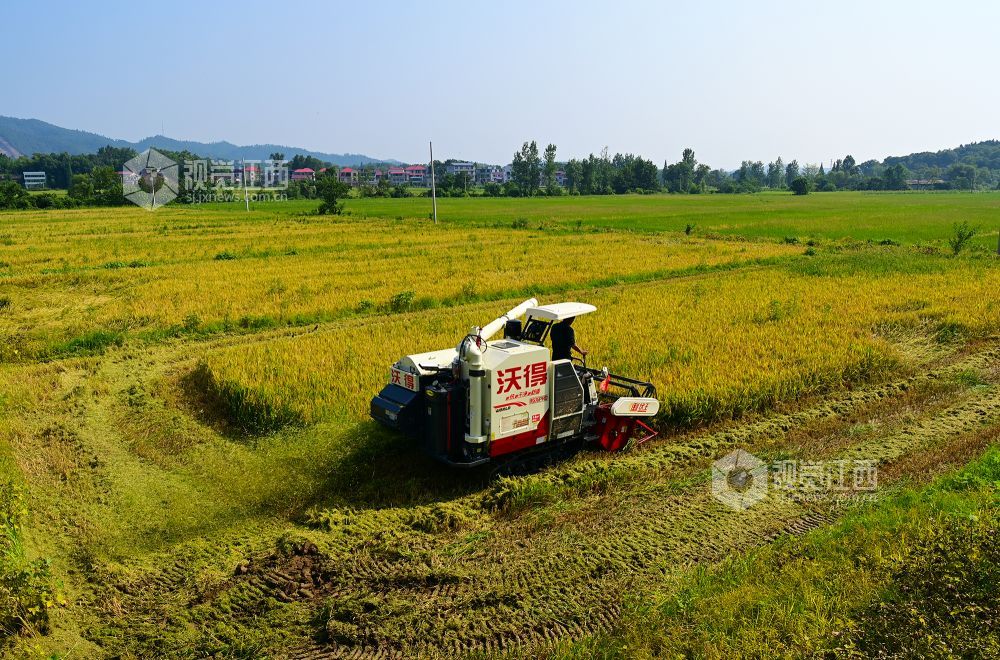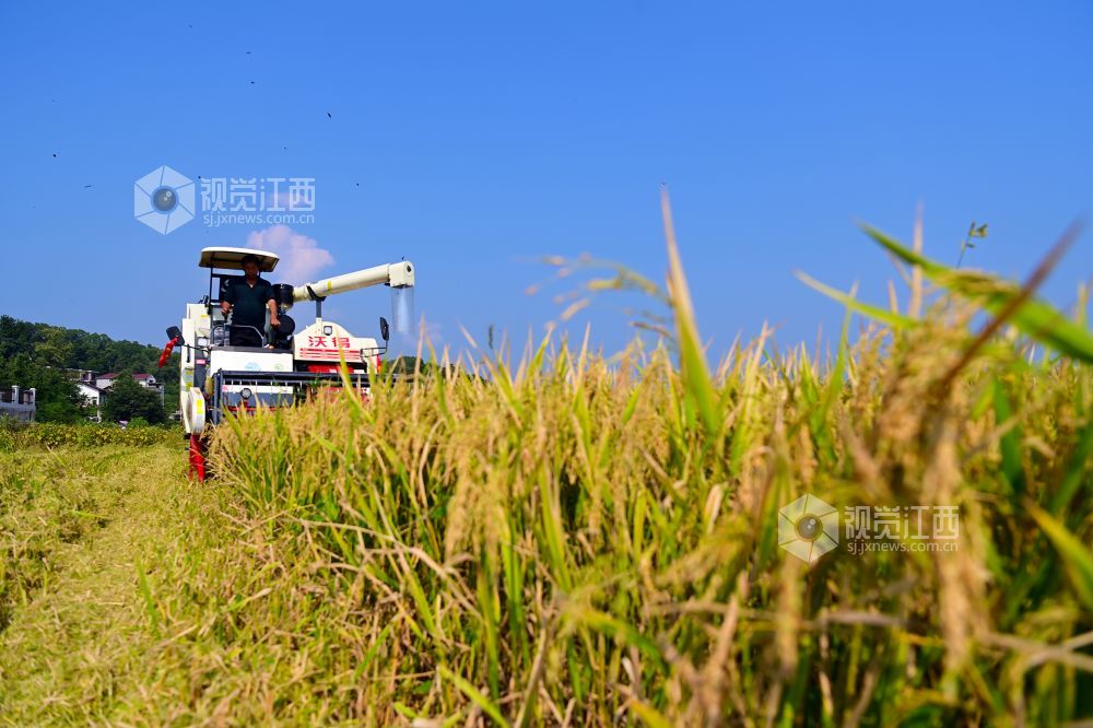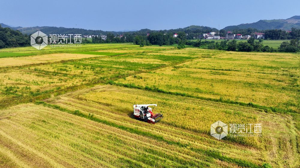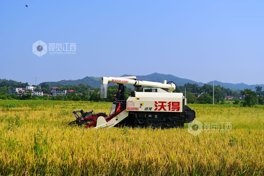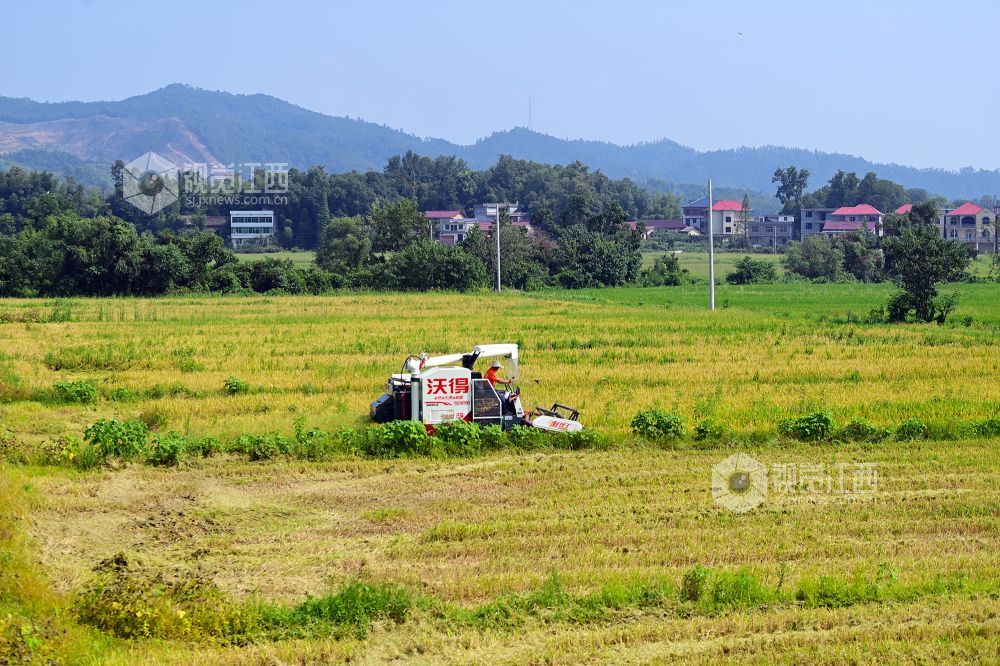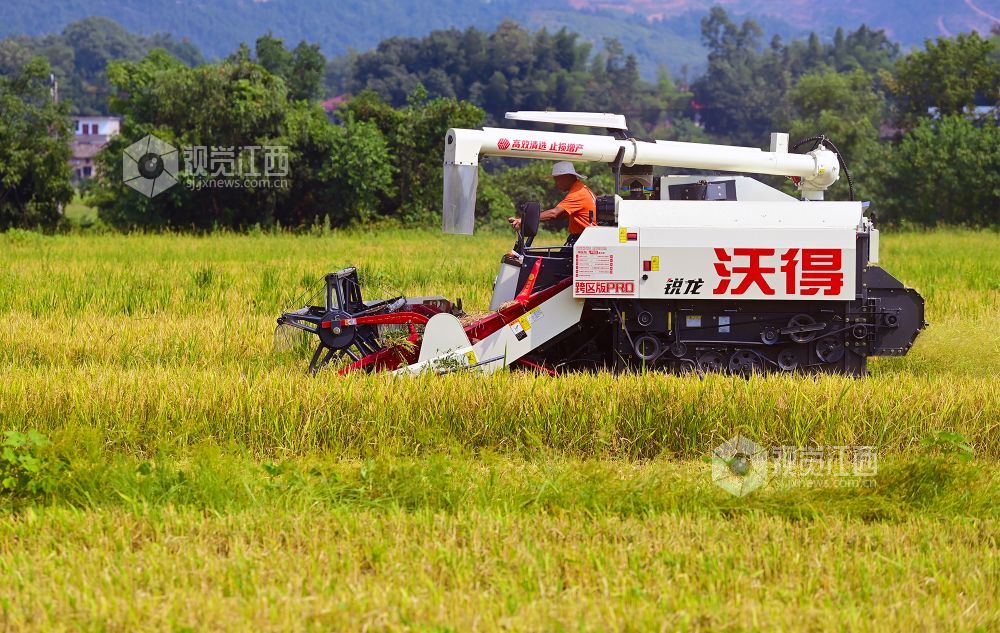 2025年7月8日,在江西省宜春市万载县马步乡宝石村,农民正驾驶农机收割早稻。