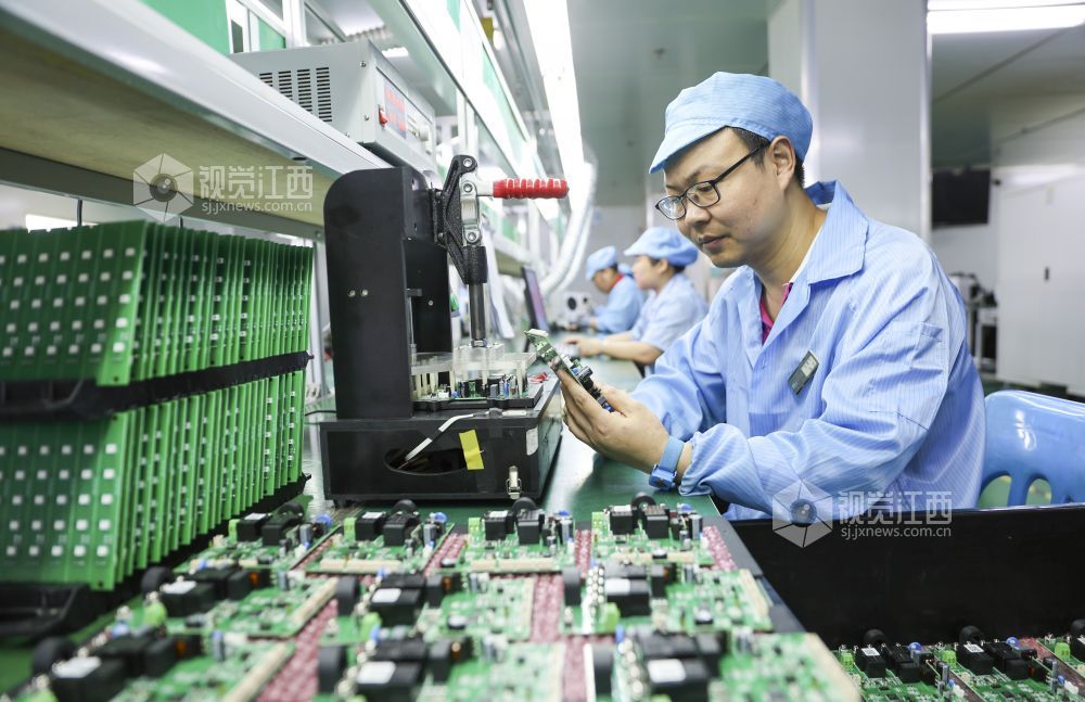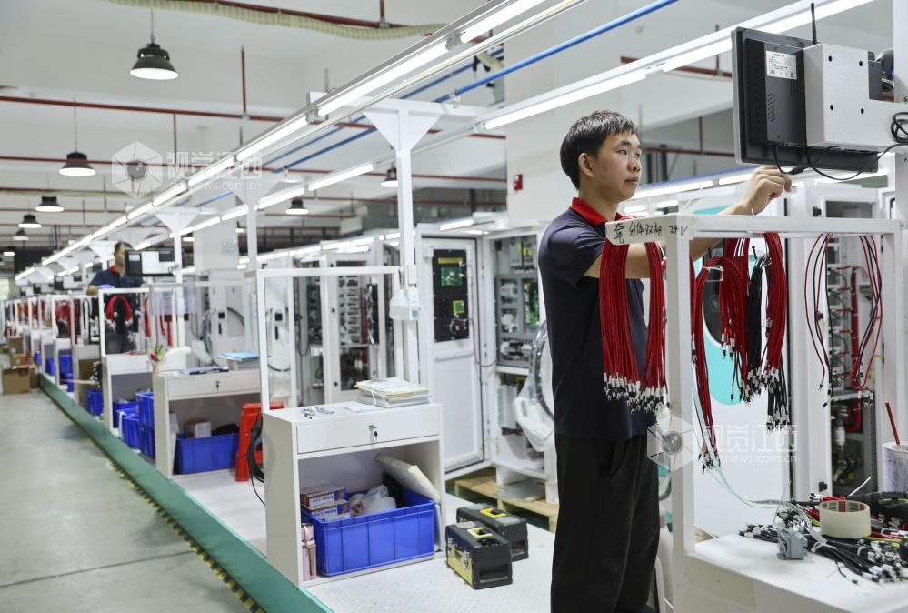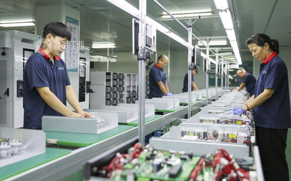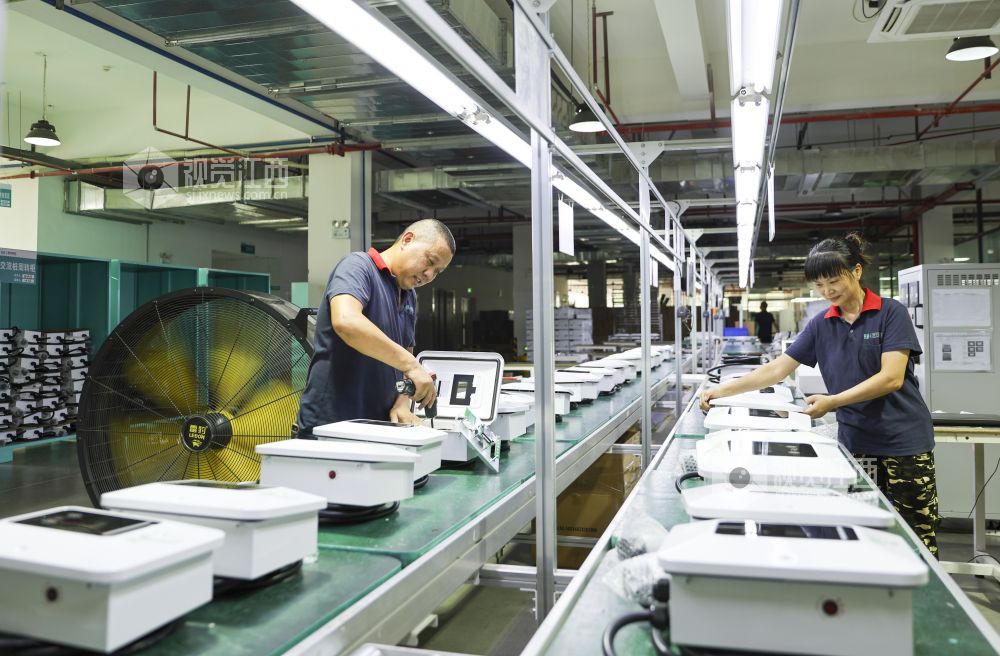 2025年7月9日,江西省瑞昌经开区智造小镇江西瑞华智能科技有限公司生产车间内,工人正加紧生产新能源汽车智能无线充电桩。