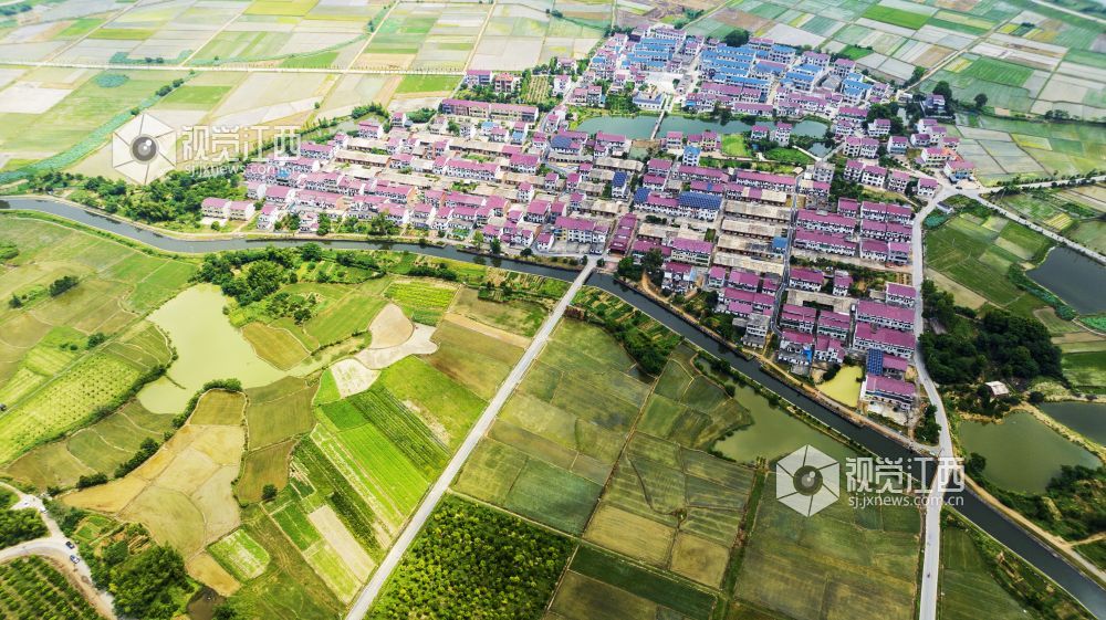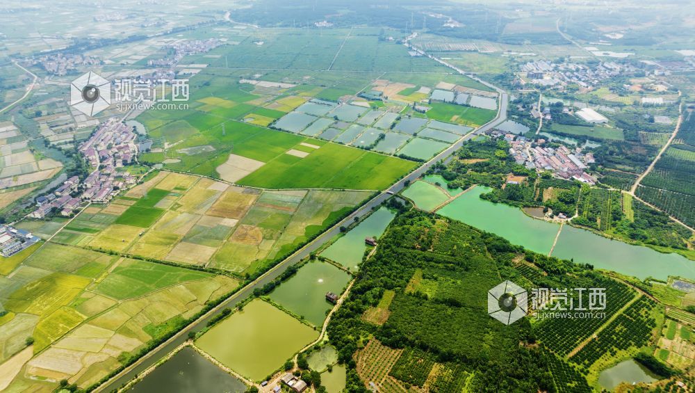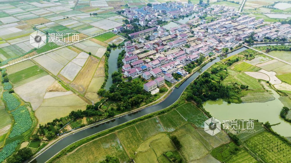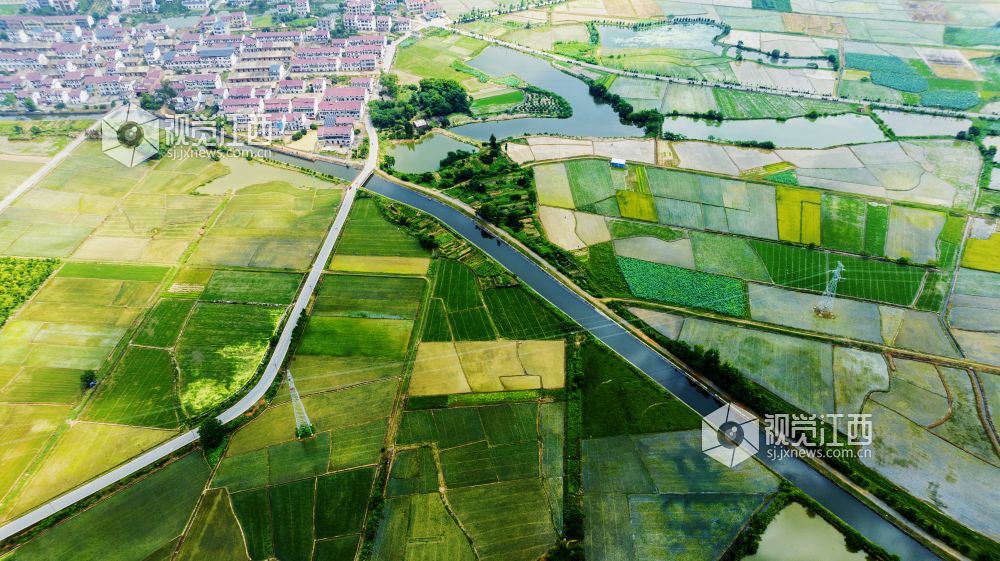 7月13日,在江西省新余市渝水区罗坊镇院前村的袁惠渠灌区,一江清水自西向东横贯村庄田野,村民们正在田野里抢收早稻抢种晚稻。