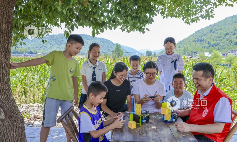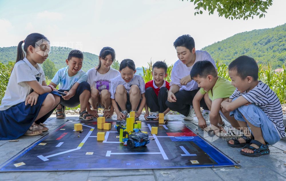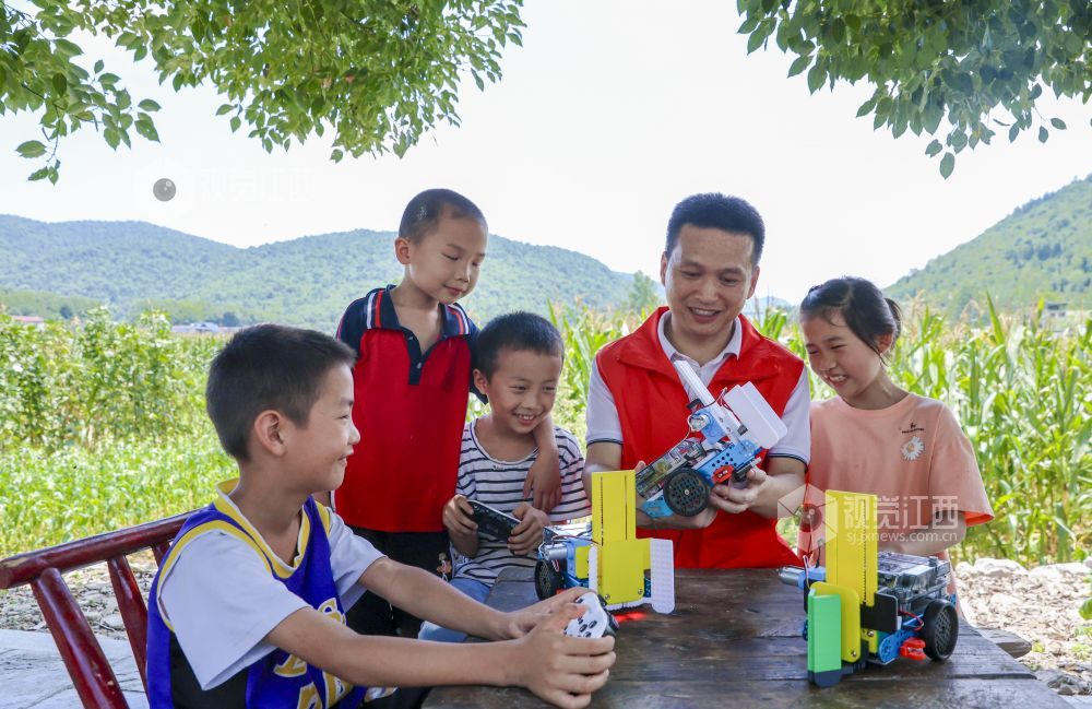 2025年7月14日,江西省瑞昌市肇陈镇建坪村,孩子们在学习机器人知识。