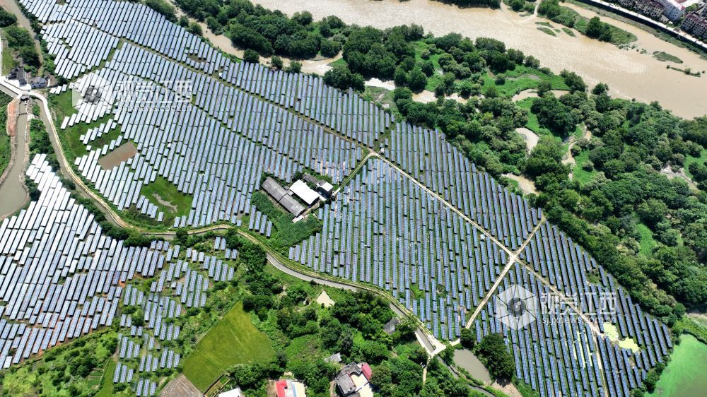 2025年7月16日,俯瞰江西遂川县于田镇大片光伏板在荒山、荒坡、荒滩上铺展,勾勒出生态与经济共赢的新图景。