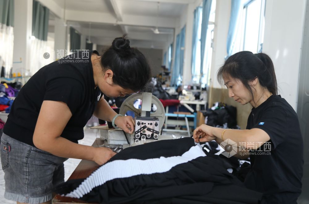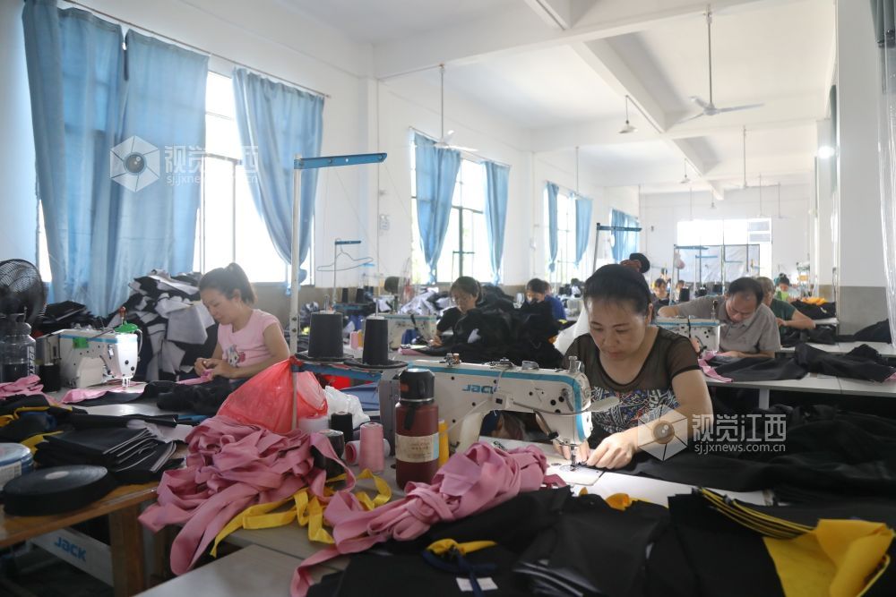 7月16日,江西省莲花县良坊镇梅州村乡村振兴车间,村民正在忙着加工生产毕业服装,出口欧美国家。