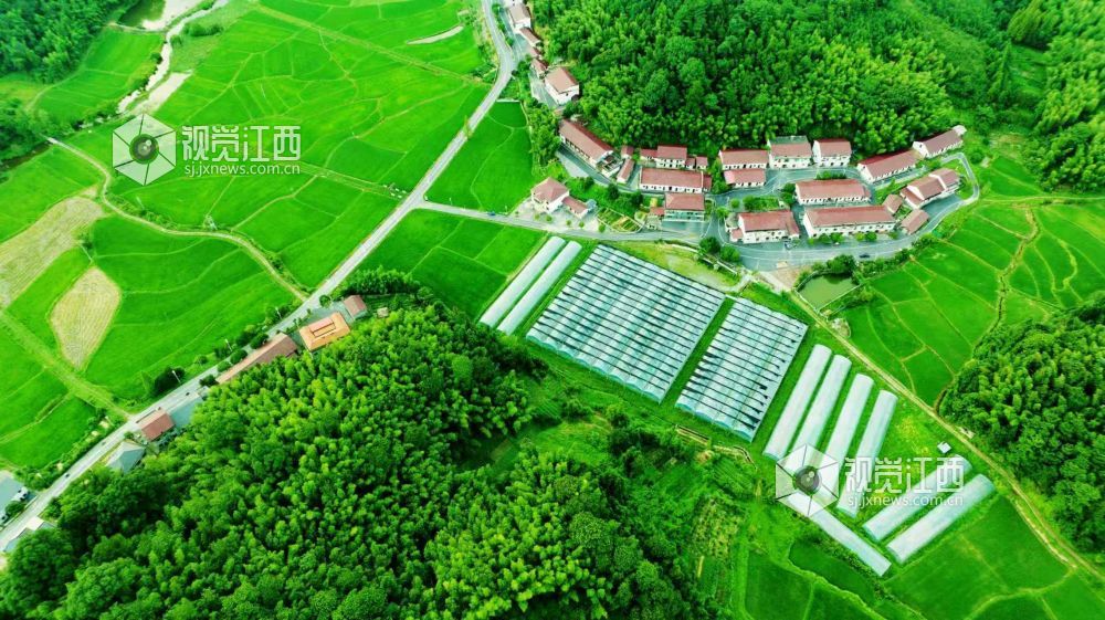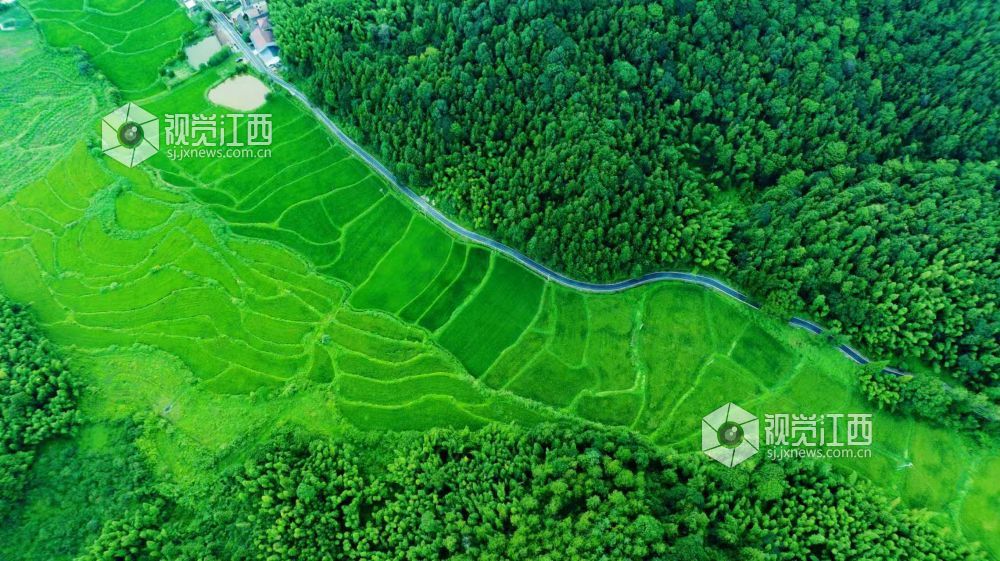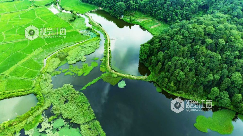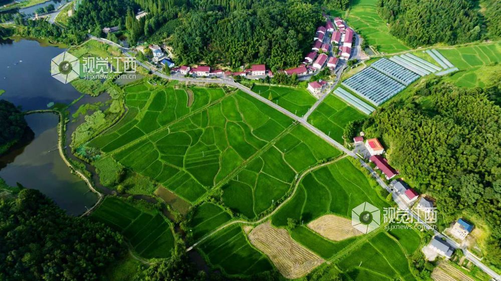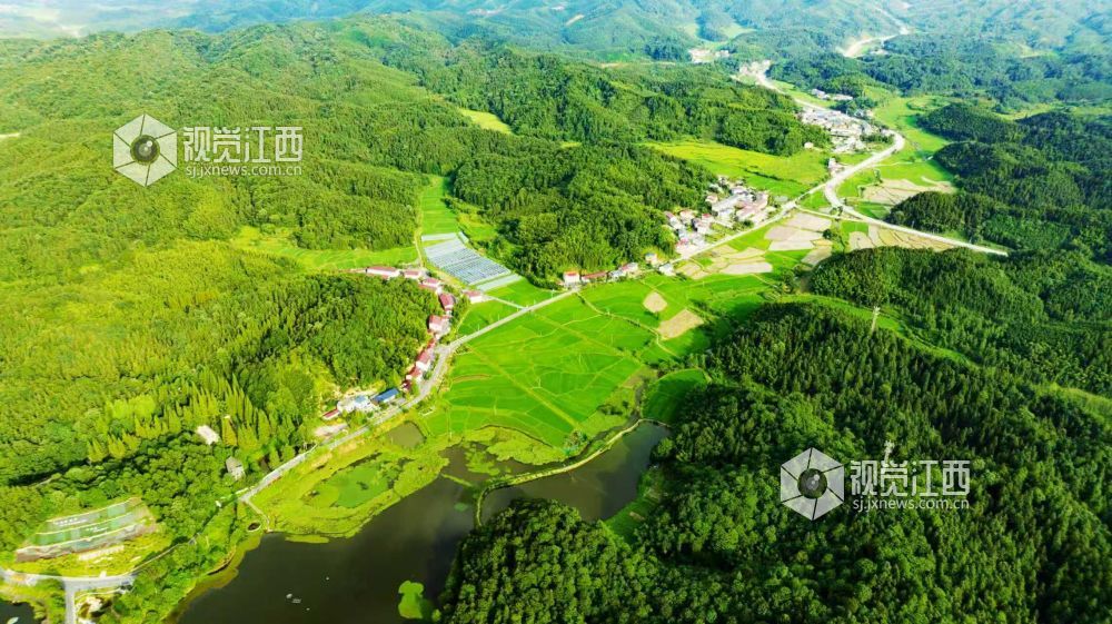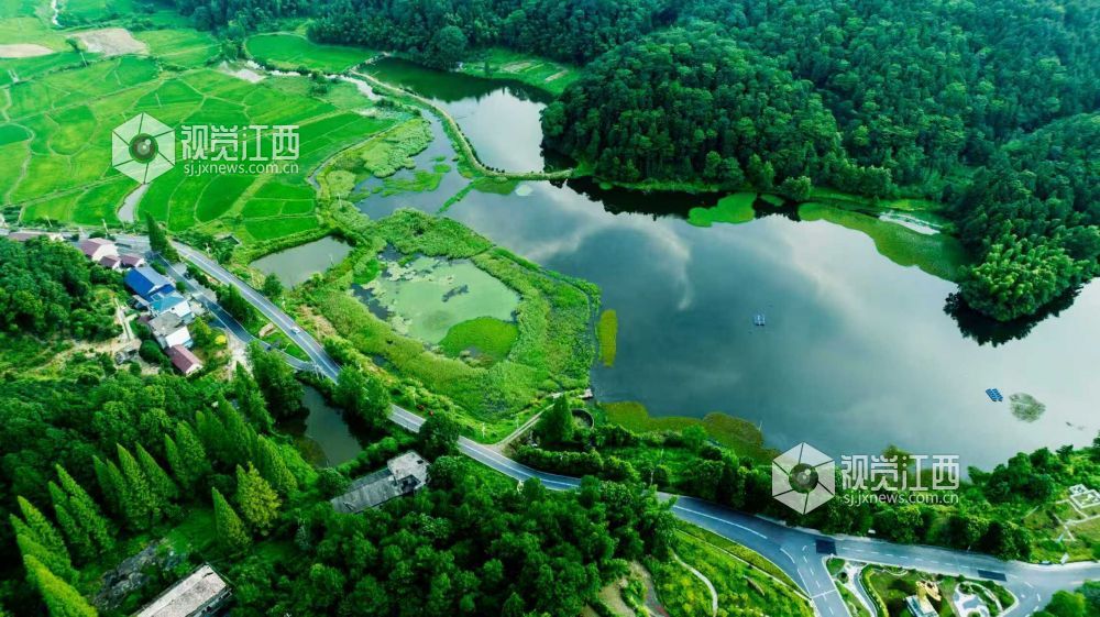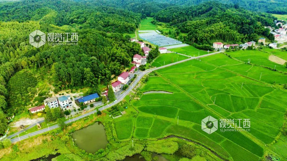 7月16日,江西省新余市仙女湖区凤凰湾办事处东坑村,在阳光的映照下,绿色的生态田园与道路、村庄、湖水、山峦相映成趣,构成了一幅美丽的乡村生态画卷。