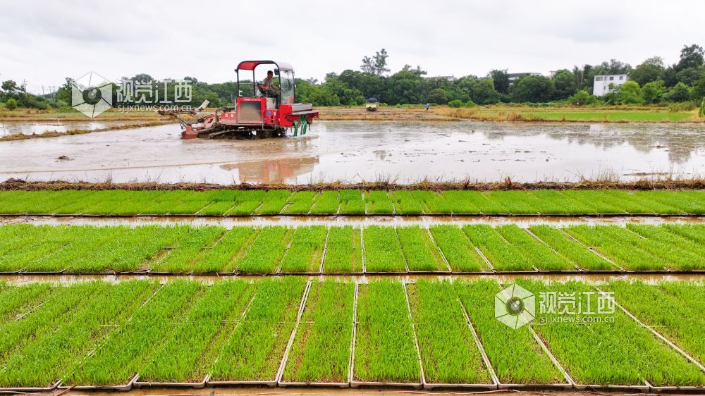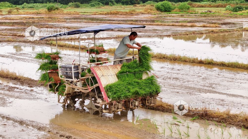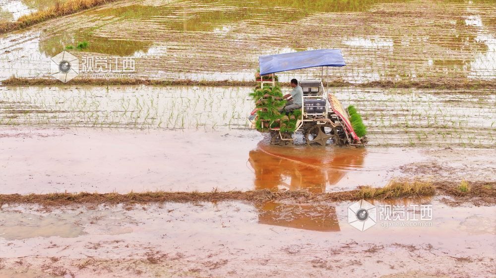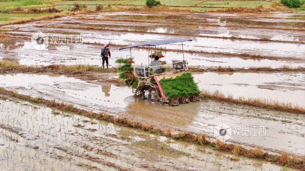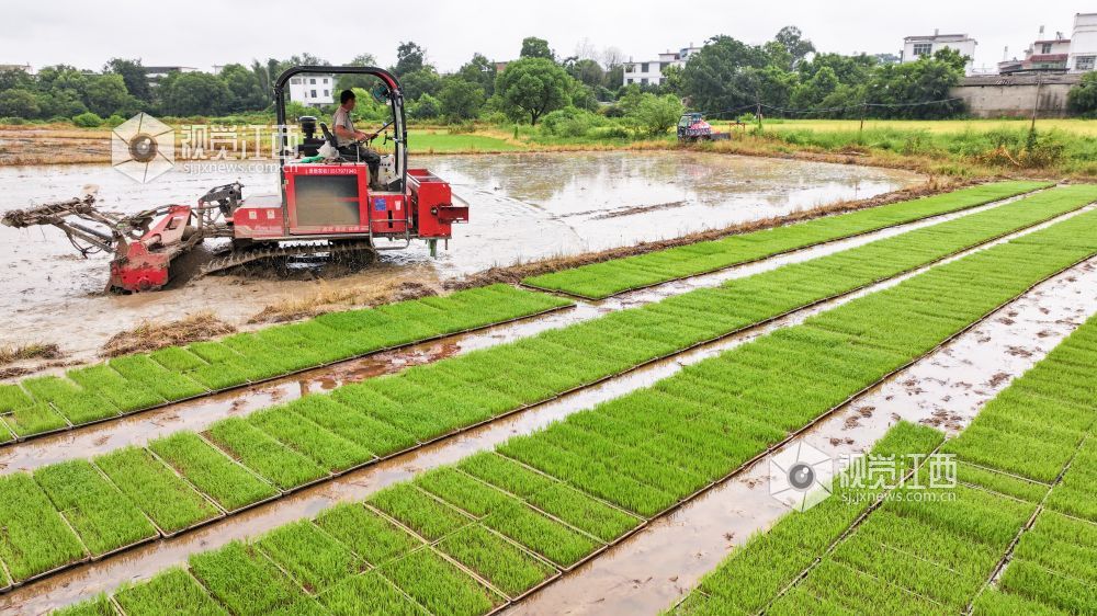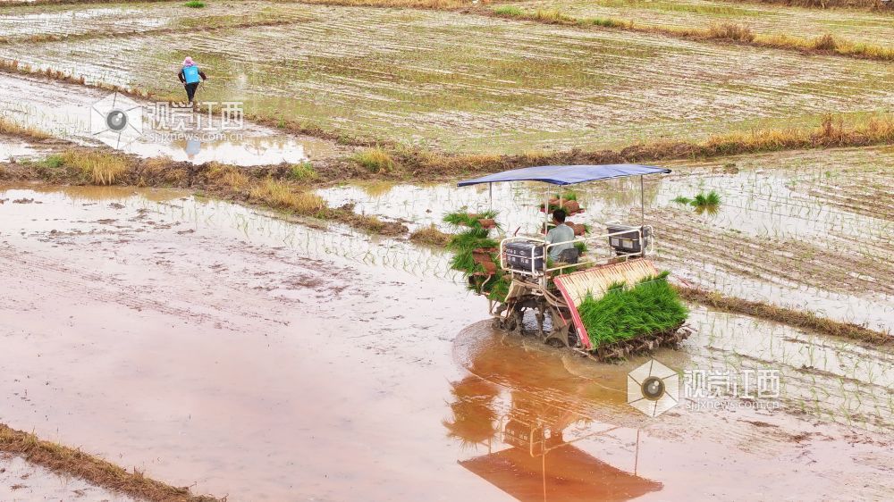 2025年7月23日,江西省赣州蓉江新区潭口镇坞埠村,农民抢抓农时,忙着田间翻耕和晚稻插秧等农事活动,田间地头一派繁忙景象。