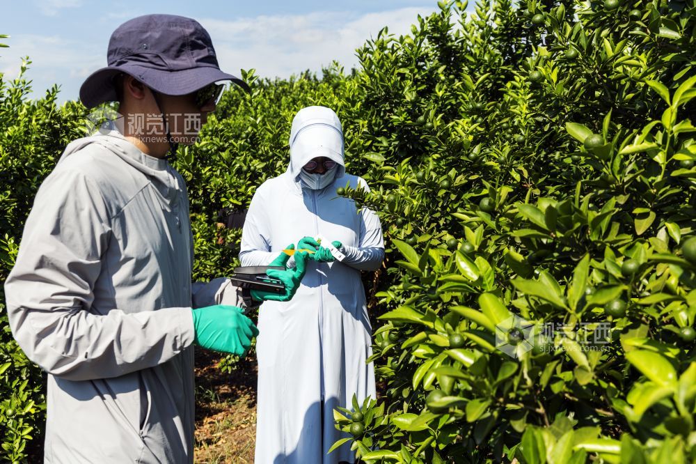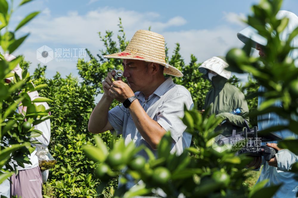 7月25日,在江西新余渝水区水北镇的一个蜜桔园里,果业技术人员与飞防工作人员正在进行新余蜜桔飞防试验示范,助力新余蜜桔健康生长。