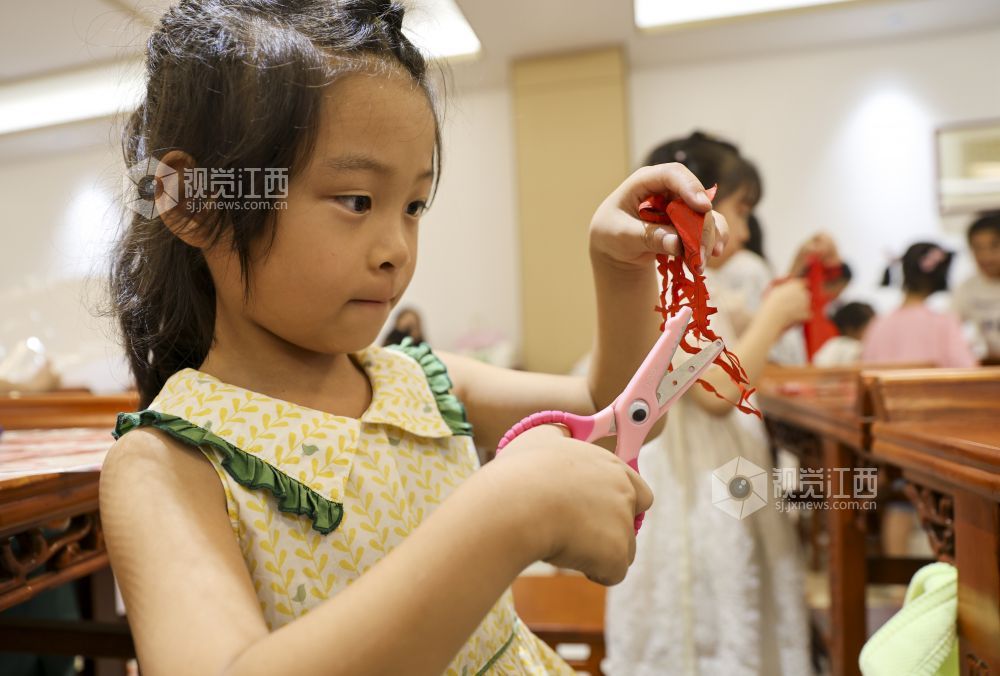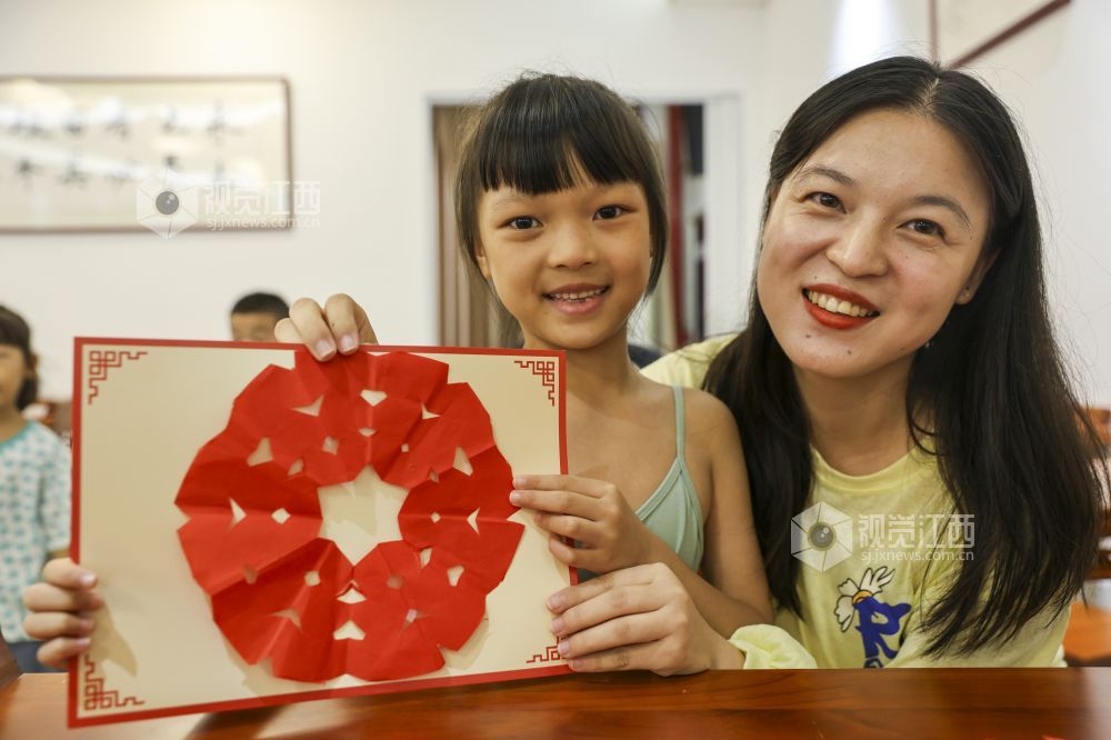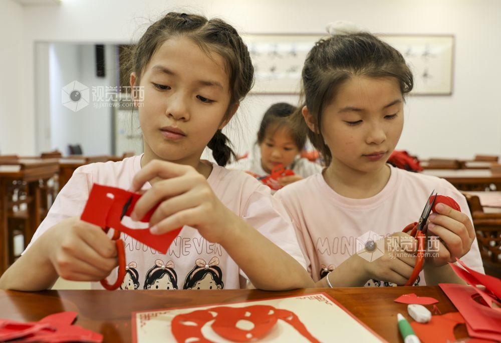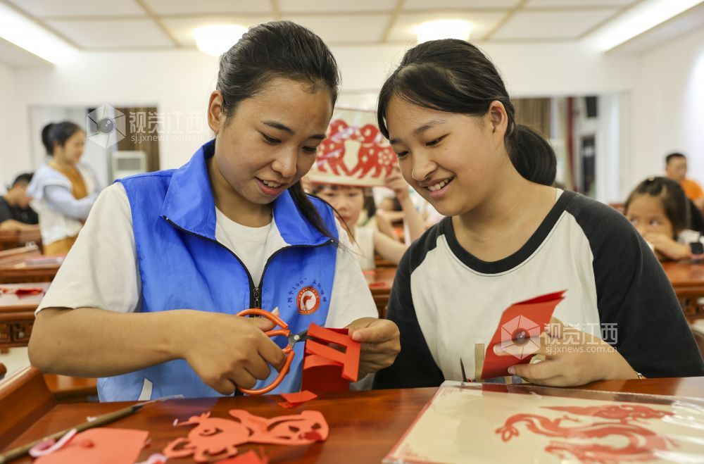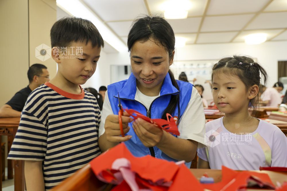 7月25日,江西省瑞昌市新时代文明实践中心,小朋友在非遗导师的指导下学习剪纸。