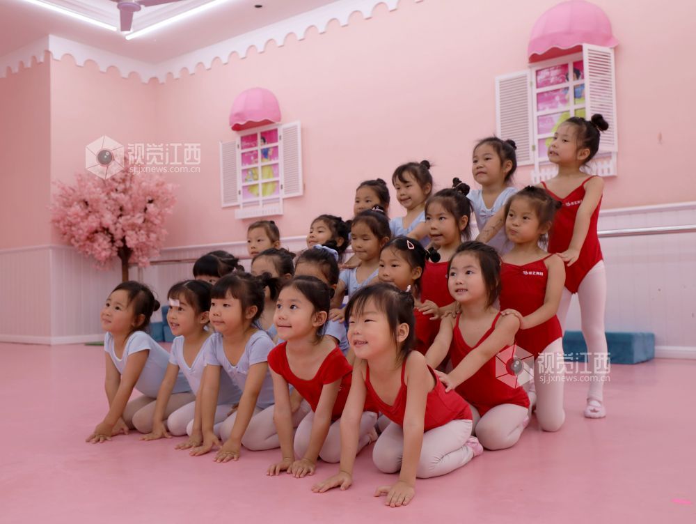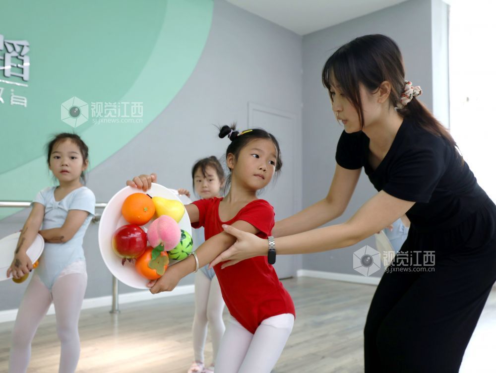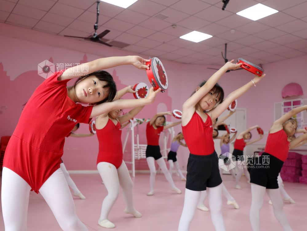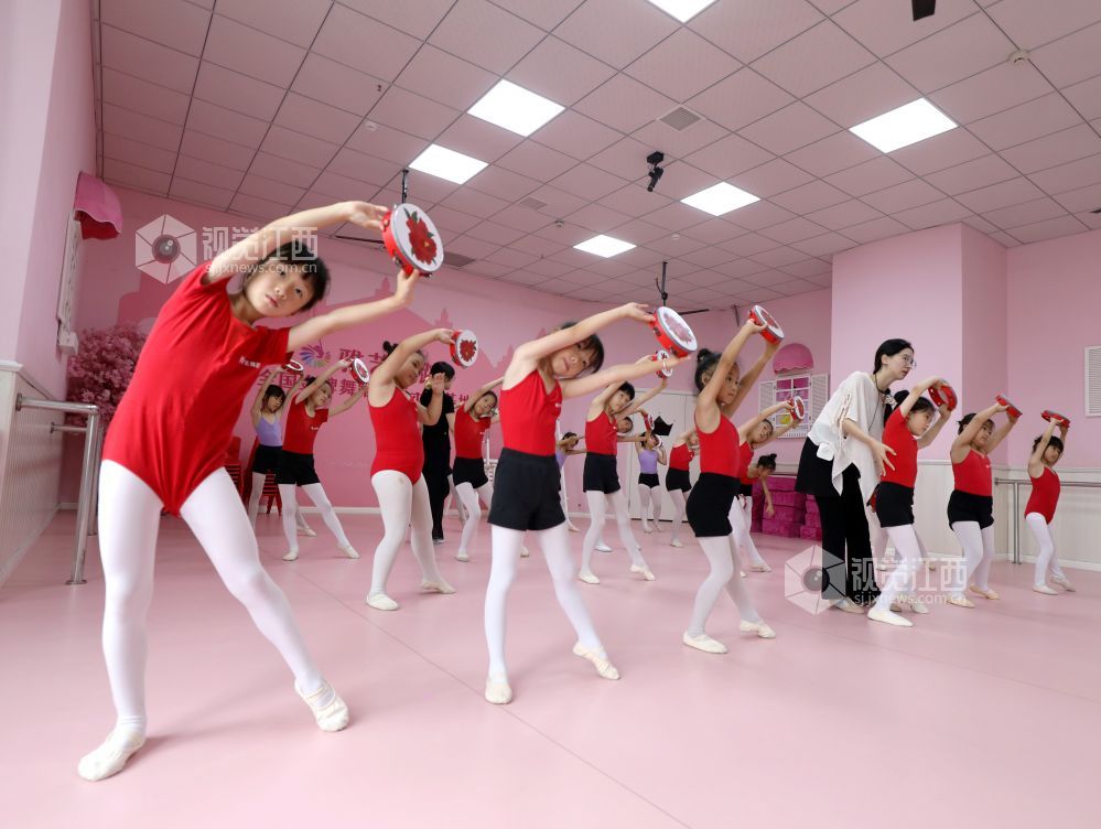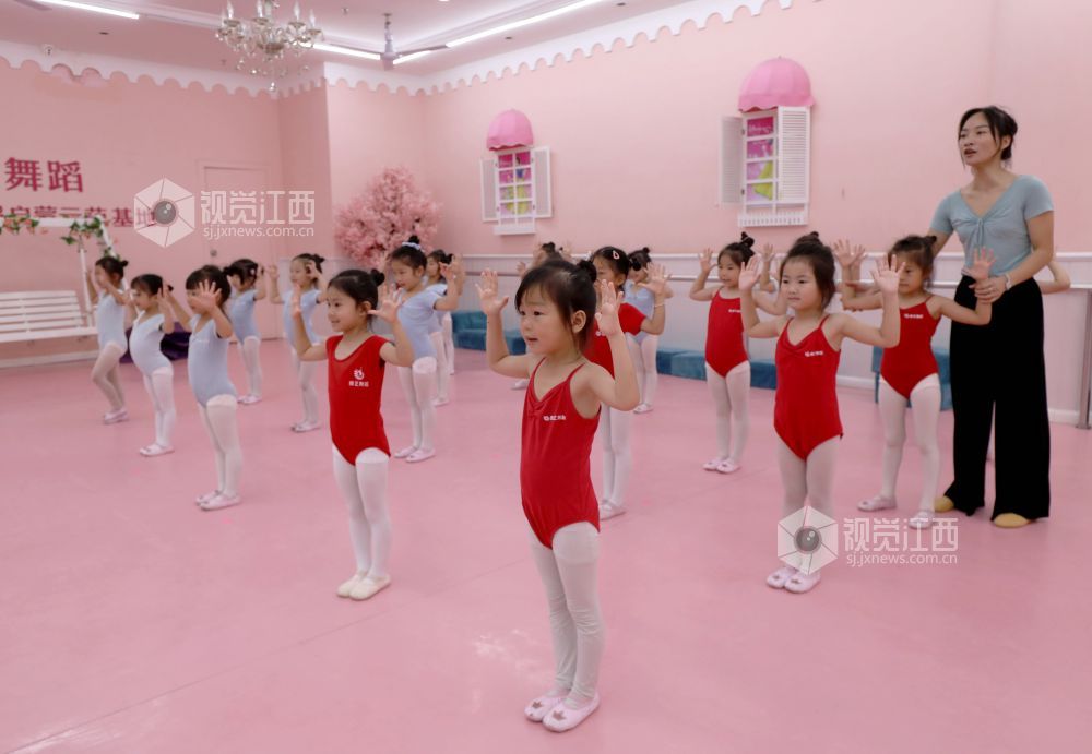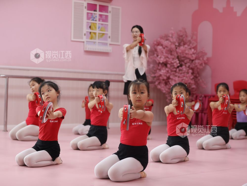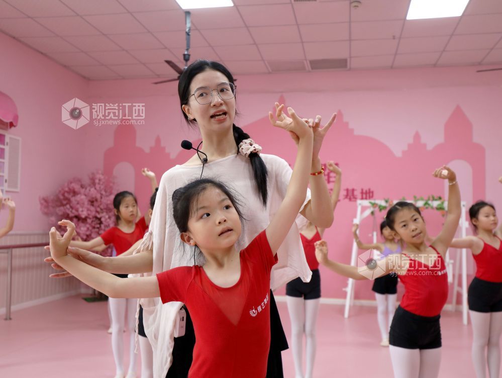 2025年7月25日,在江西省分宜县一家舞蹈艺术培训中心舞蹈训练房里,孩子们在老师的指导下练习舞蹈动作。暑假期间,不少孩子参加舞蹈培训,感受艺术魅力,快乐度暑假。