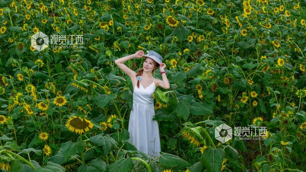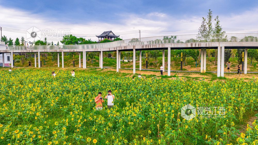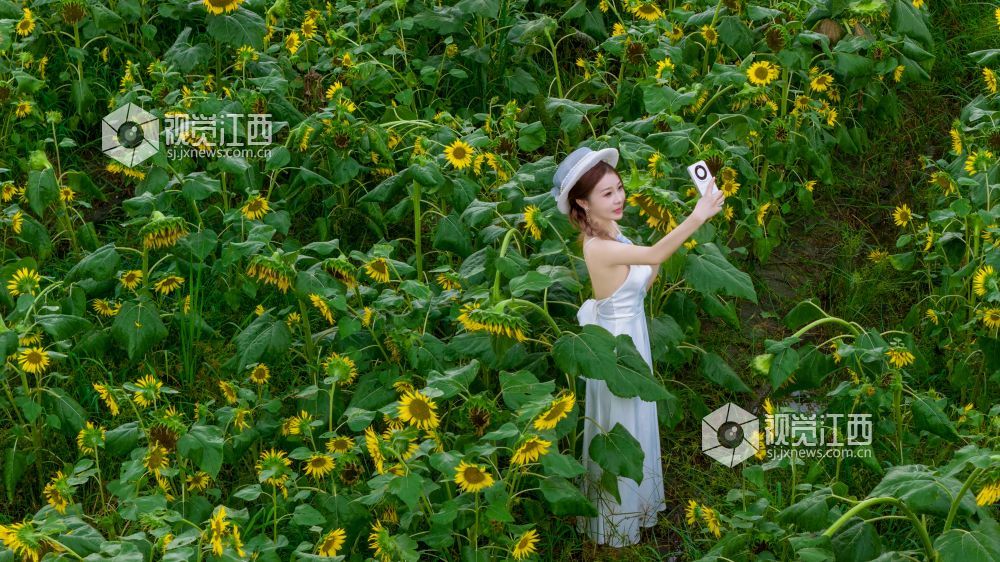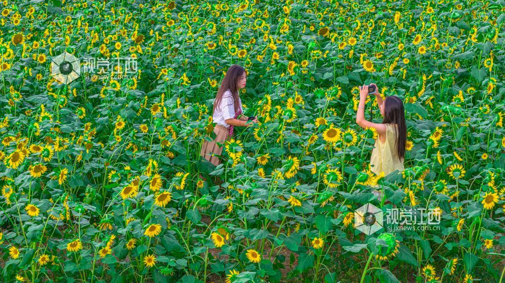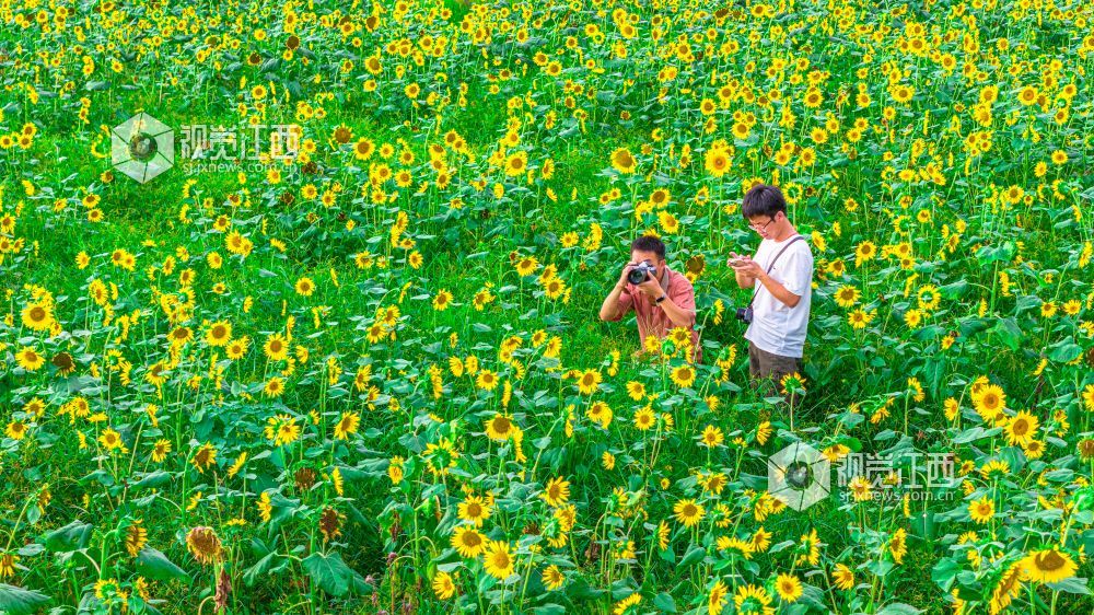 7月26日,江西省吉安市永丰县向日葵花田进入盛放期,金灿灿的花海里,游客们纷纷驻足拍照留念,定格与花海的美好瞬间。