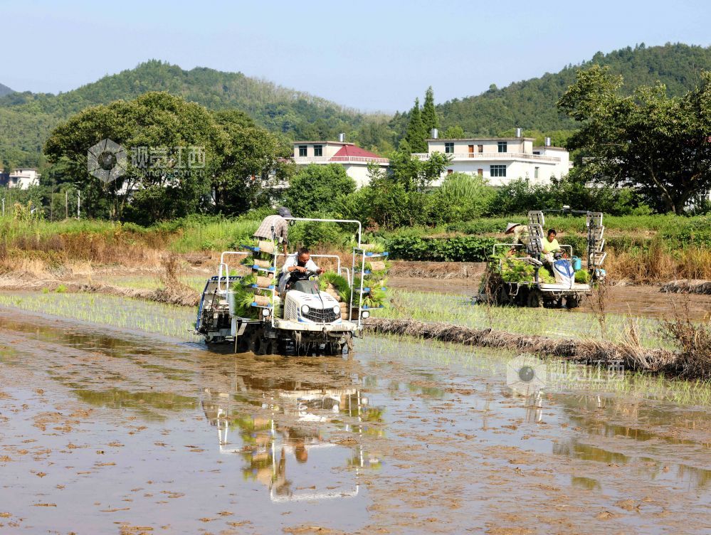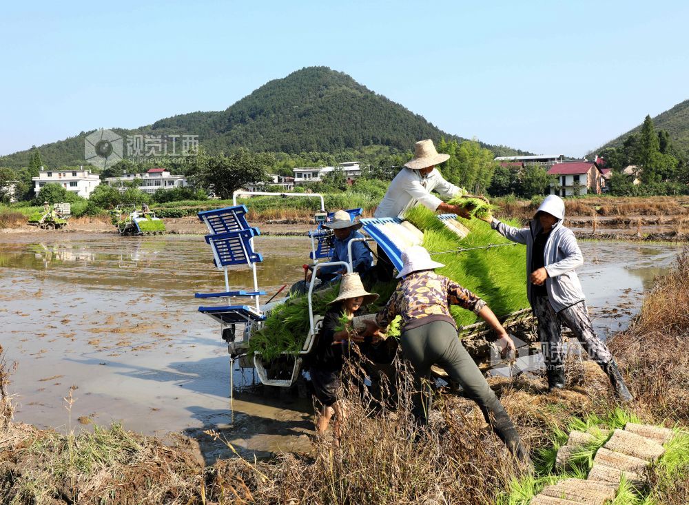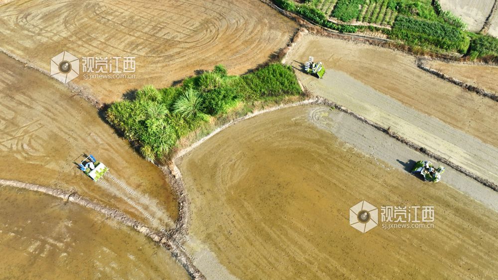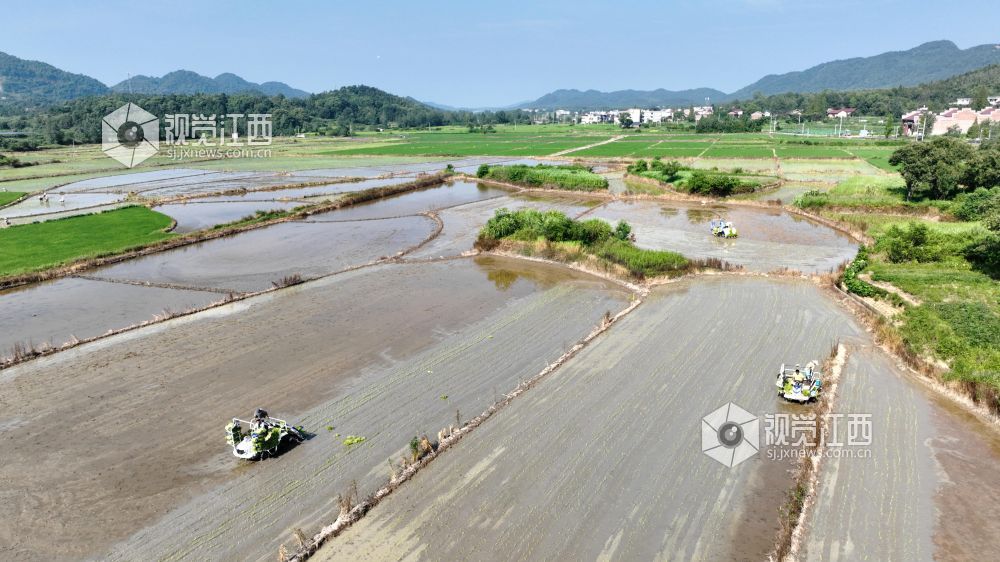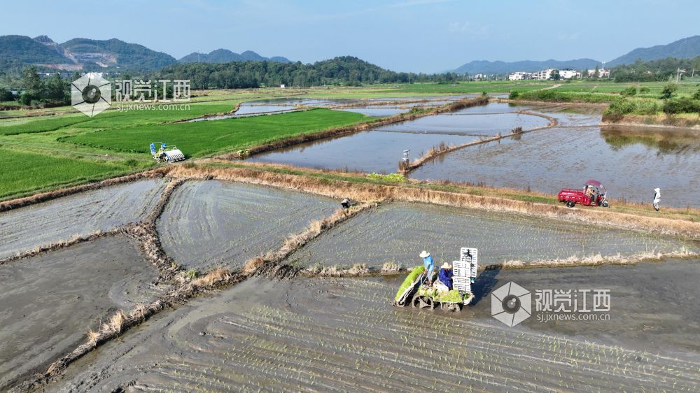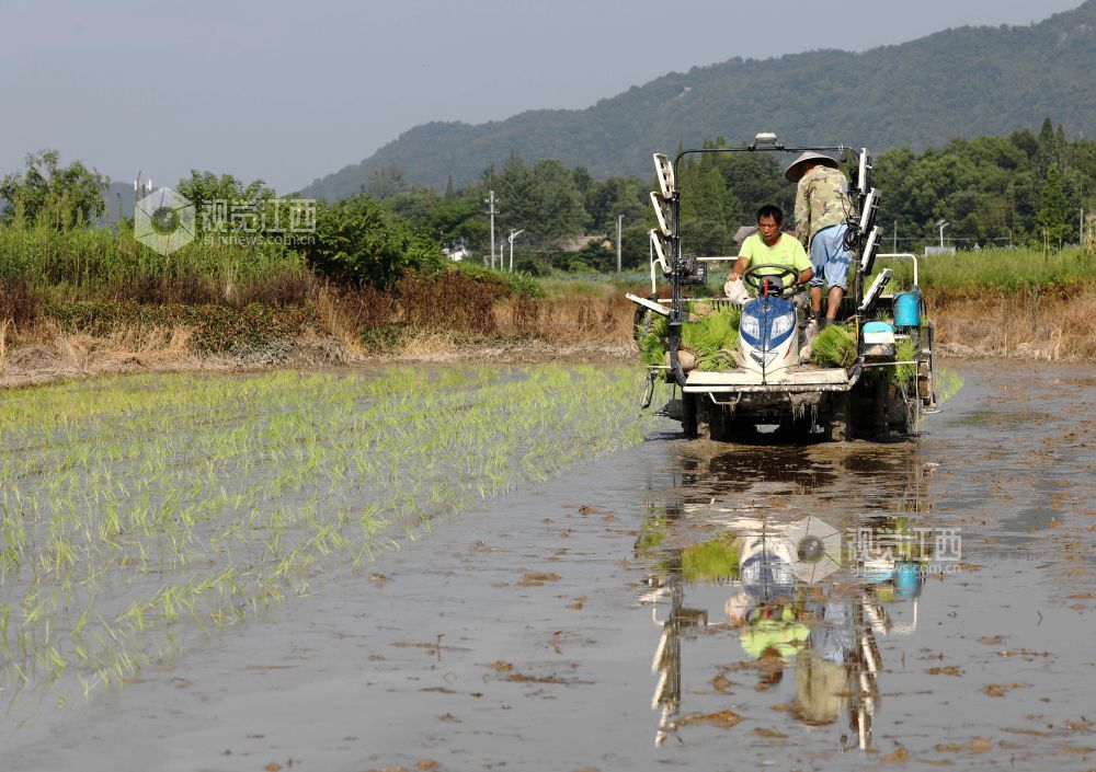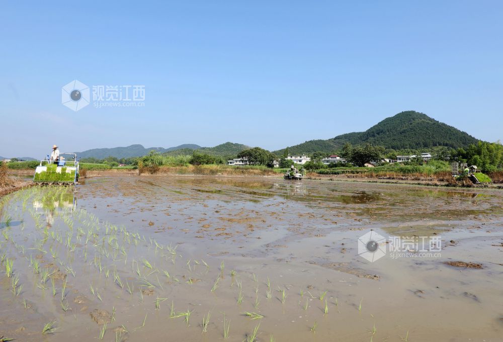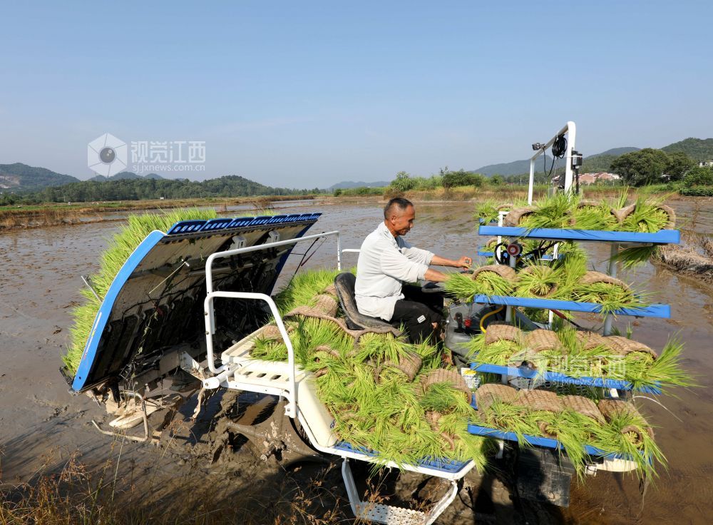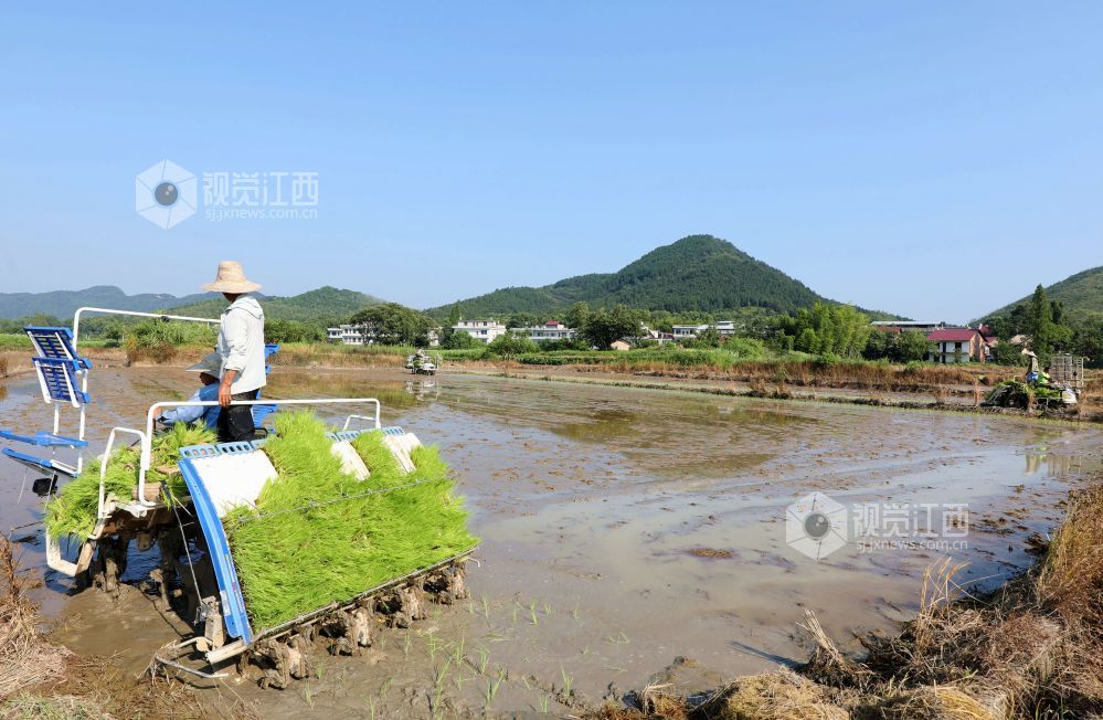 2025年8月1日,江西省分宜县高岚乡夏塘村,农机手驾驶插秧机在田间抢插晚稻秧苗。