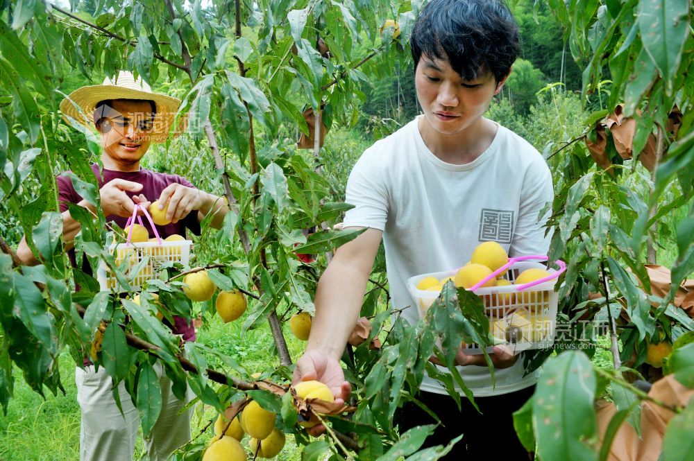 2025年8月3日,江西省德兴市大茅山梧风洞景区员工在开心帮助顾客采摘订购的新鲜黄桃。