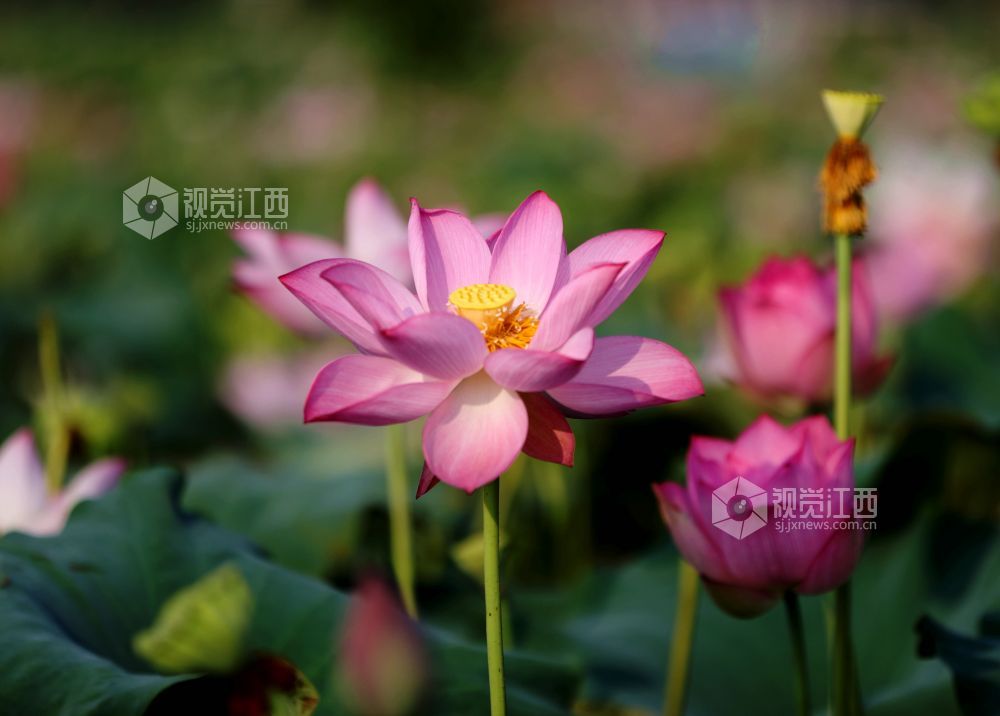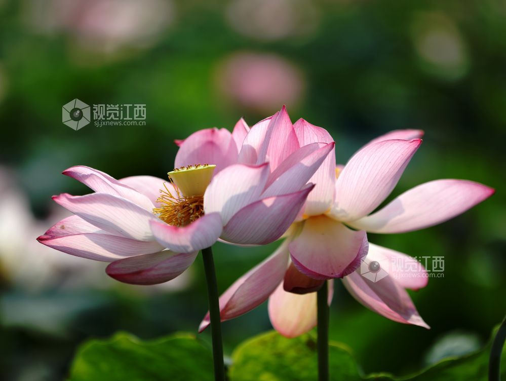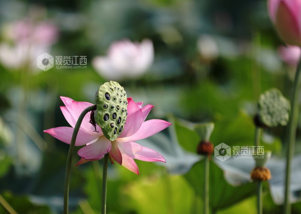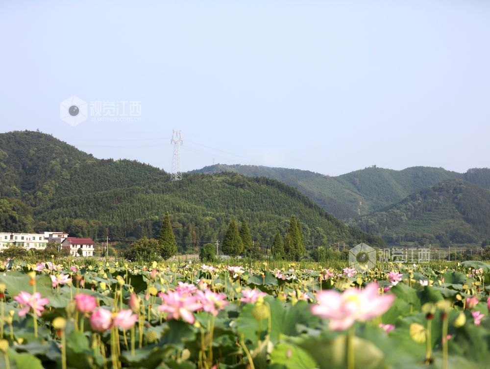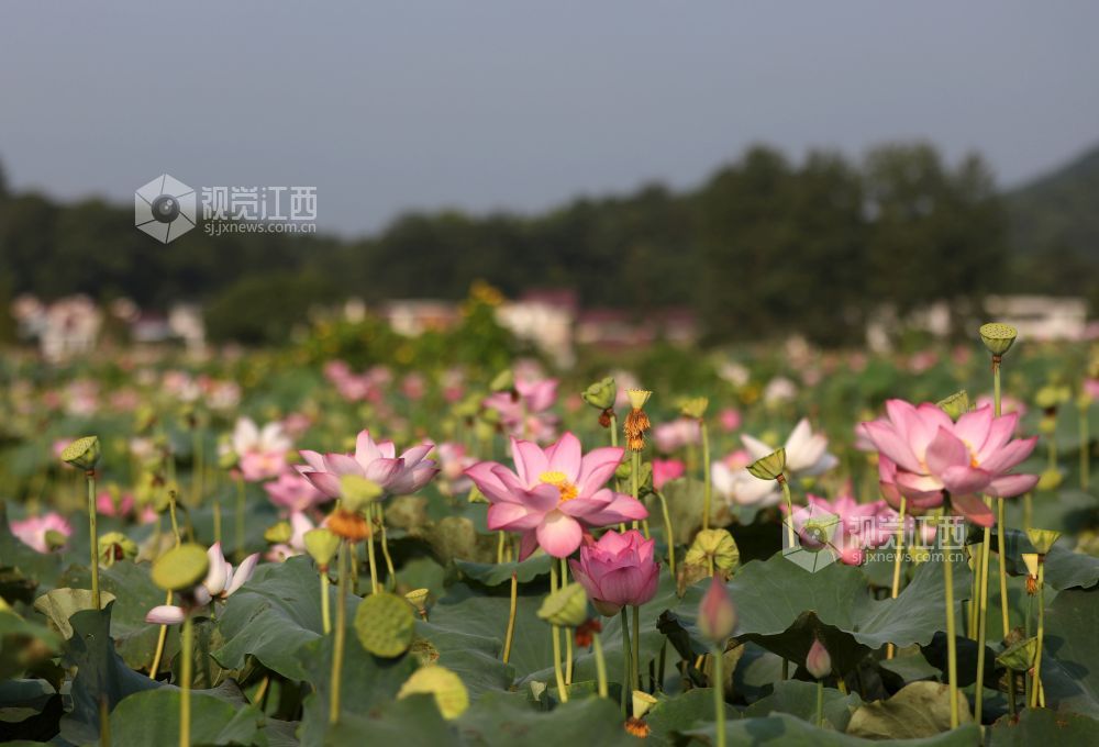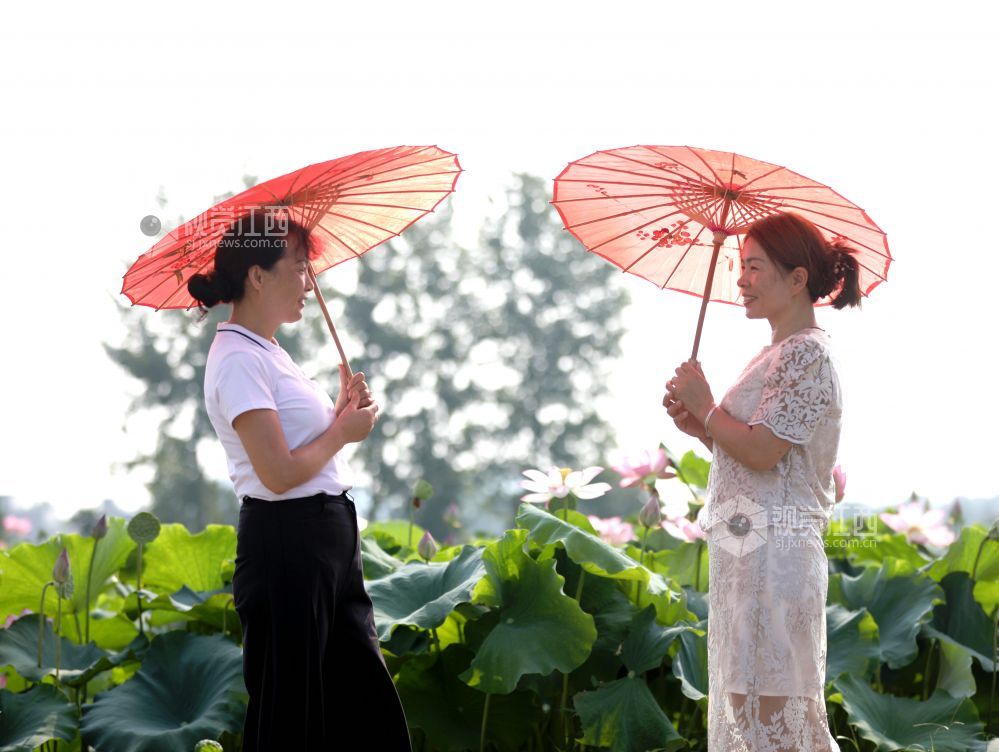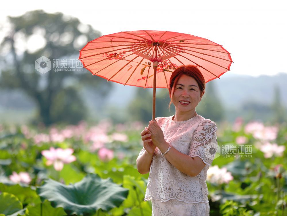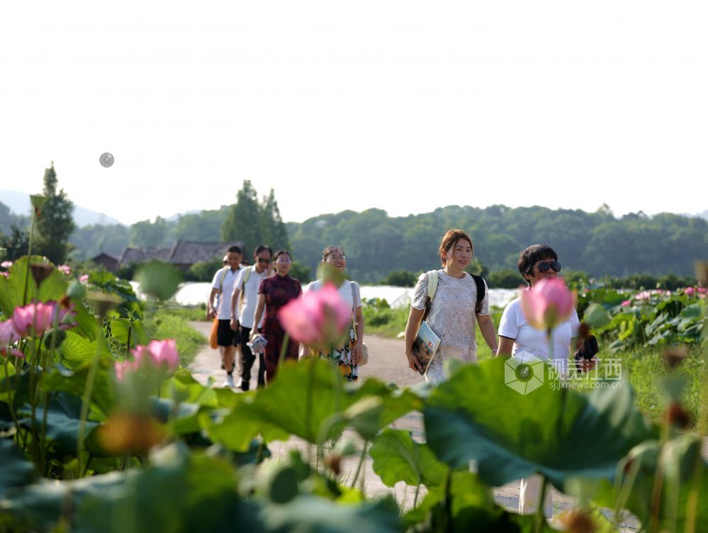 2025年8月3日,游客正在荷花基地赏荷拍照。炎炎夏日,赏荷正当时。江西省分宜县凤阳镇上村村的荷花盛放,亭亭玉立,娇艳欲滴,在阳光的照耀下,与村庄、远山相映成趣,构成一幅幅夏日里的独特画卷,吸引众多游客前来游玩。