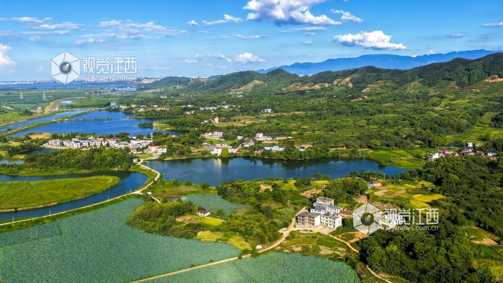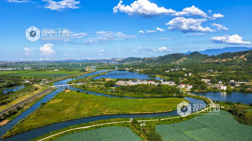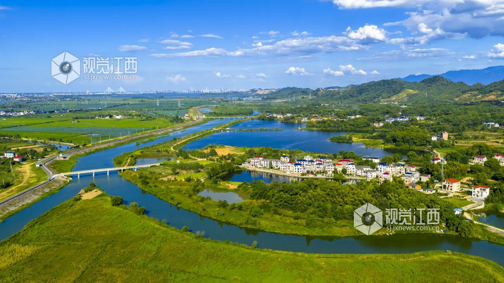 2025年8月15日,江西省九江市柴桑区新塘乡四华村,错落有致的村庄与河流、田园等构成一幅多姿多彩的田园画卷。