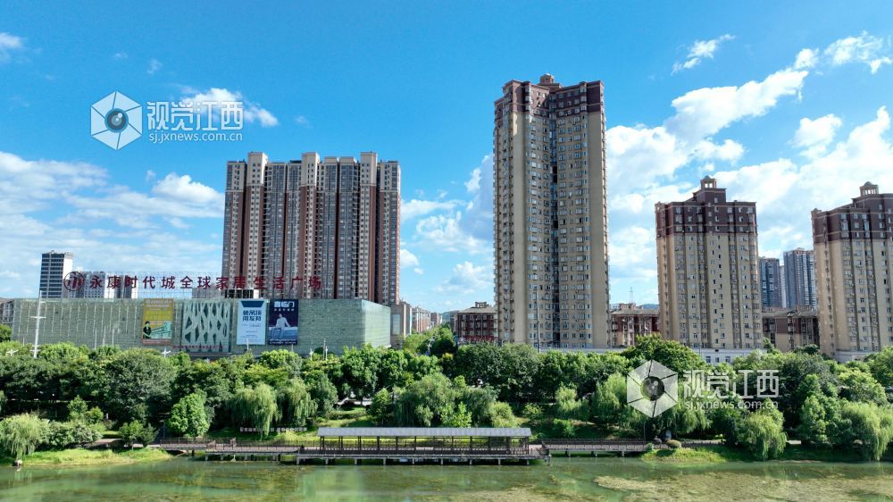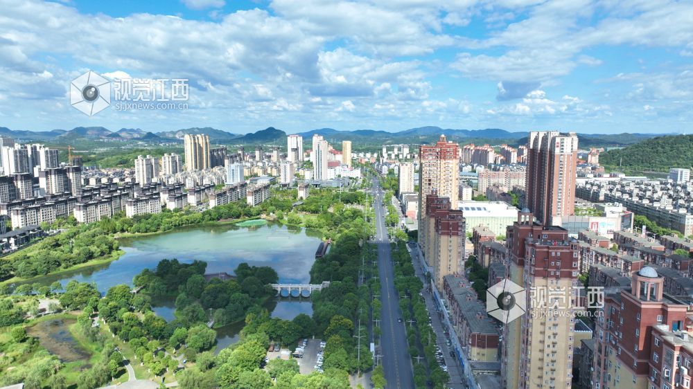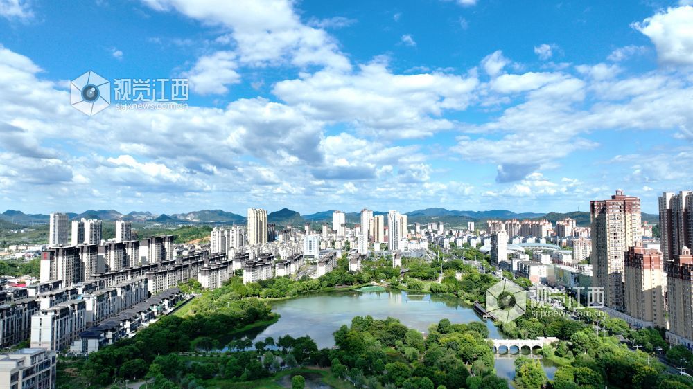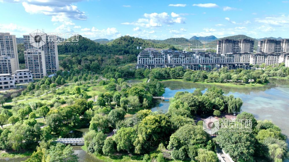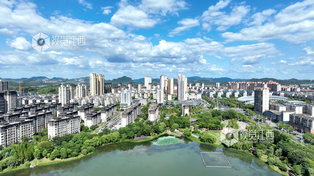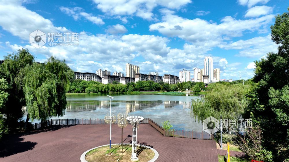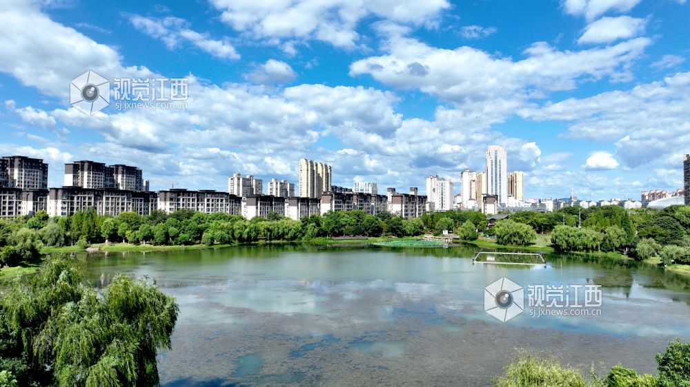 2025年8月15日,航拍江西省分宜县万年湖湿地公园美景。初秋时节,万年湖湿地公园内绿树成荫,在蓝天白云的映衬下,湿地内生机盎然,宛如春归画卷,成为当地一道亮丽的风景线。