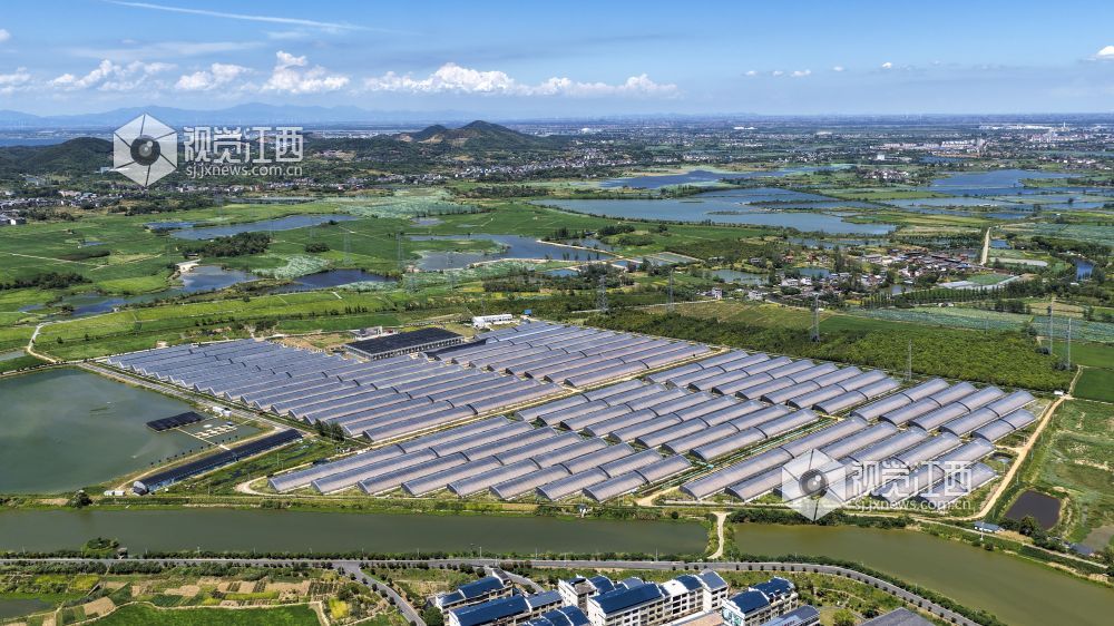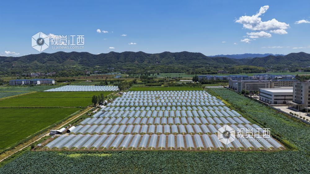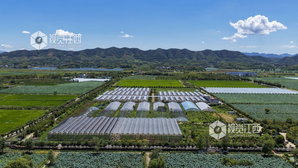 2025年8月19日,江西省瑞昌市赛湖农场,整齐的设施农业大棚与田园等相映成趣,构成美丽乡村画卷。