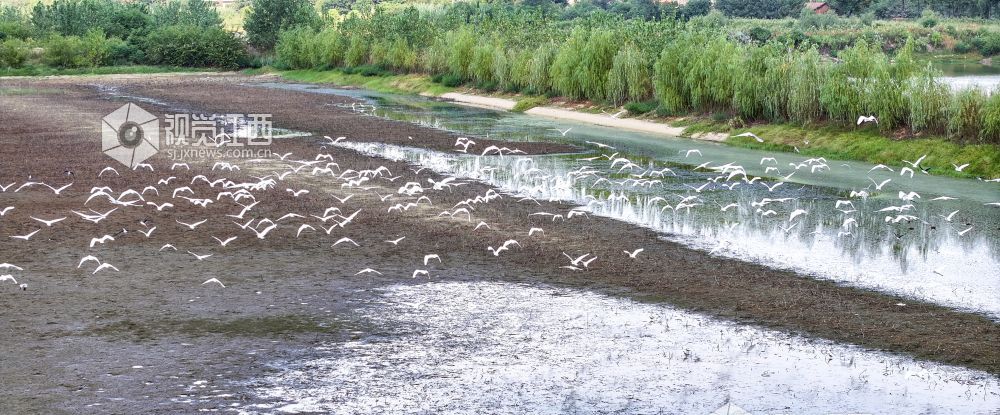 白鹭成群结队嬉戏于滩涂浅泽,灵动身姿与碧水绿树交织成一幅生态美卷,尽显自然之韵。
