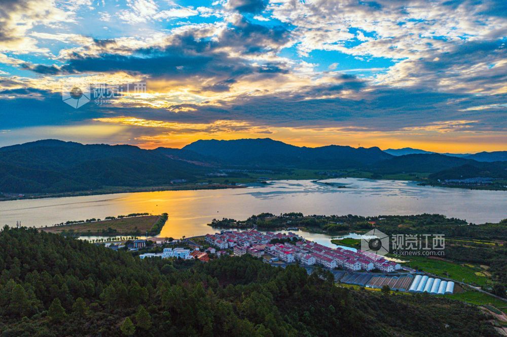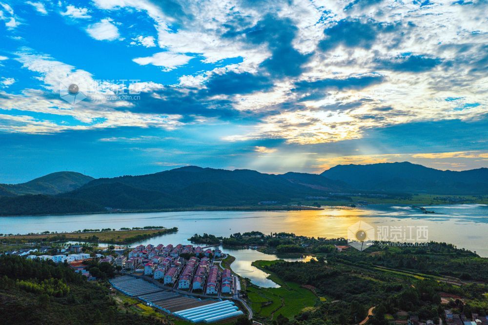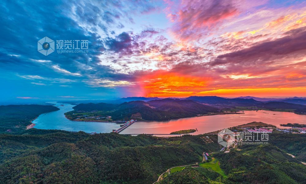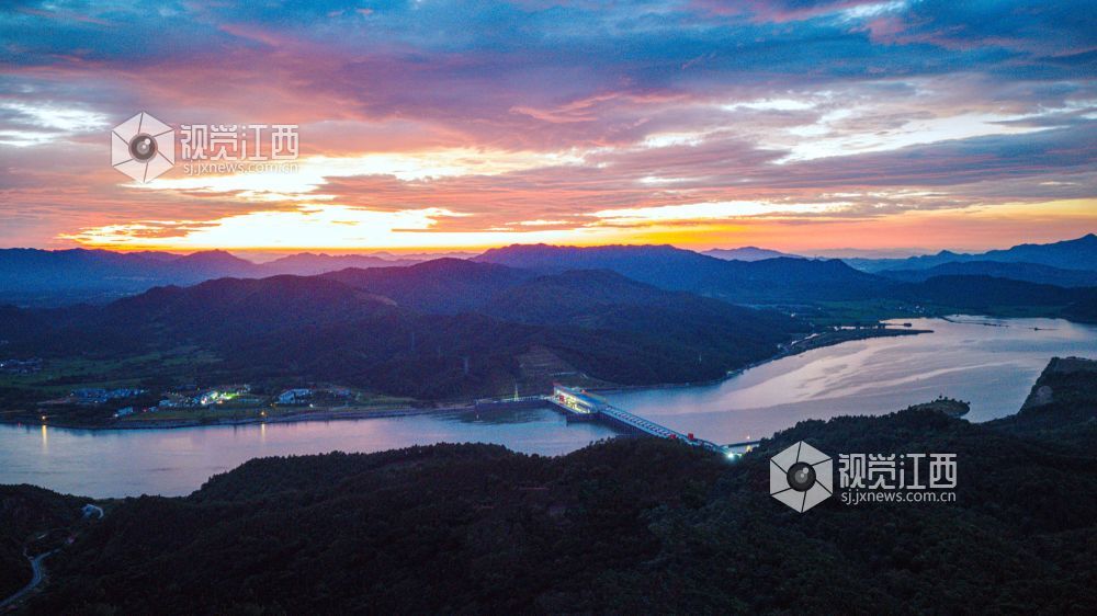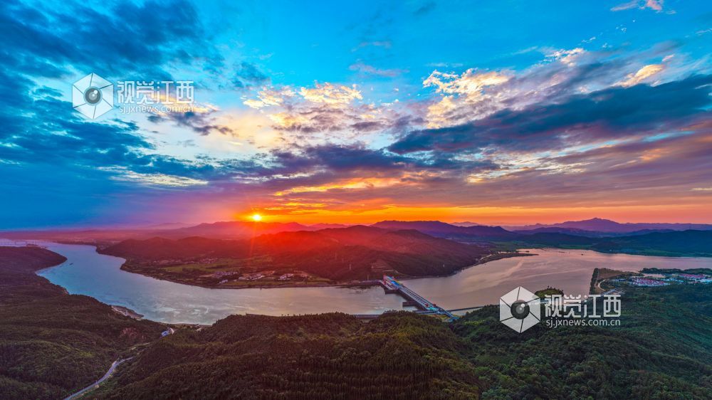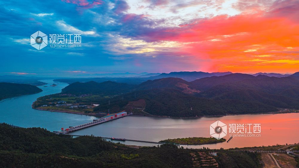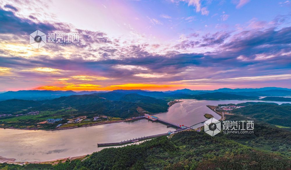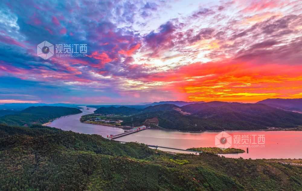 8月24日,江西省吉安市峡江县玉峡湖上空迎来绝美朝霞,橙红霞光漫洒湖面,与峡江水利枢纽工程的雄姿、蒋沙渔村的宜居风貌相映成趣,勾勒出一幅动静相宜的生态美景图。