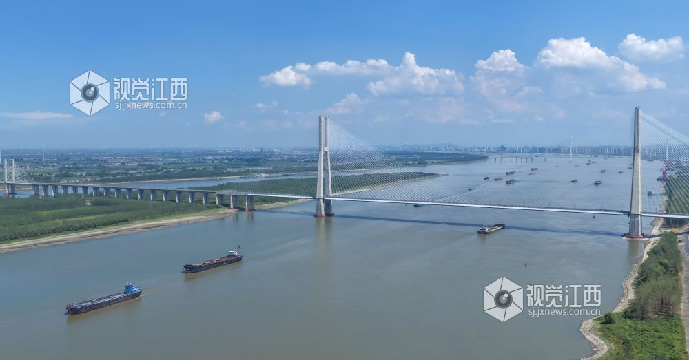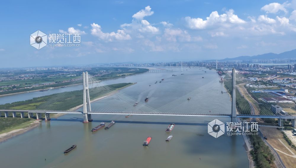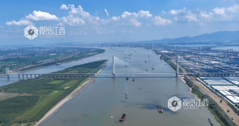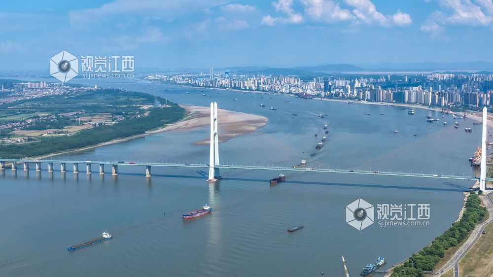 2025年8月29日,江西省九江经济技术开发区鳊鱼洲长江大桥附近江面上,各类船舶往来穿梭,有序航行。