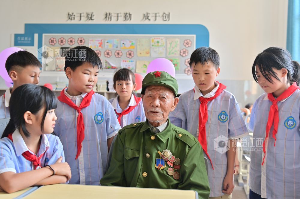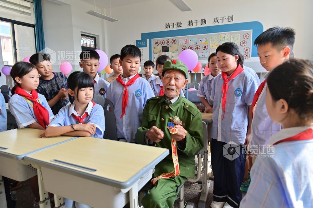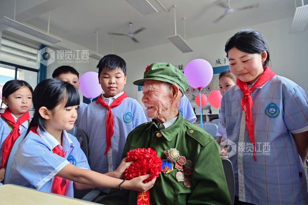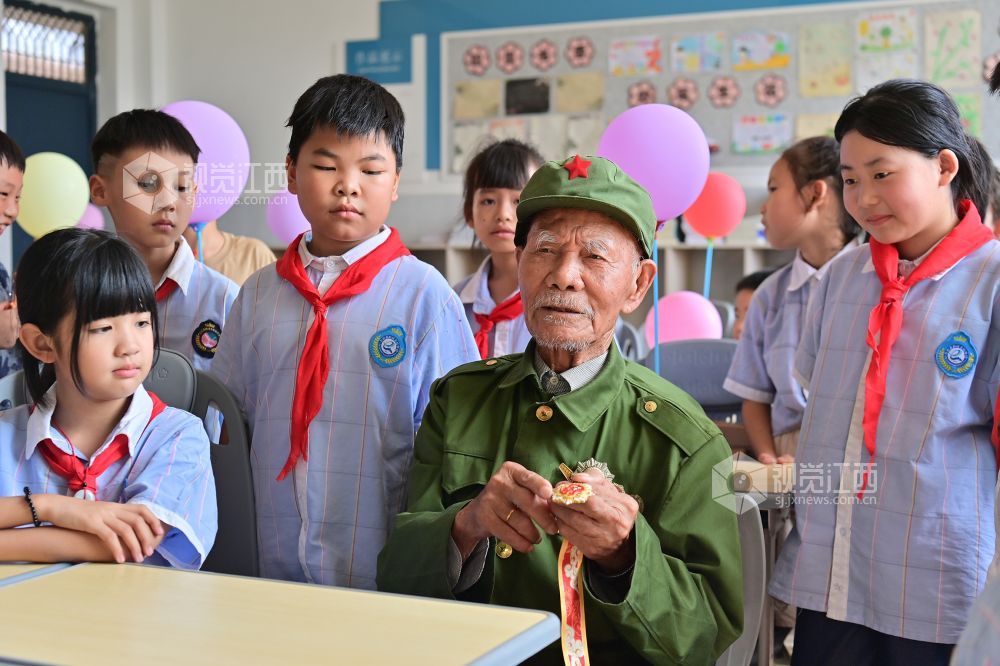 2025年9月2日,江西省万载县鹅峰乡实验学校在新学期开展抗战胜利纪念活动,邀请亲历抗日战争的104岁抗战老兵徐桃生给孩子们讲述抗战往事并给抗战英雄佩戴抗战“胜利花”。